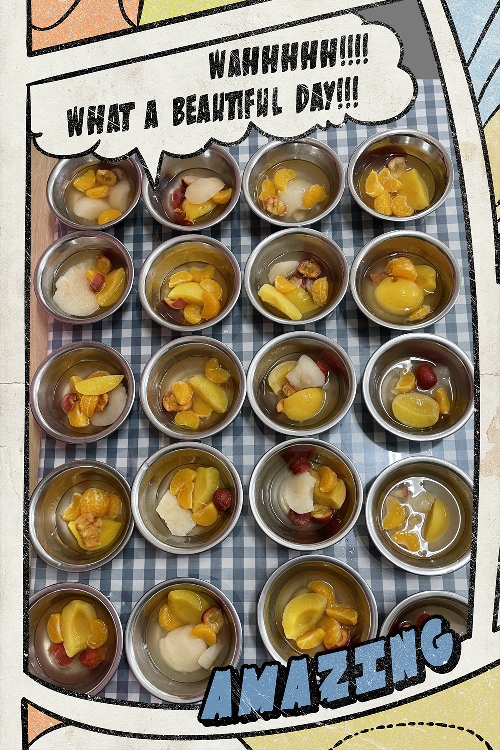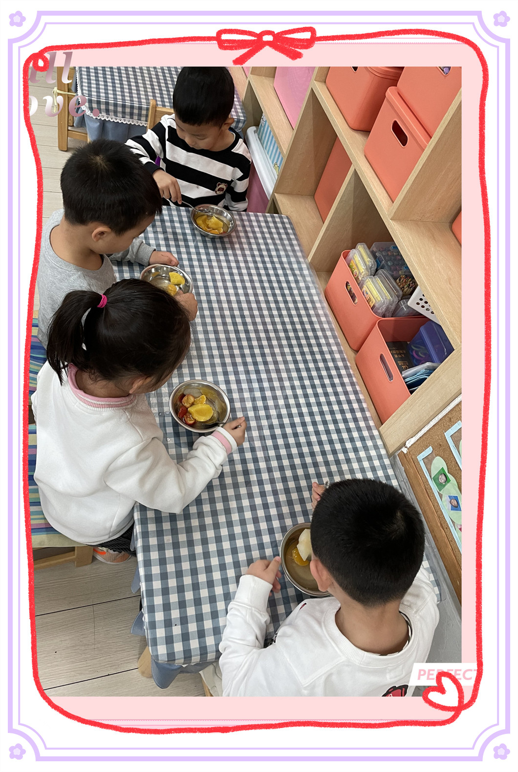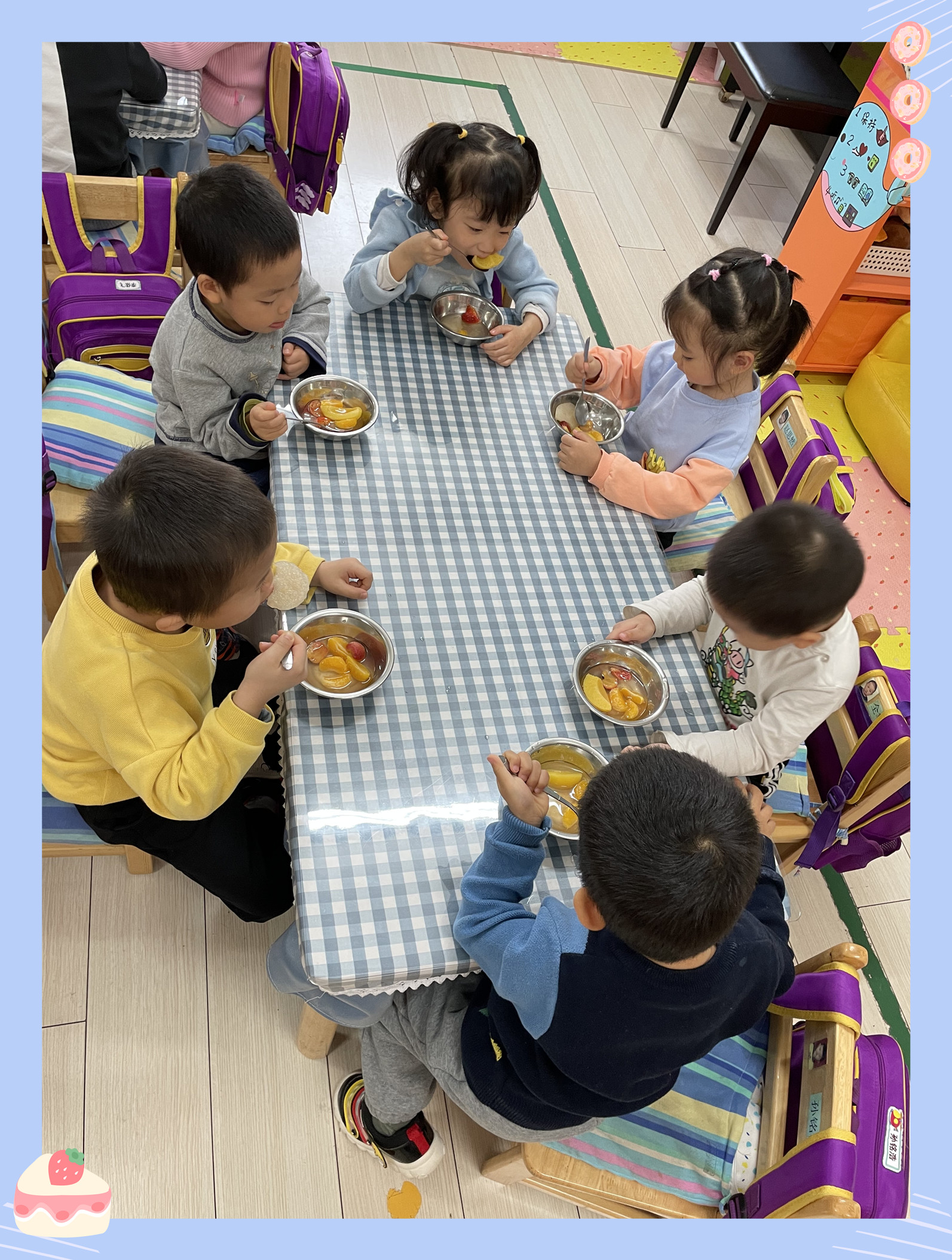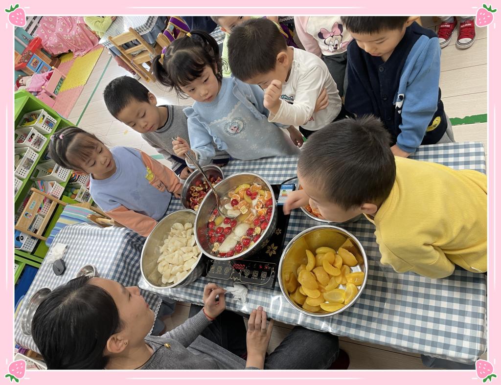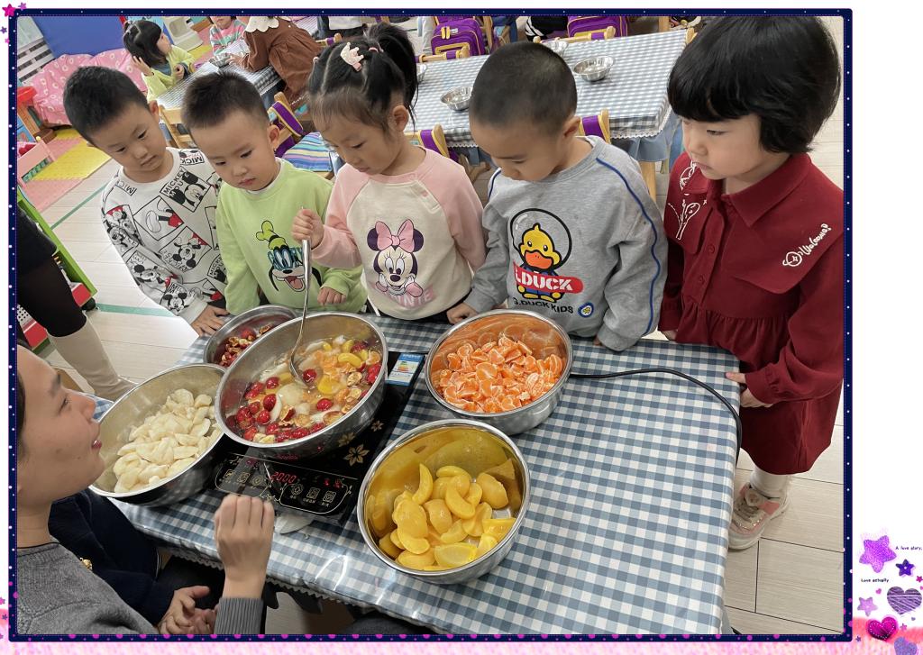 美味的水果罐头终于煮好了,小朋友们已经开始迫不及待了。