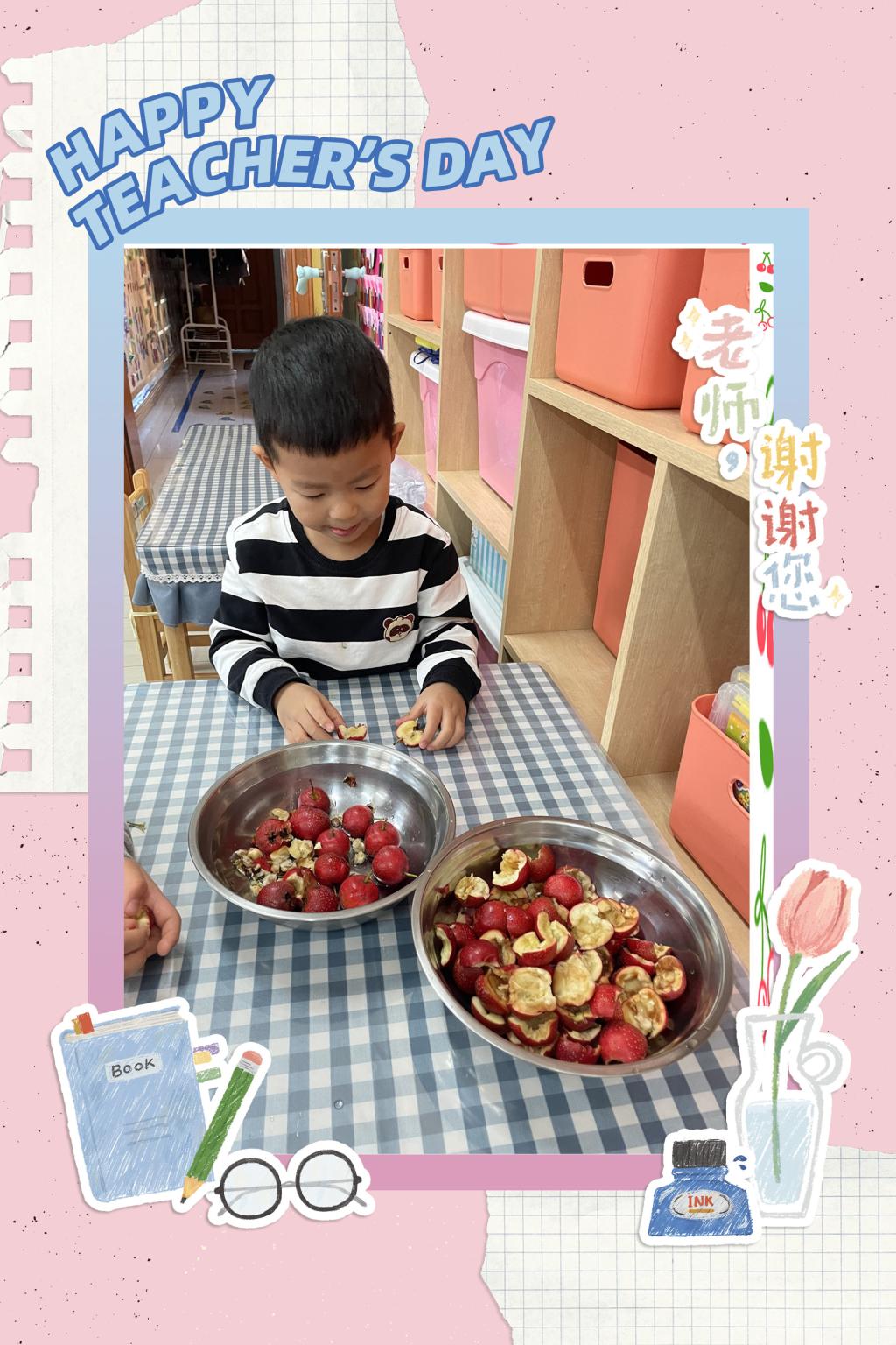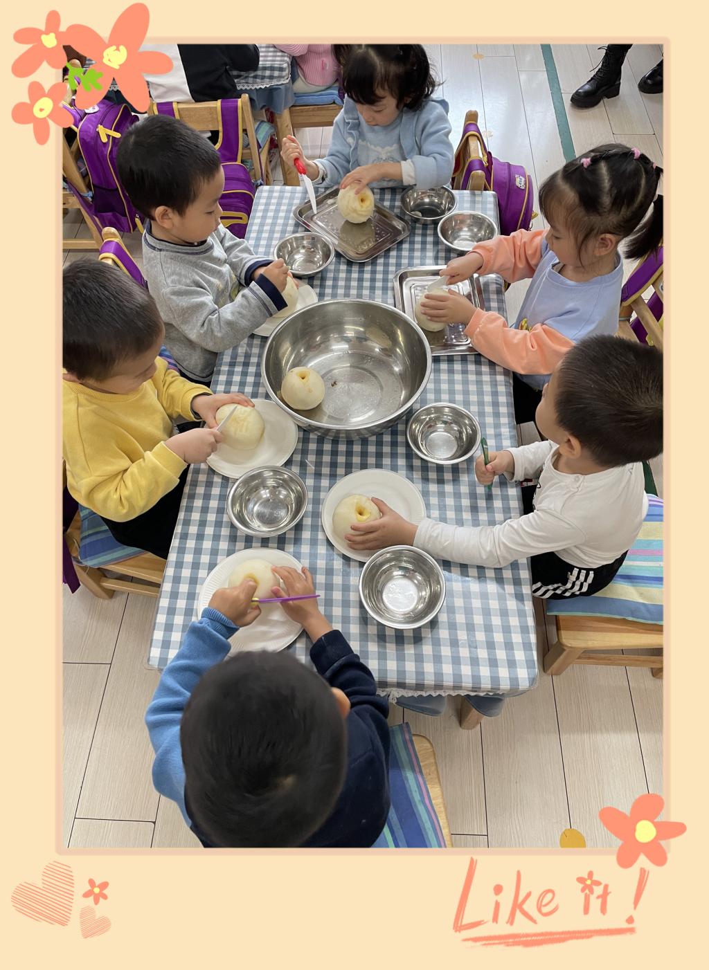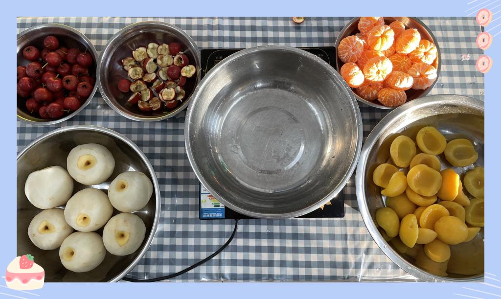现在我们材料都准备充足了,看小朋友们的工作做的都么细致呀!小水果们都乖乖的等待着下锅洗澡。