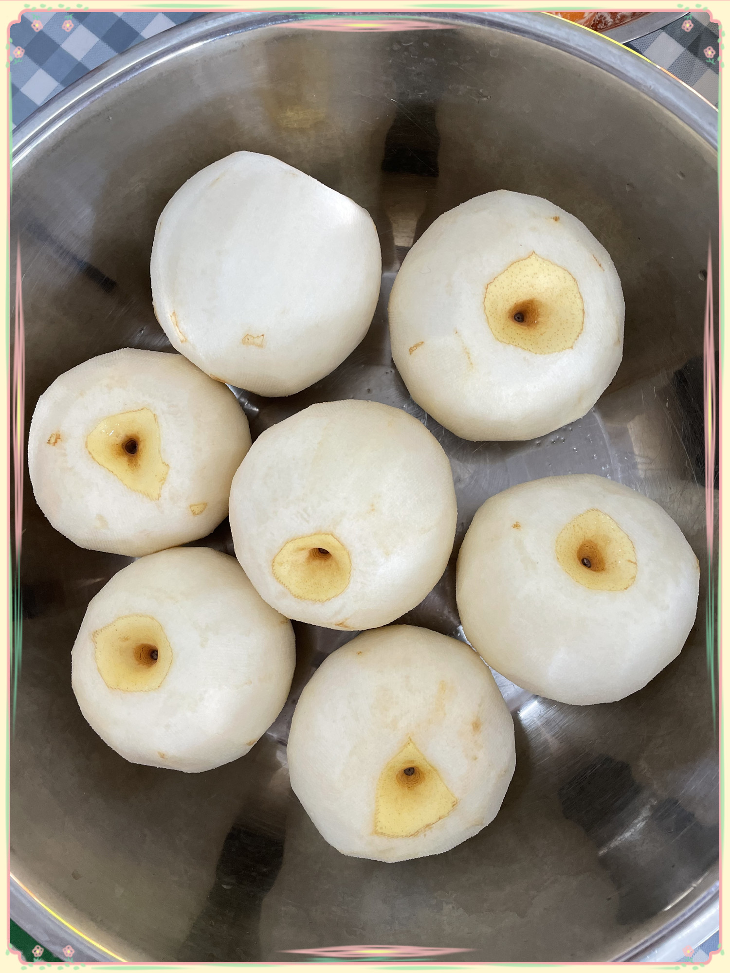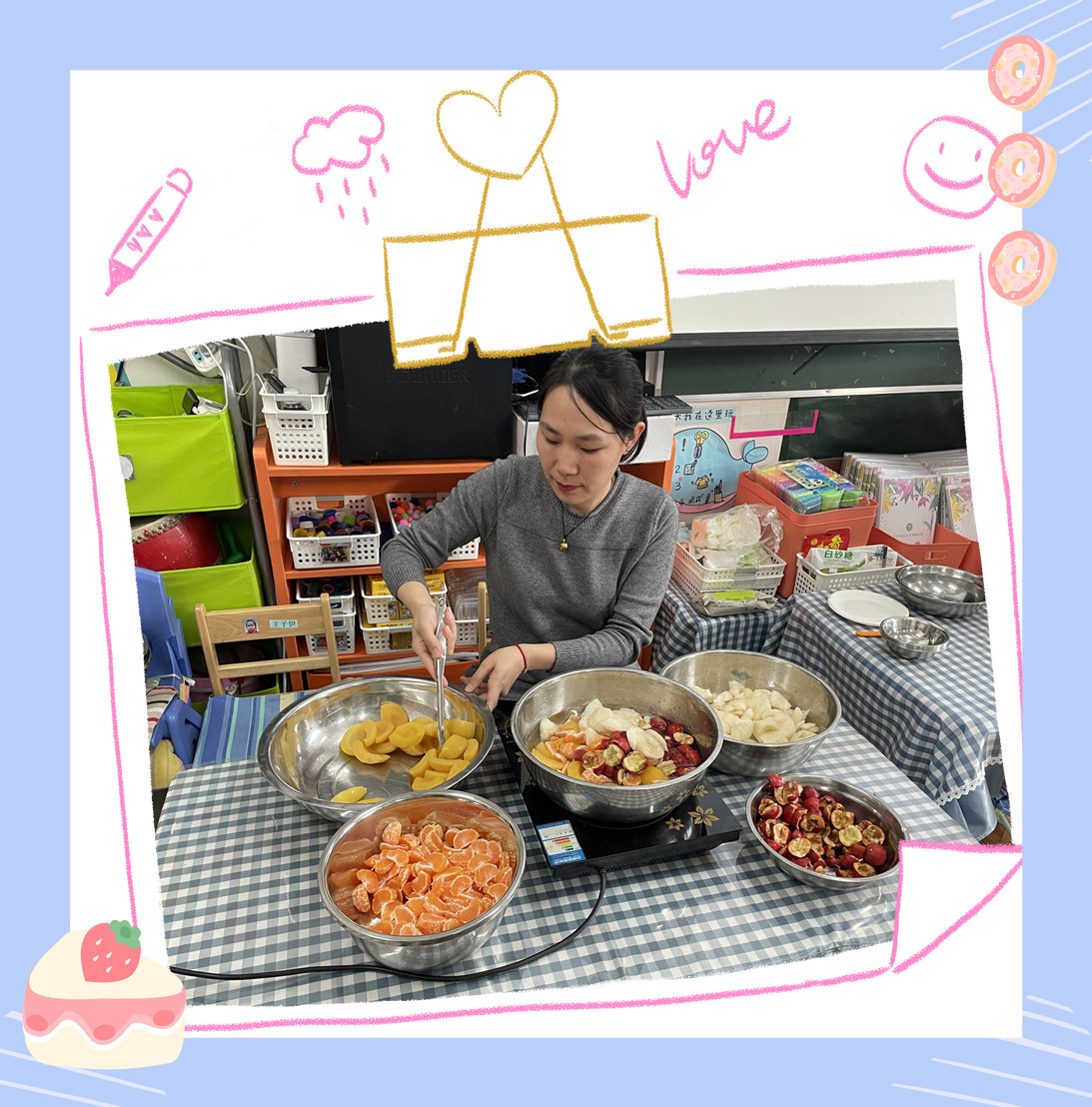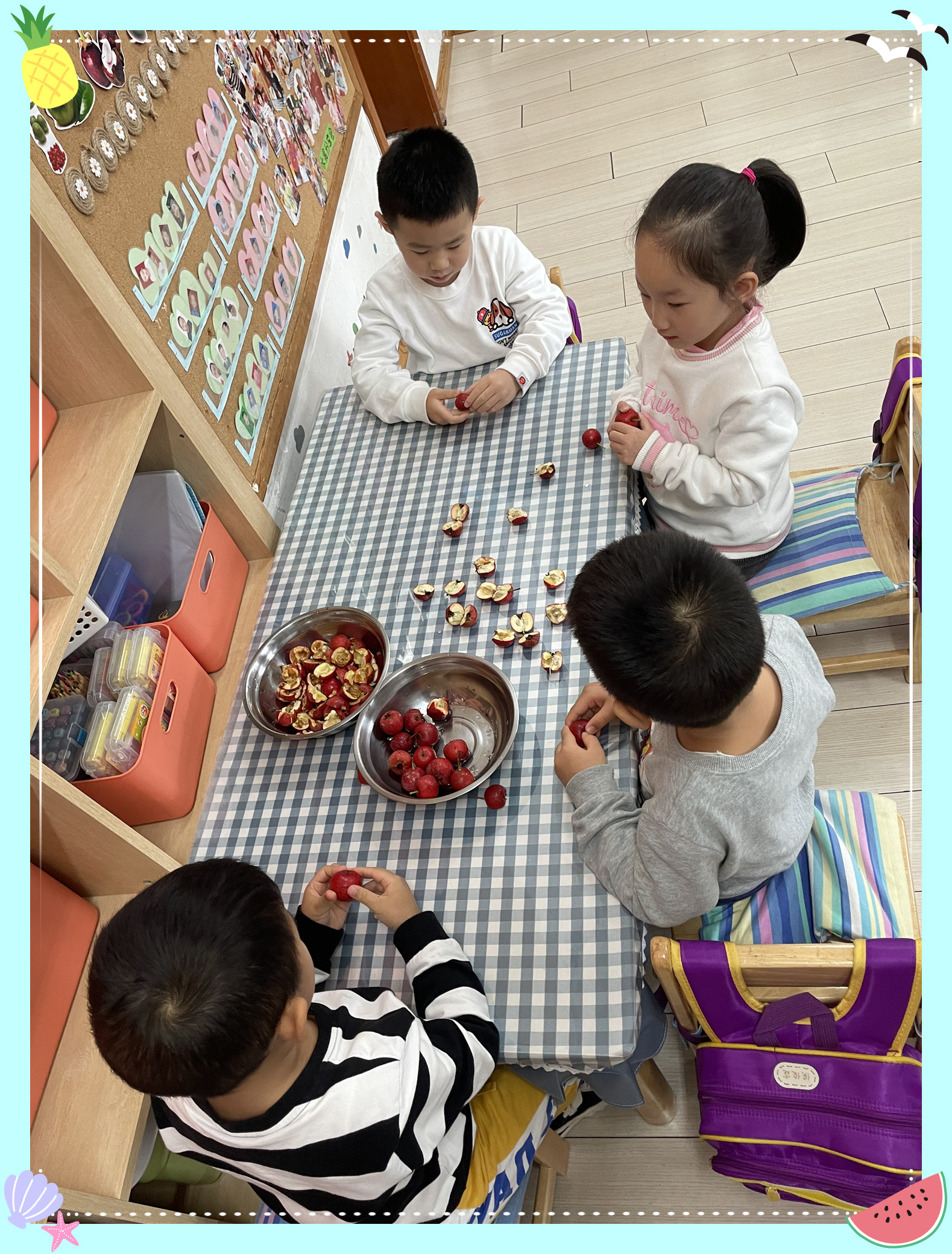 现在我们材料都准备充足了,看小朋友们的工作做的都么细致呀!小水果们都乖乖的等待着下锅洗澡。