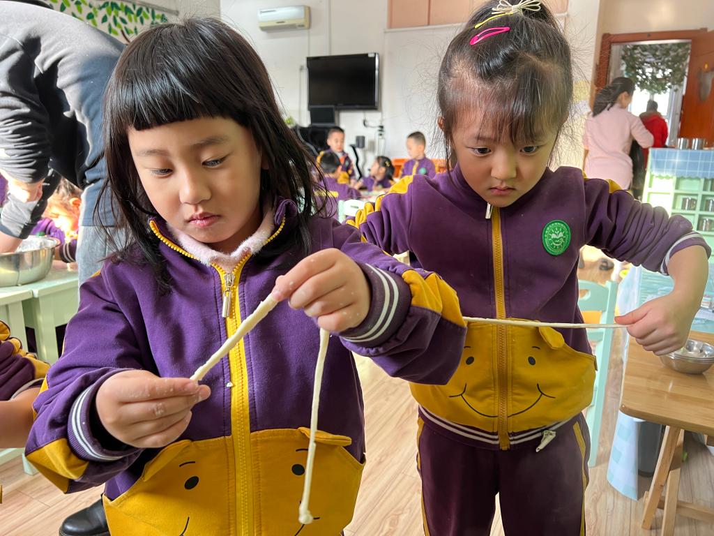 孩子们在参与劳动的过程中,了解到每一种食物的制作都需要很多道工序,都是十分不容易的。让孩 子们养成了珍惜粮食、不浪费的好习惯。这一天,我们班里还迎来了一群可爱的老师来班里做客,我们为老师也精心准备了抻面请老师品尝哦!