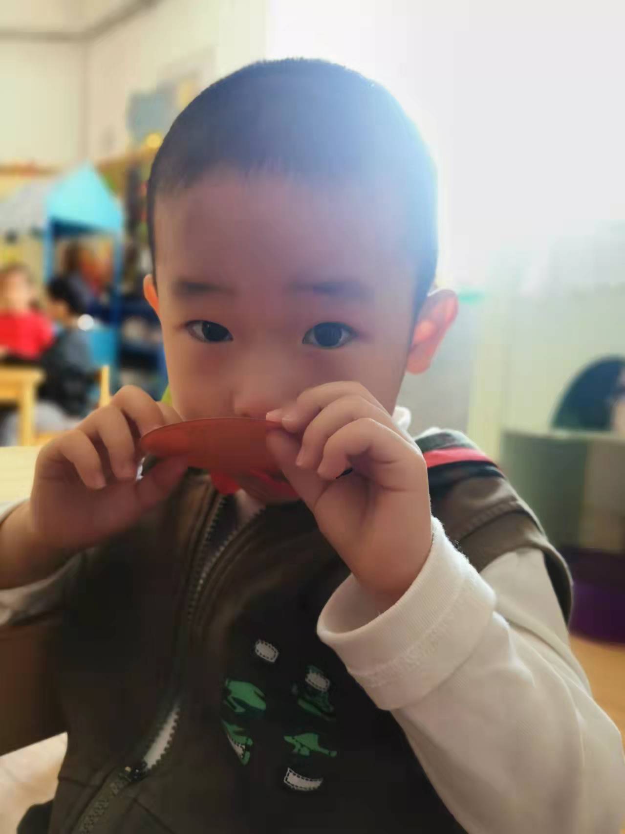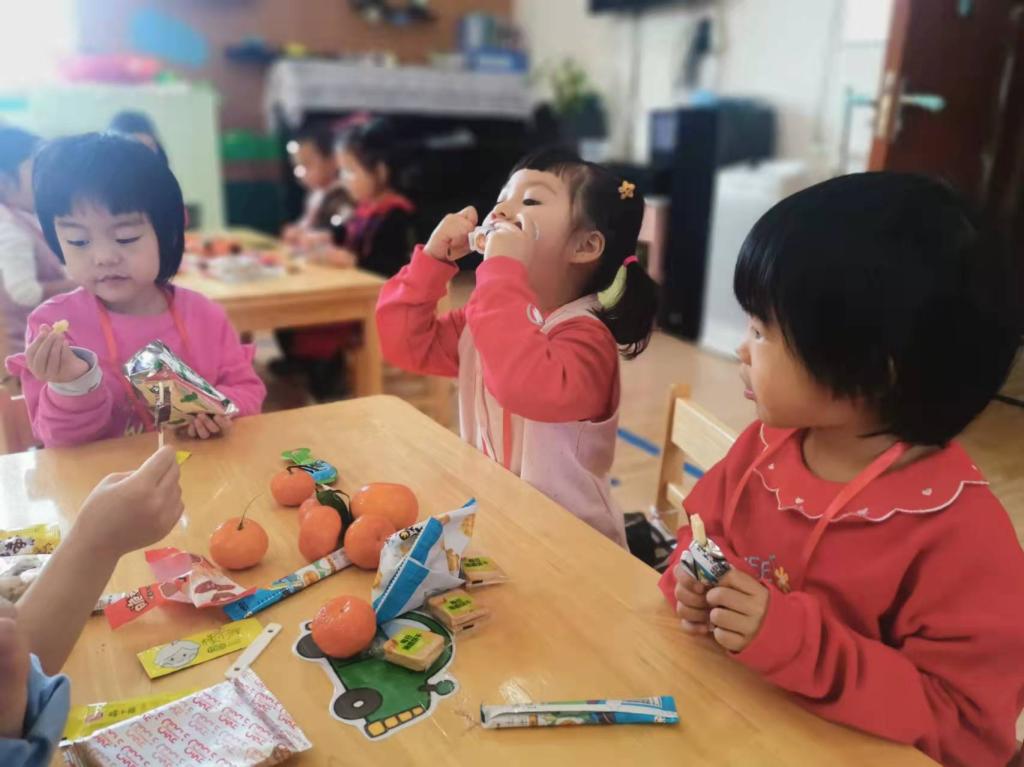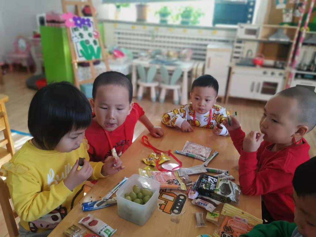 宝贝们纷纷拿出自己挑选的健康食物与同伴分享,带来的美食真是太丰富了,水果、海苔、奶酪棒、小饼干...宝贝们喜欢的食物应有尽有,每位宝贝的小手里都捧着各种各样其他小朋友分享的食物。