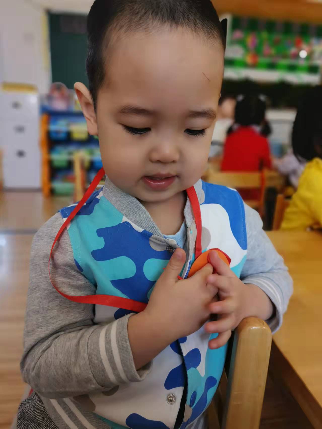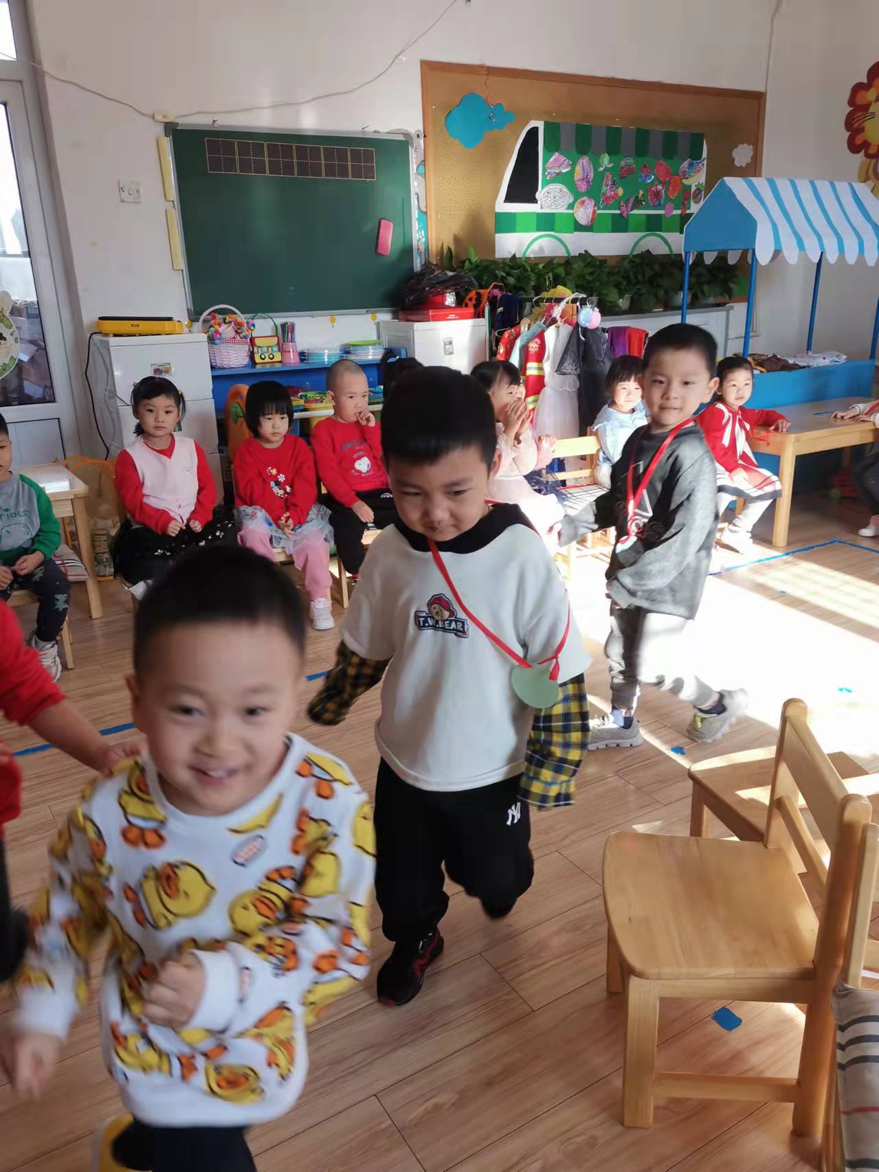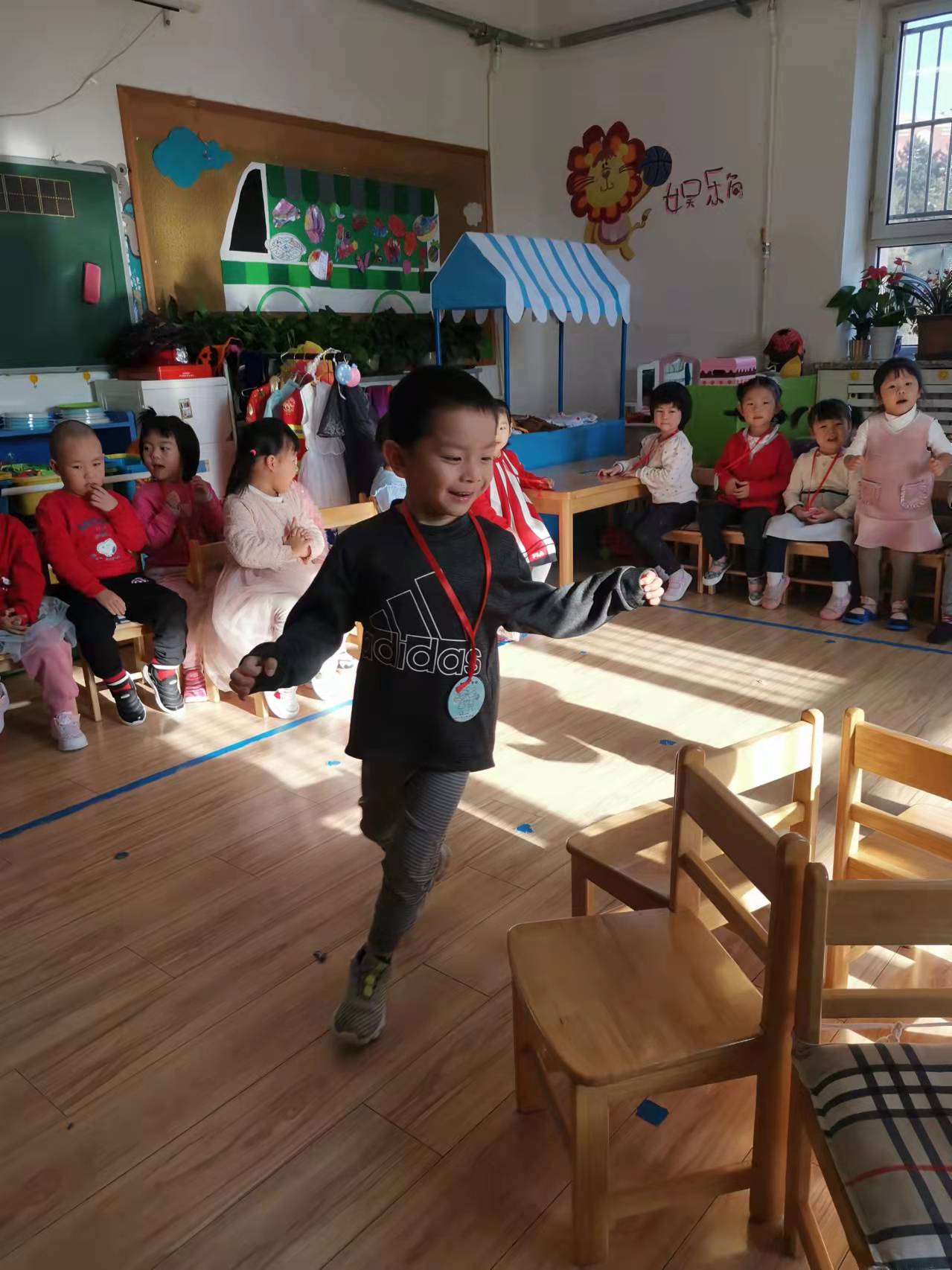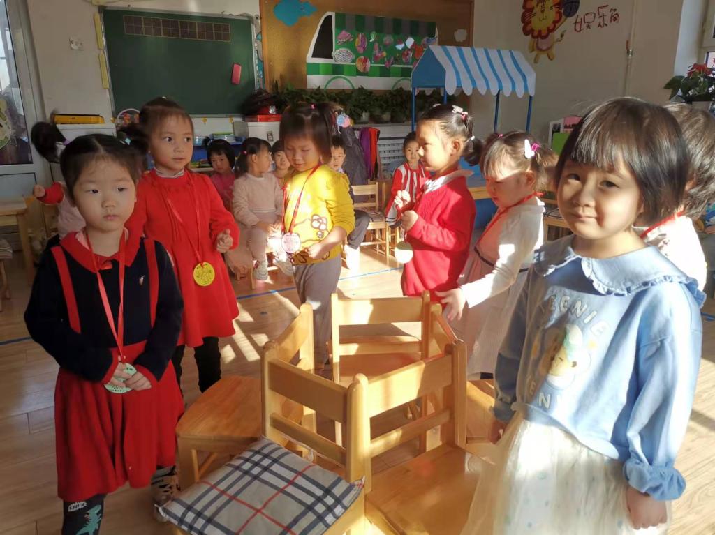 音乐响起,宝贝们立刻跑了起来,生怕掉队;音乐停止,宝贝们立刻寻找距离自己最近的椅子快速坐下,没有抢到的宝贝也和其他小朋友一样享受游戏的过程。