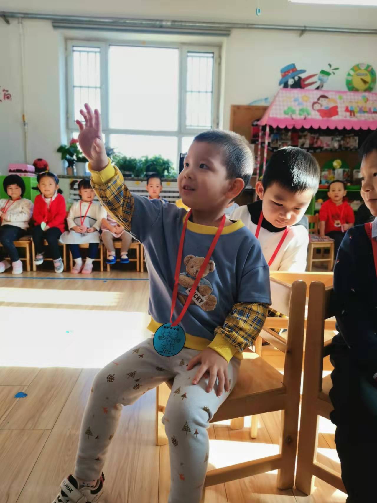 宝贝们将奖牌挂在脖子子上、捧在怀里,爱不释手。