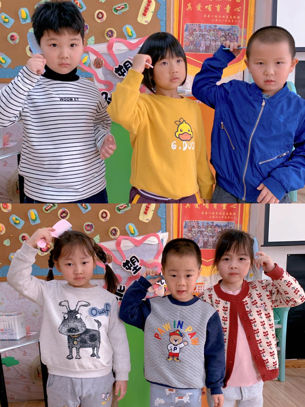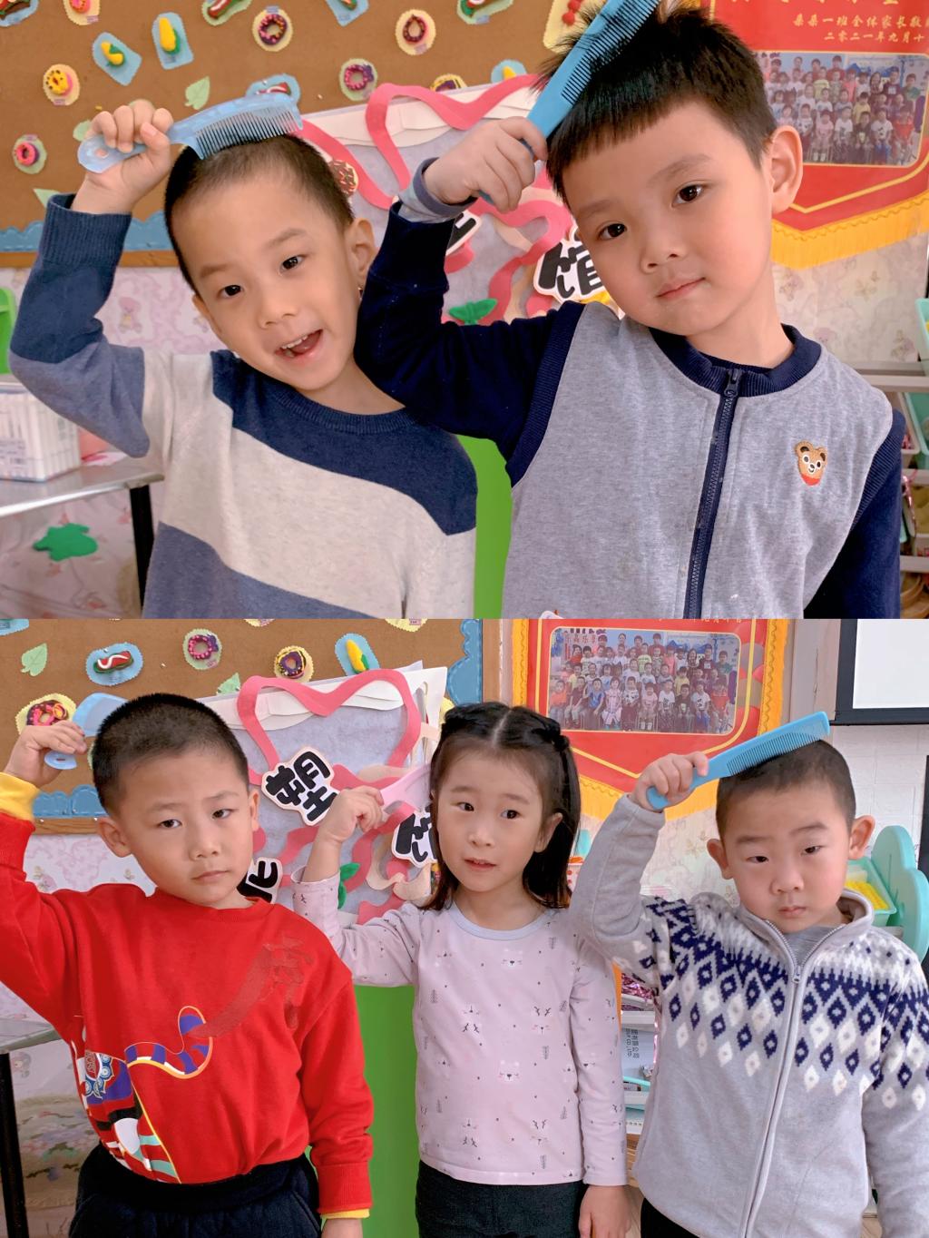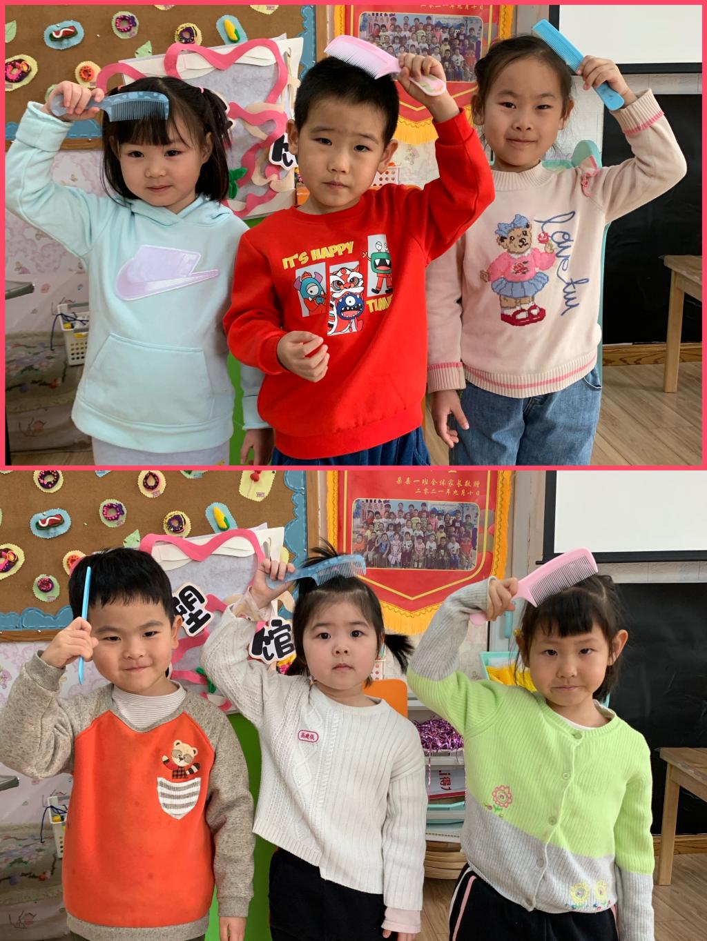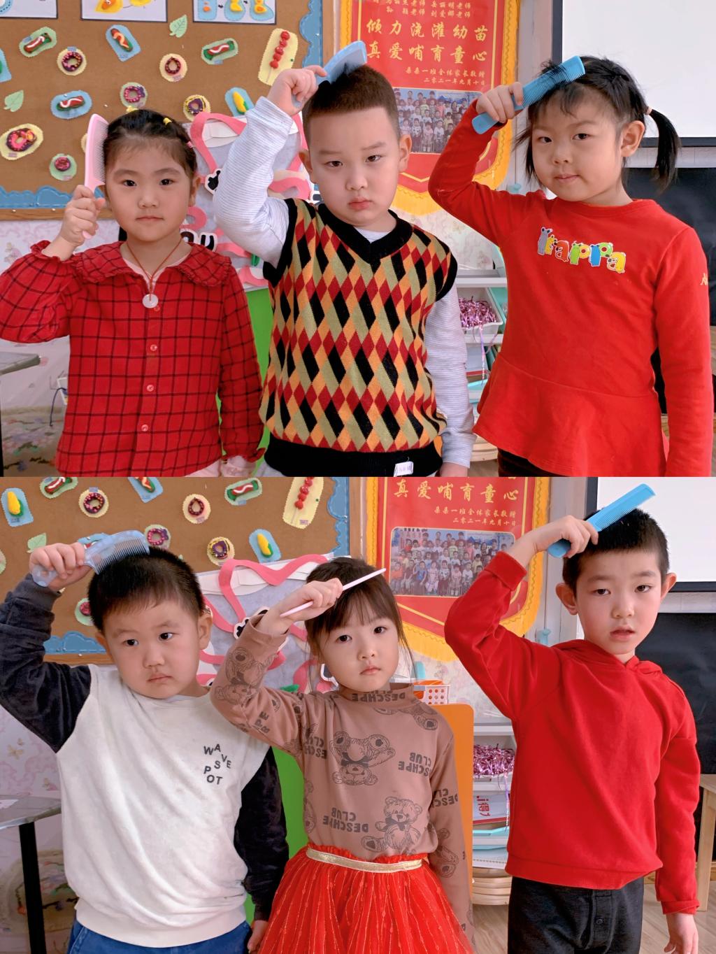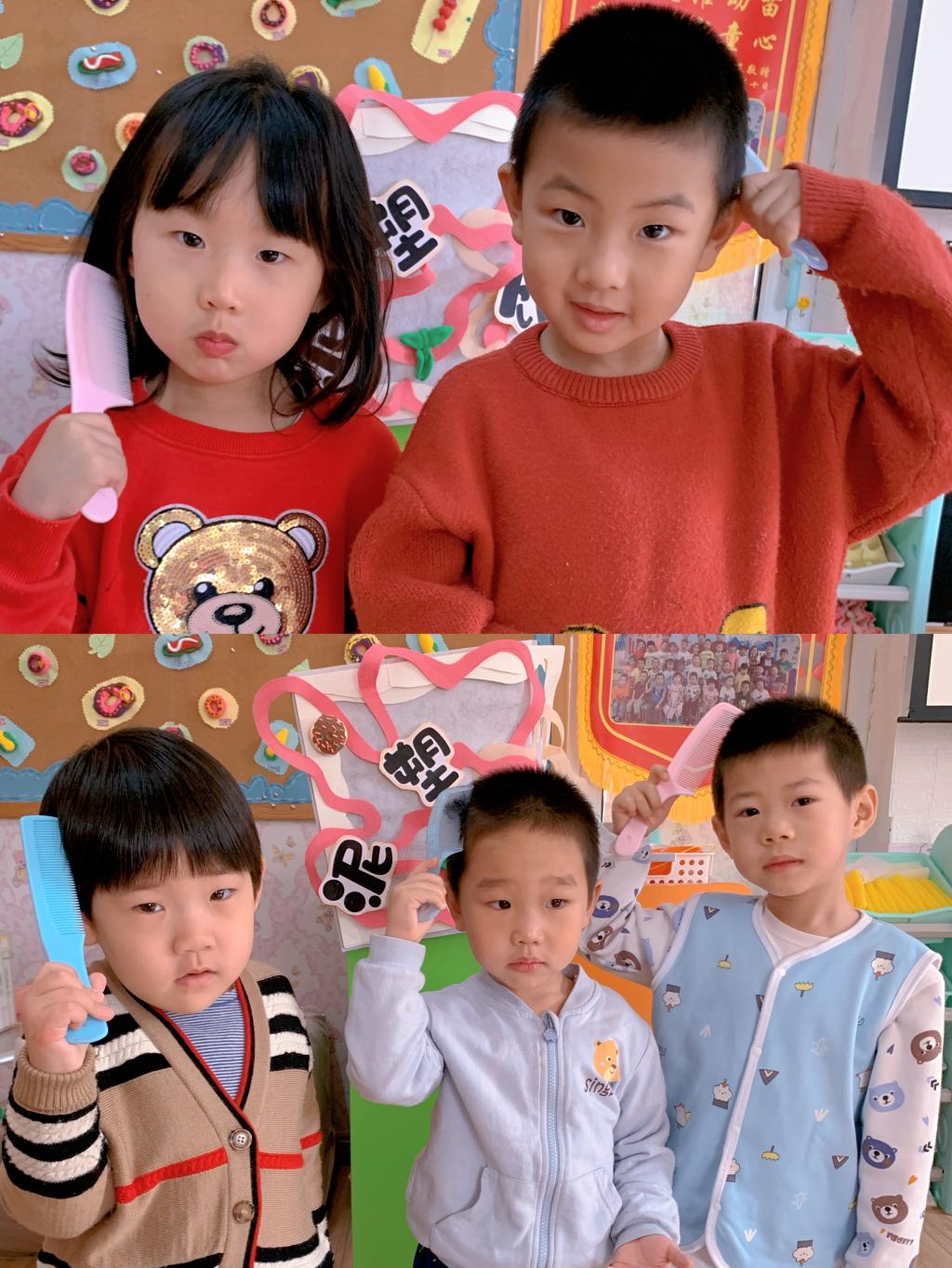 二月二这一天儿童理发叫剃“喜头”。借龙抬头之吉时,保佑孩童健康成长。朵朵一班的宝贝们用木梳梳理着自己的头发,寓意在新的一年茁壮成长、快乐无忧。