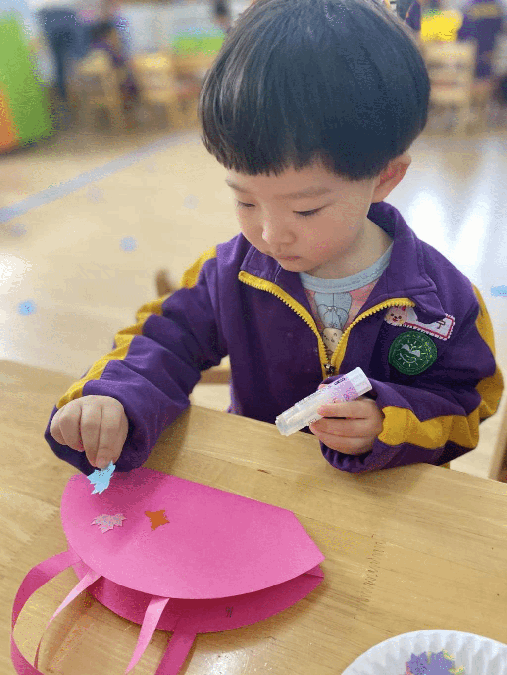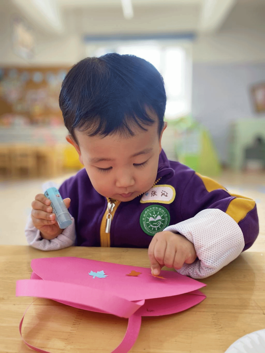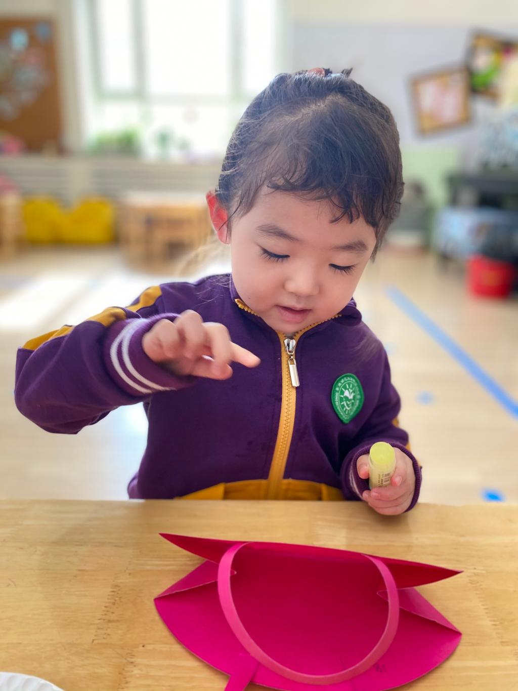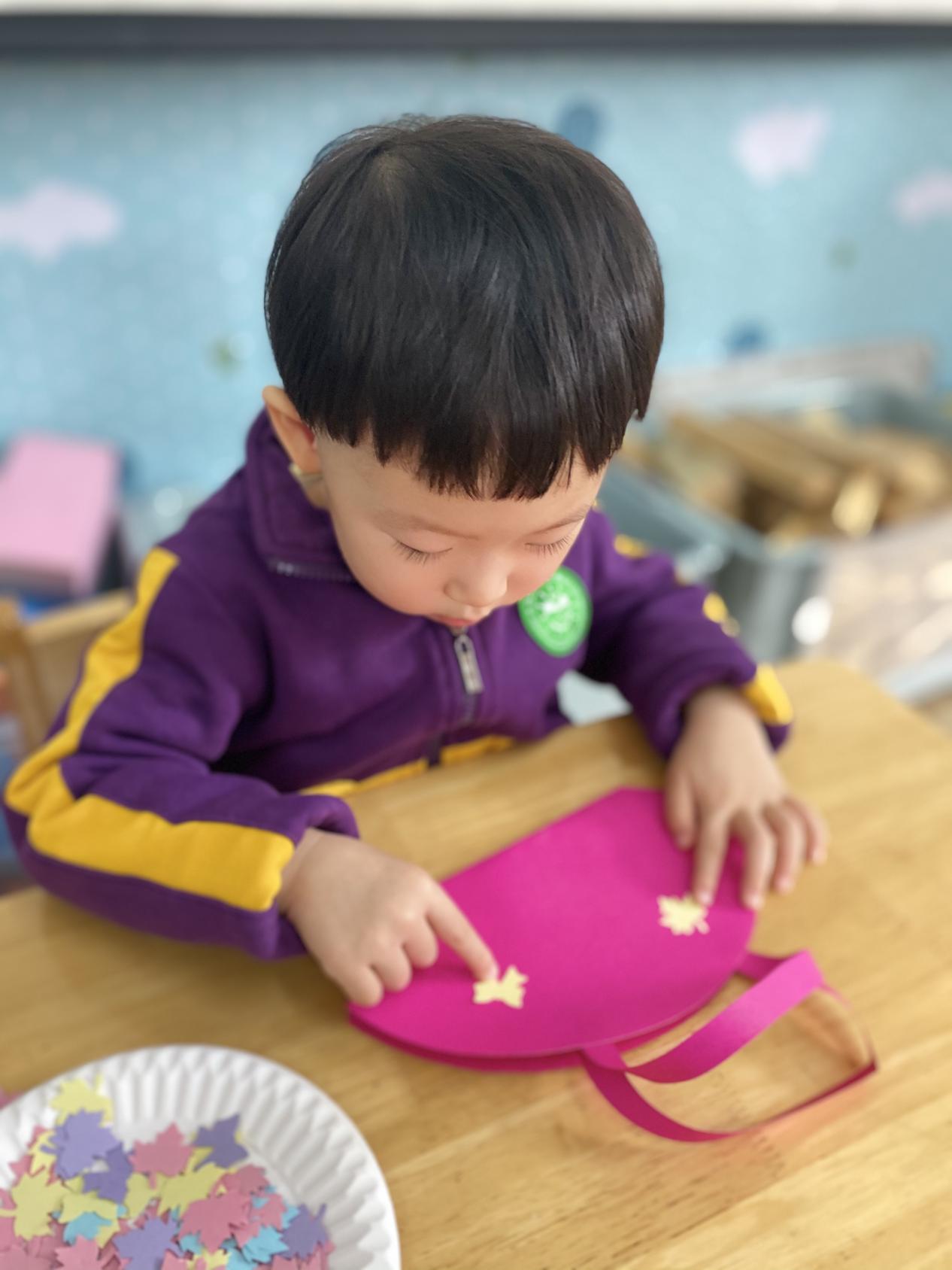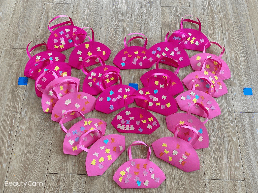 瞧,宝贝们那专注的眼神,稚嫩的小手灵活地粘贴,制作出一个个精美的手工小包,无不表达着他们对心中“女神”们真挚的感恩之情。
