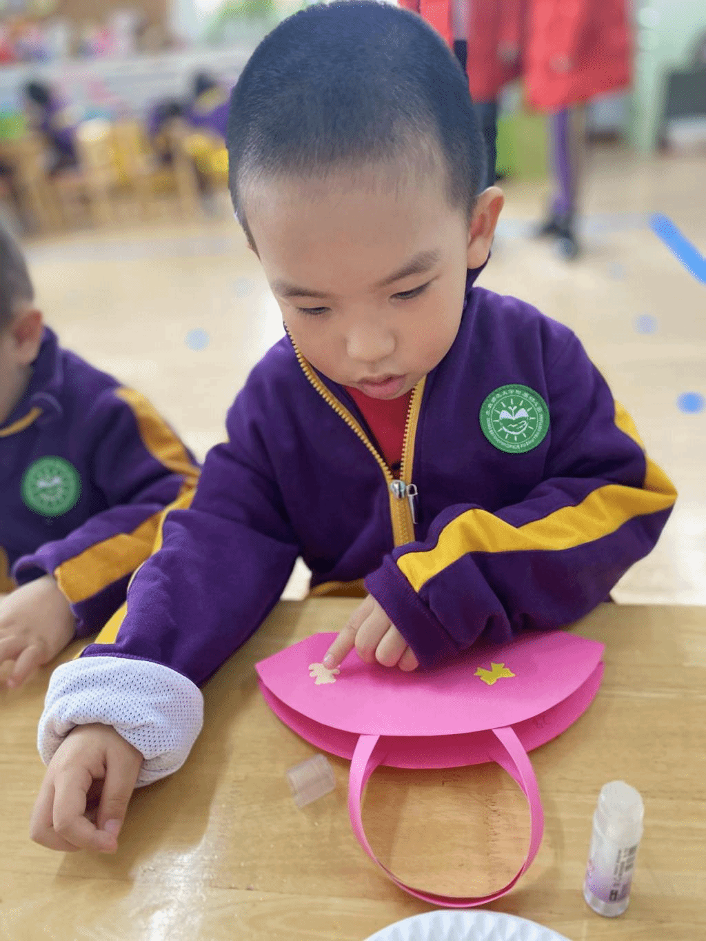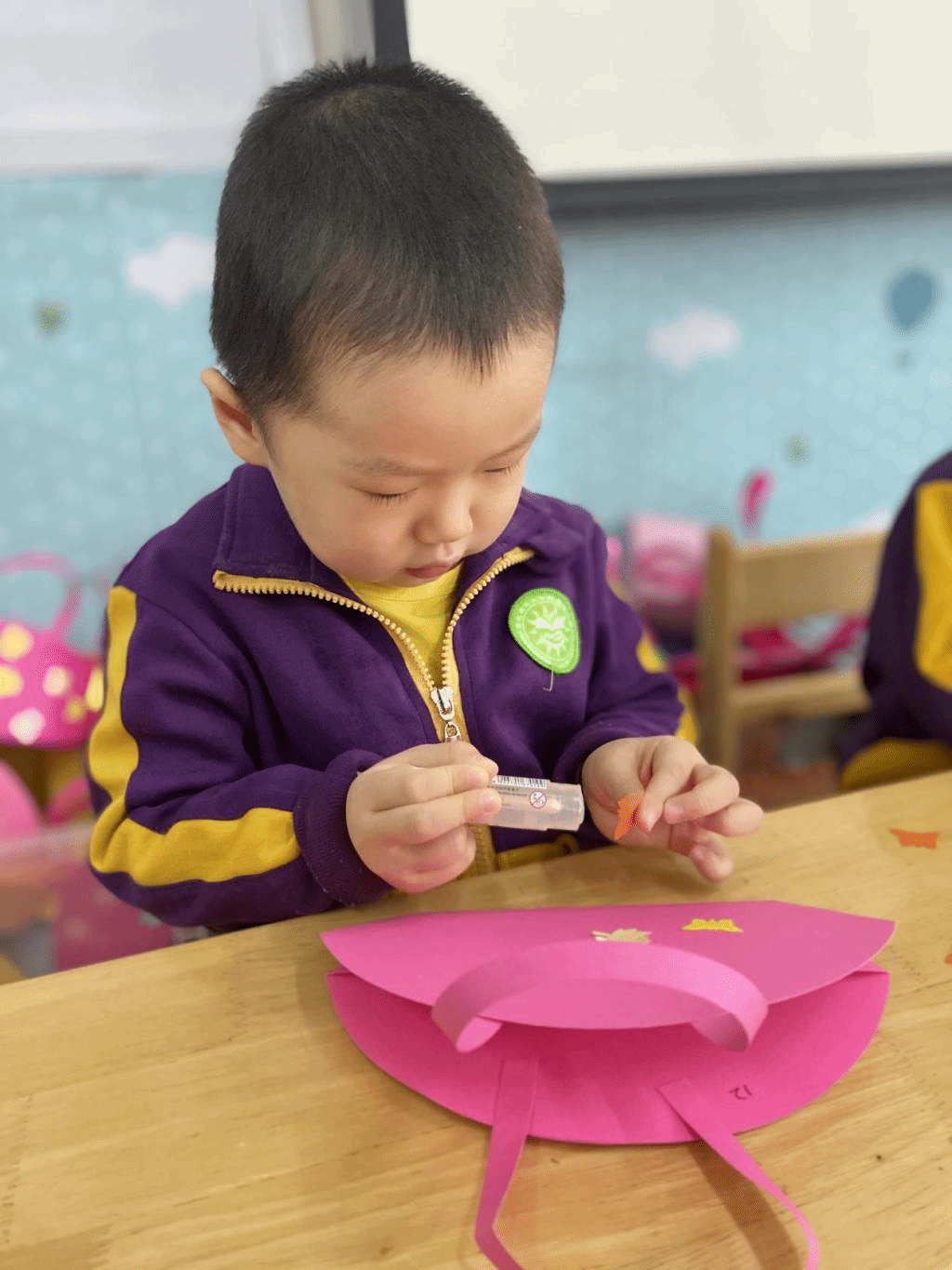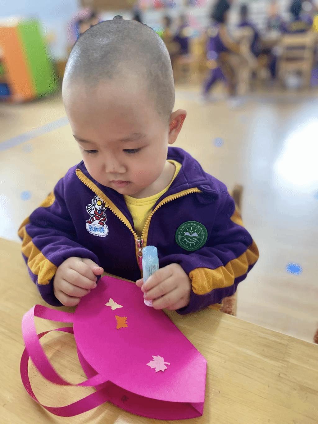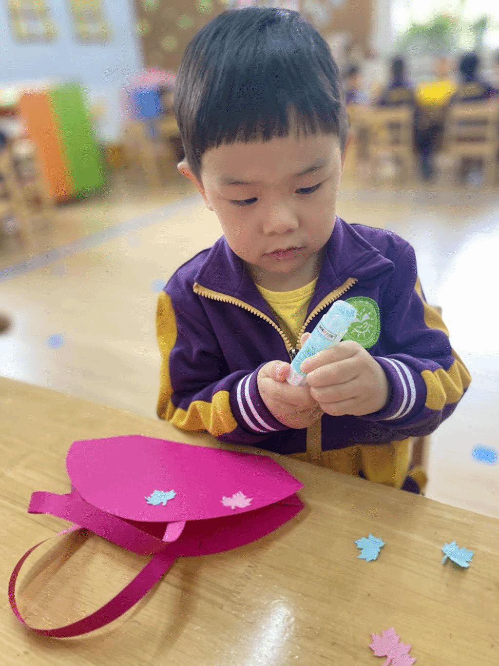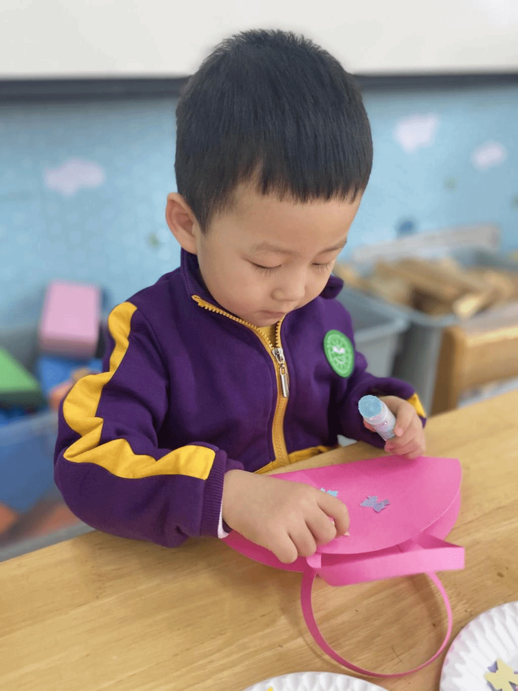 瞧,宝贝们那专注的眼神,稚嫩的小手灵活地粘贴,制作出一个个精美的手工小包,无不表达着他们对心中“女神”们真挚的感恩之情。