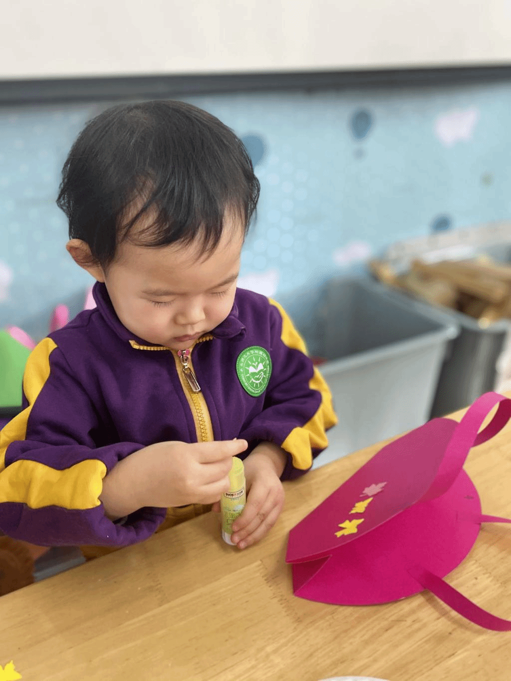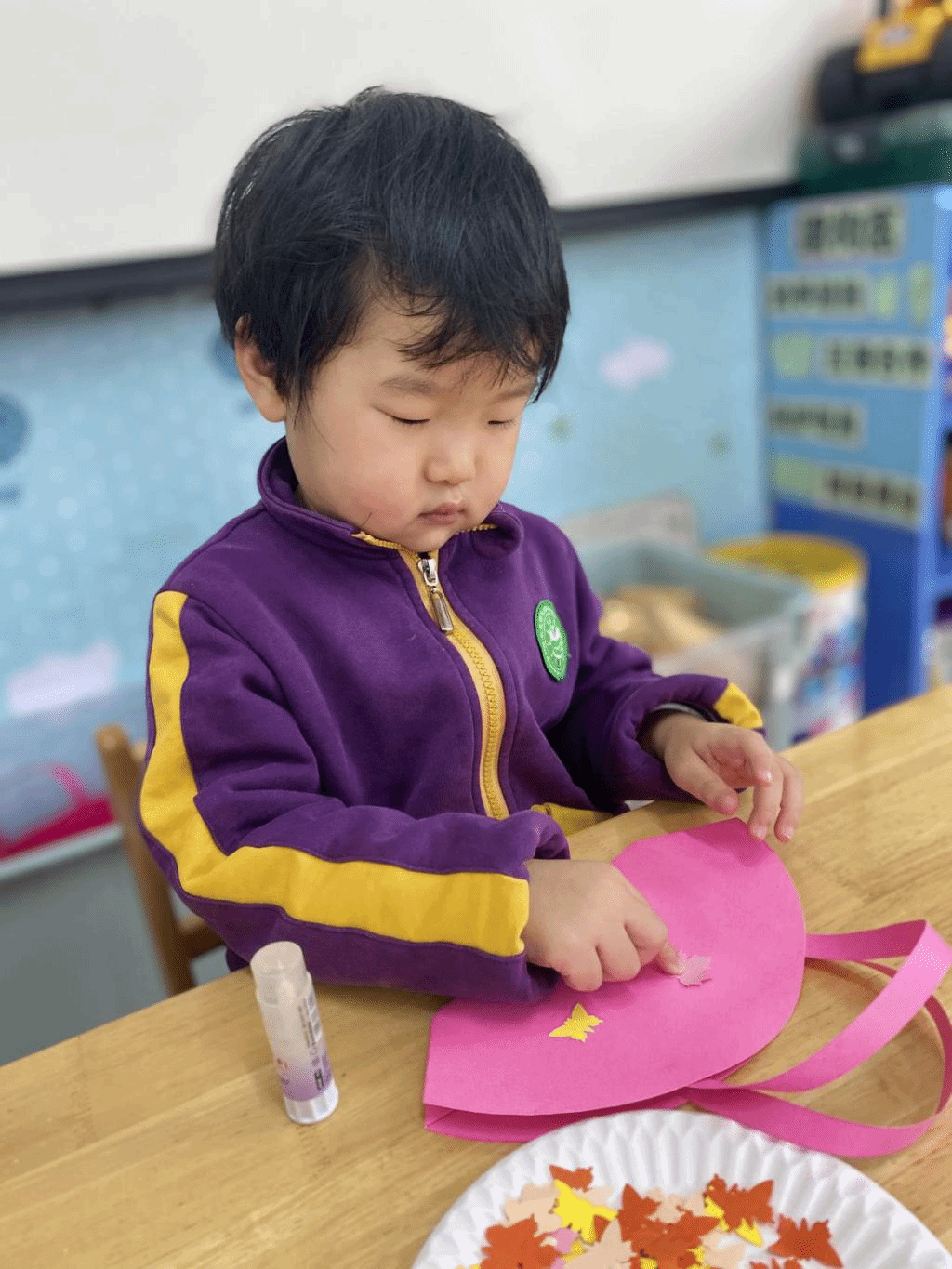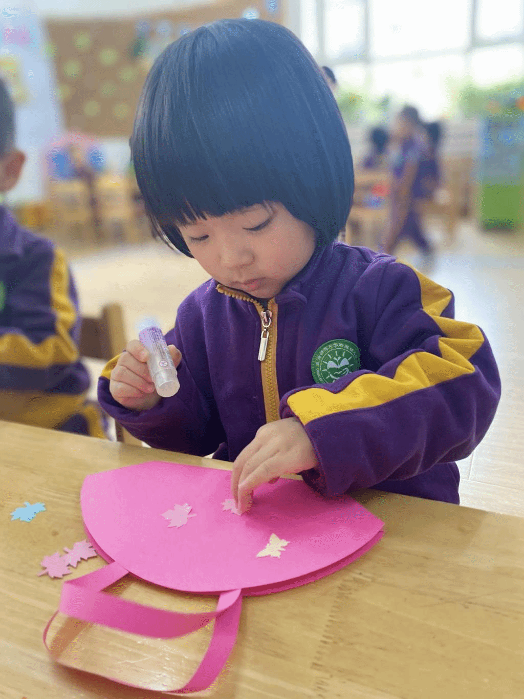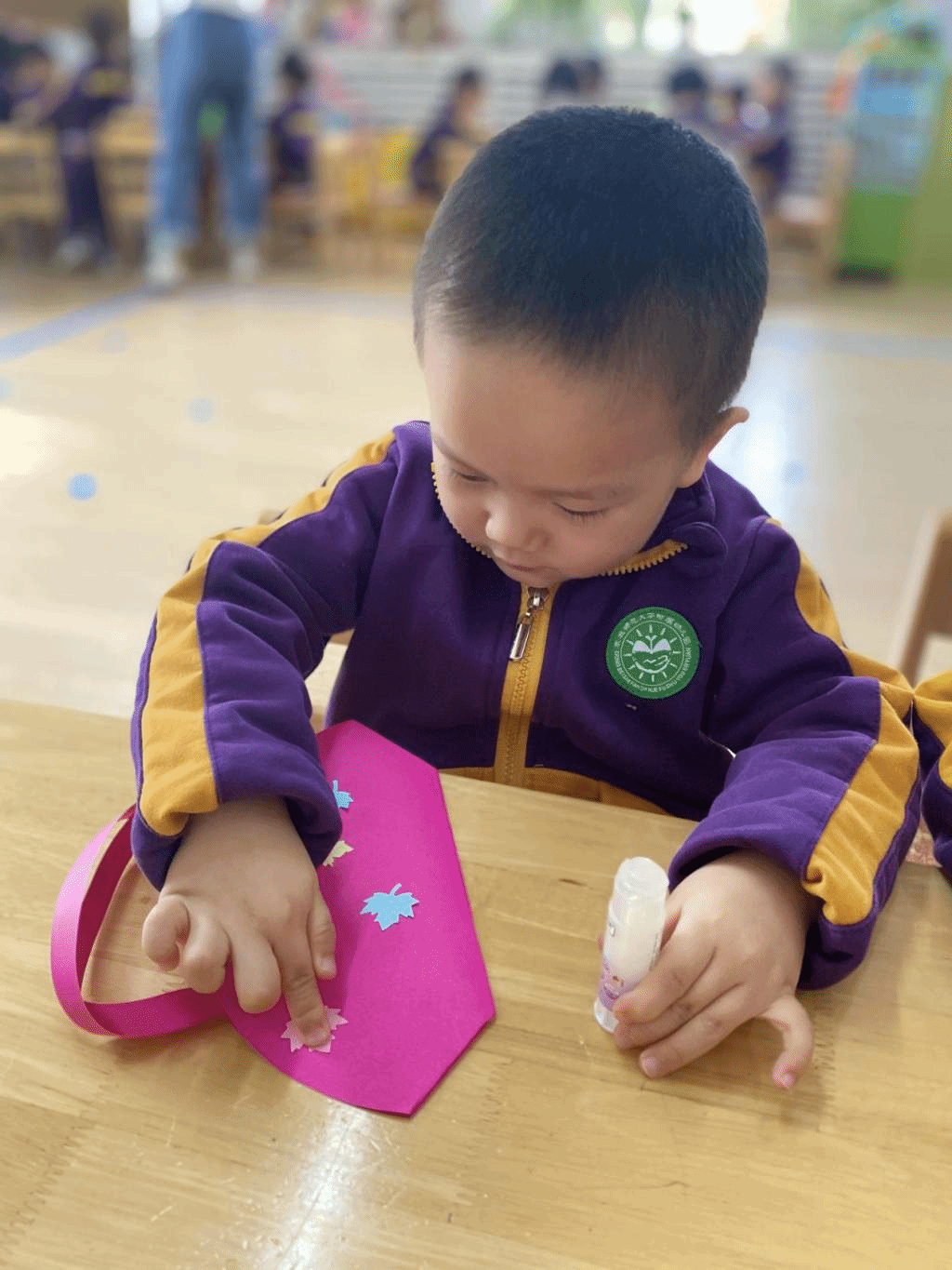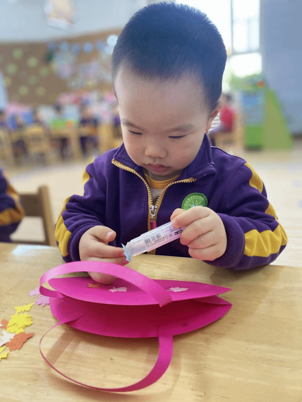 瞧,宝贝们那专注的眼神,稚嫩的小手灵活地粘贴,制作出一个个精美的手工小包,无不表达着他们对心中“女神”们真挚的感恩之情。