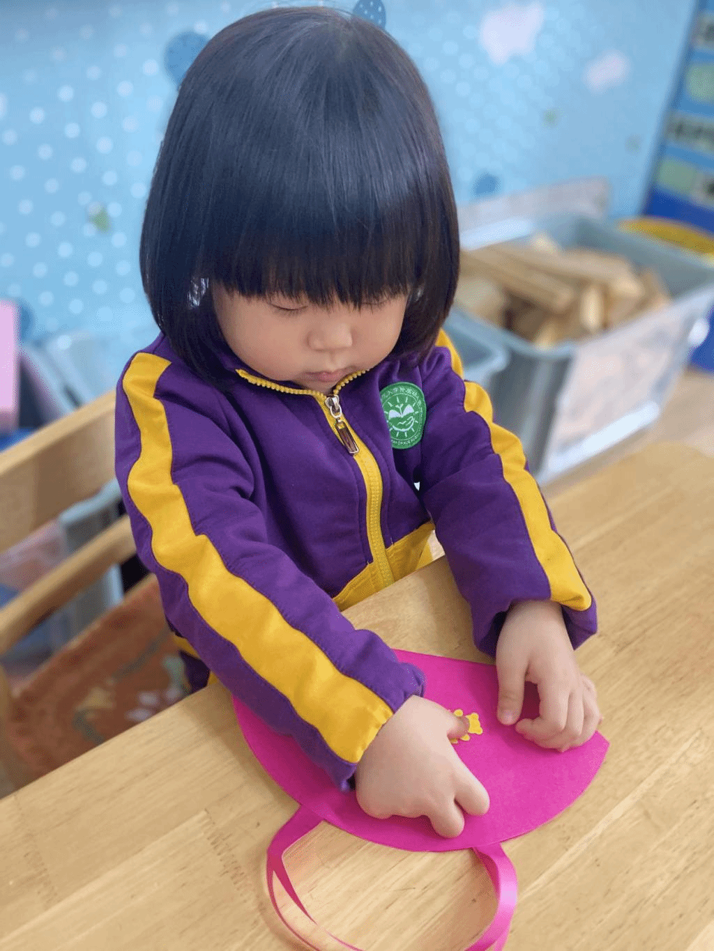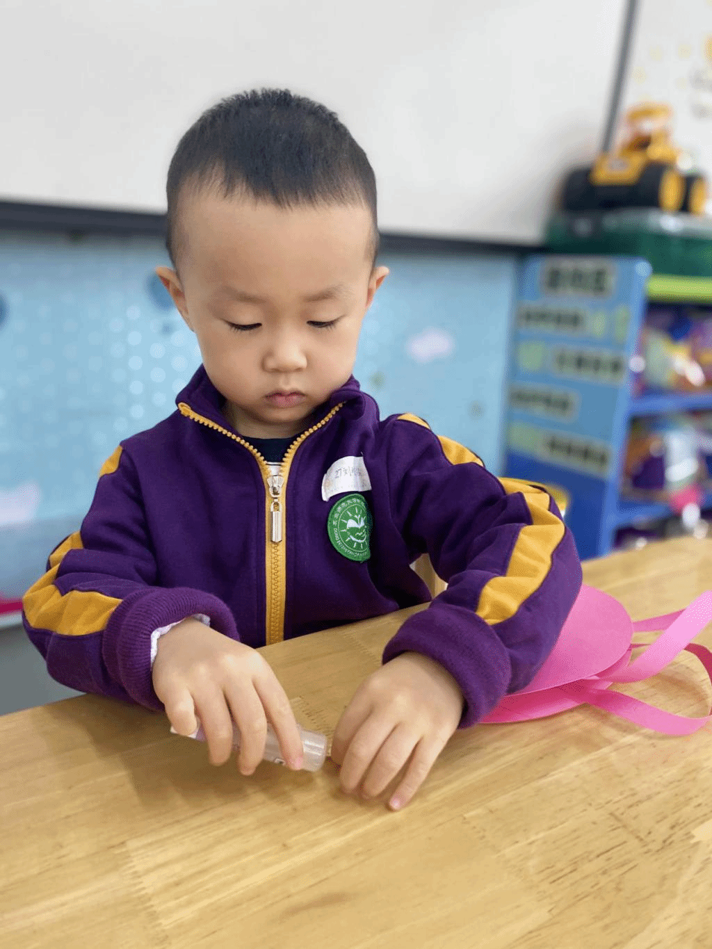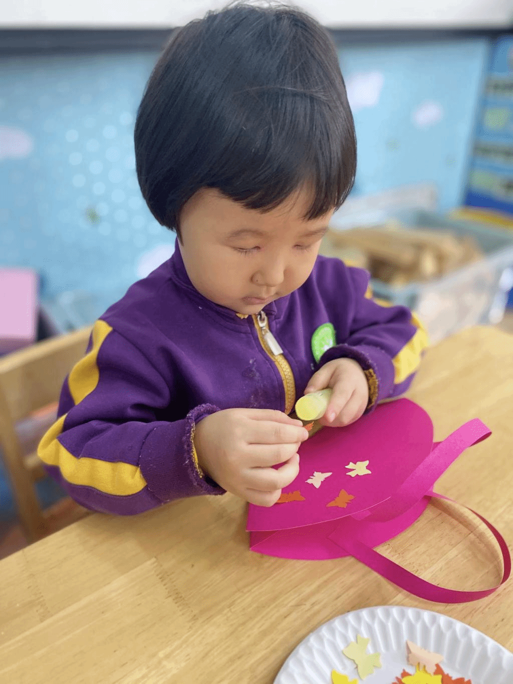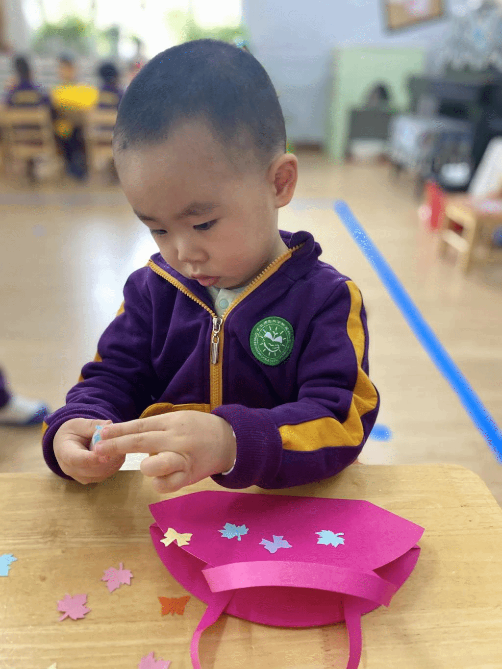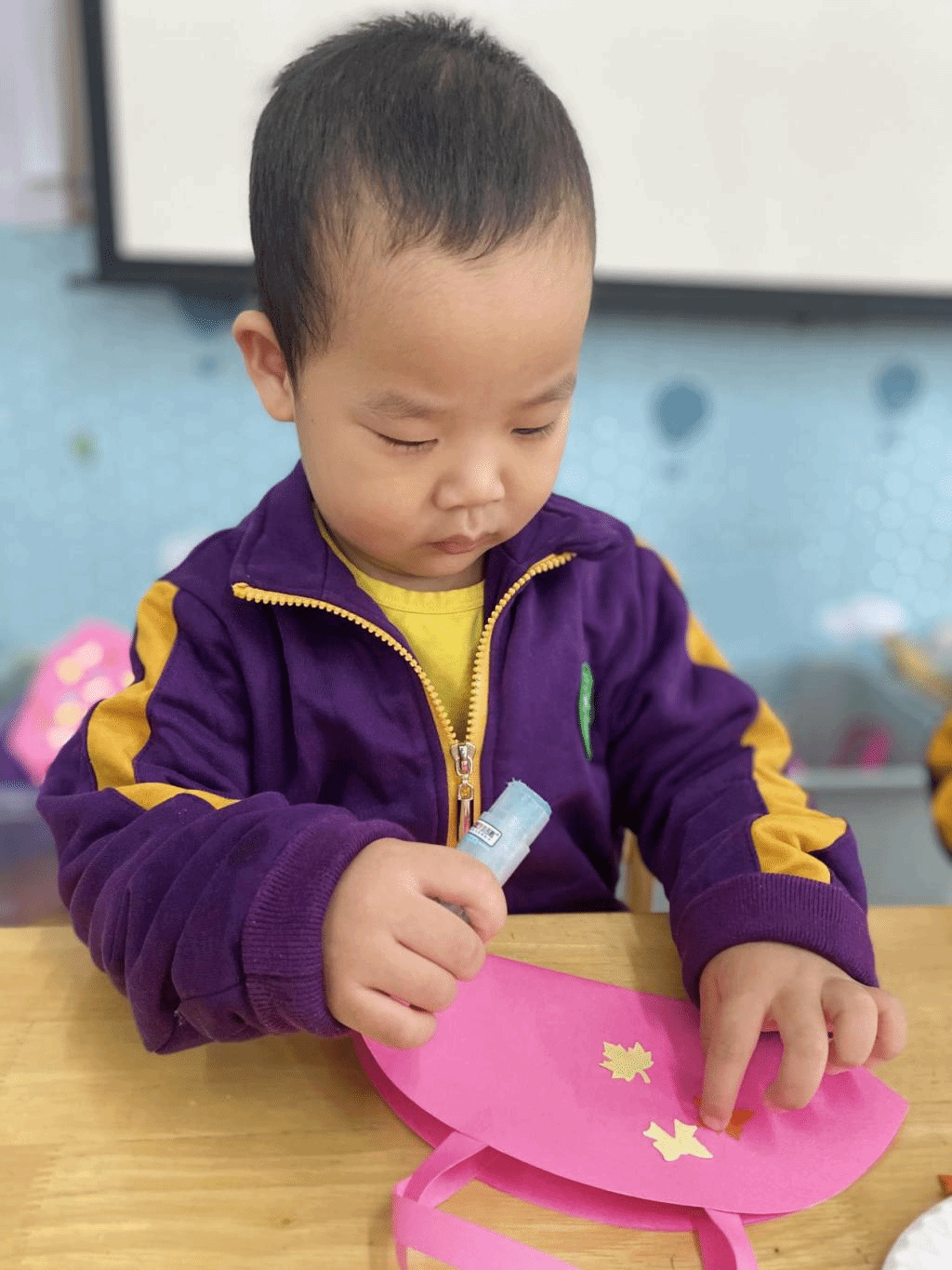 瞧,宝贝们那专注的眼神,稚嫩的小手灵活地粘贴,制作出一个个精美的手工小包,无不表达着他们对心中“女神”们真挚的感恩之情。