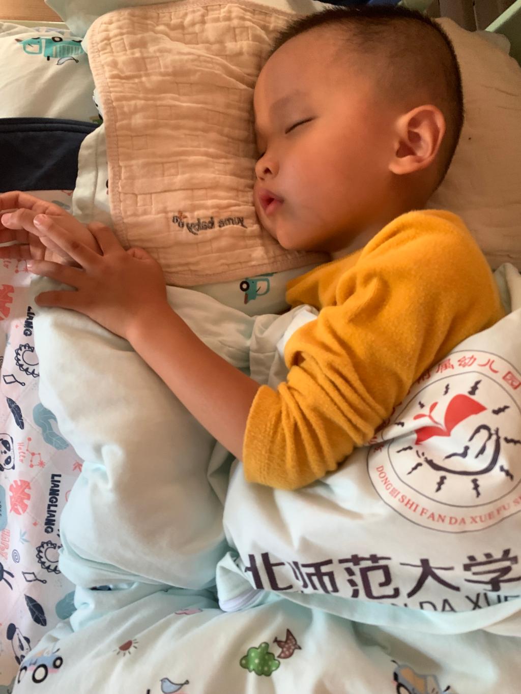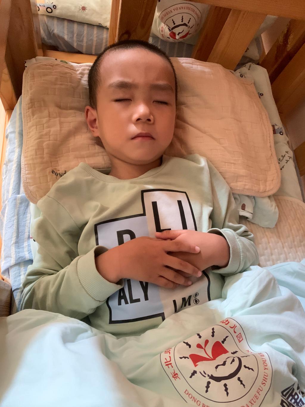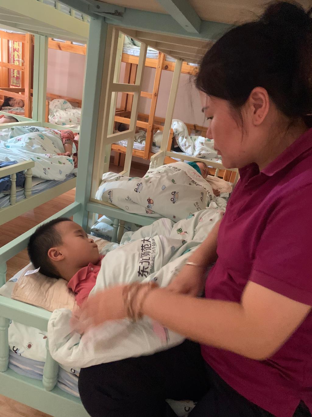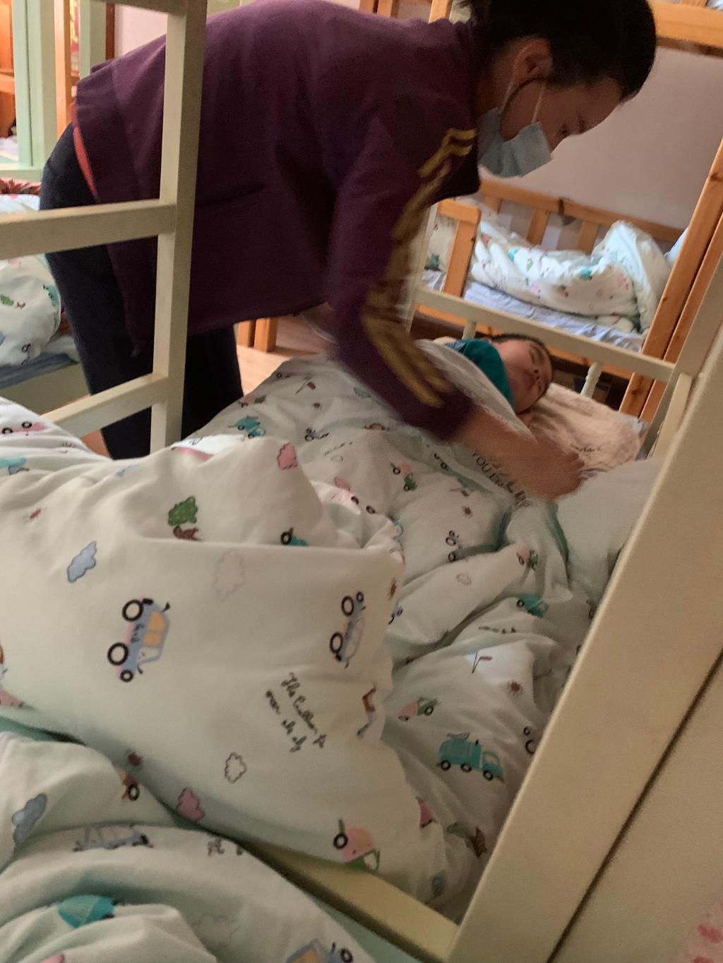 宝贝们安静的躺着等待着好梦的来临。老师则时刻关注着每一个孩子,帮他们盖好被子。终于睡着了,此刻的休息室里只剩下甜甜的鼾声和老师们巡视的轻轻脚步声!
