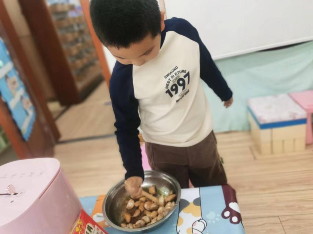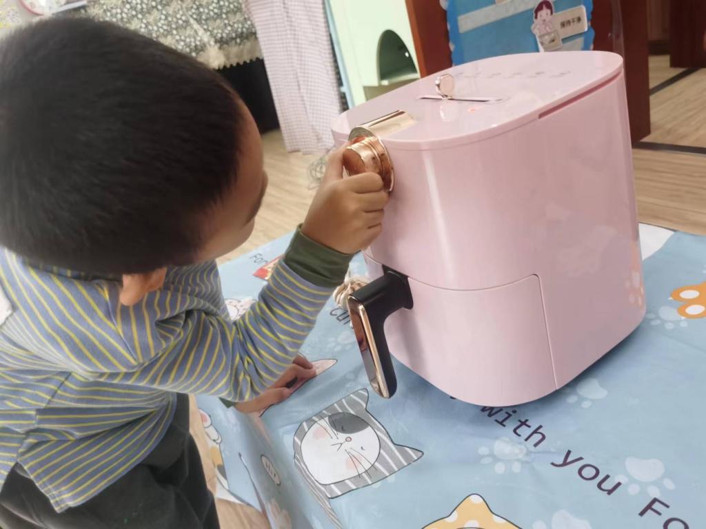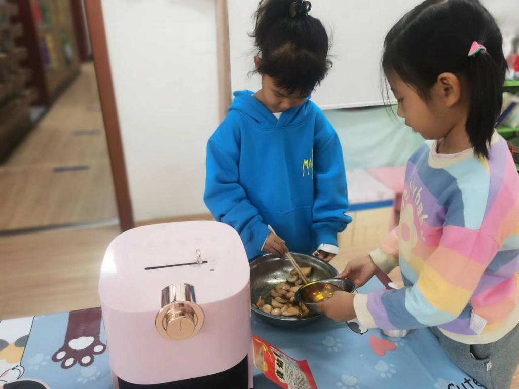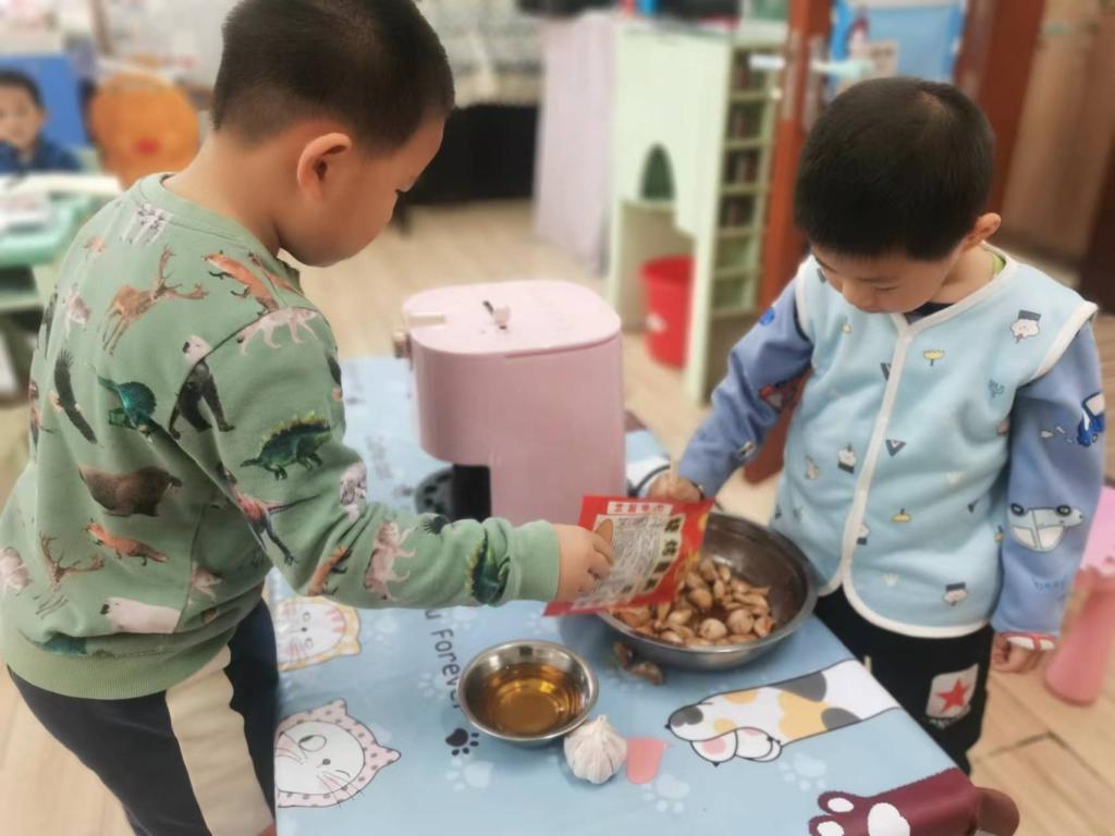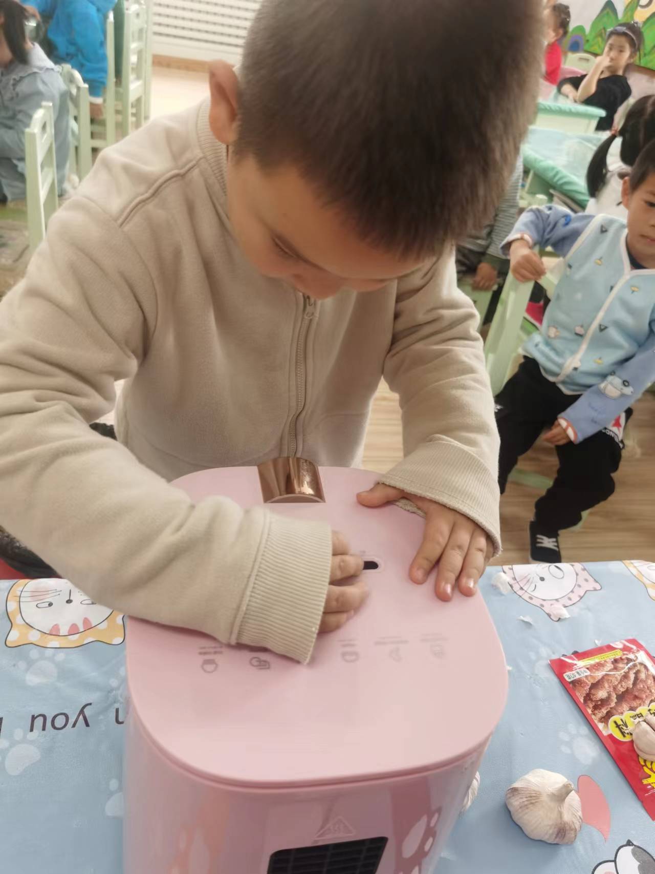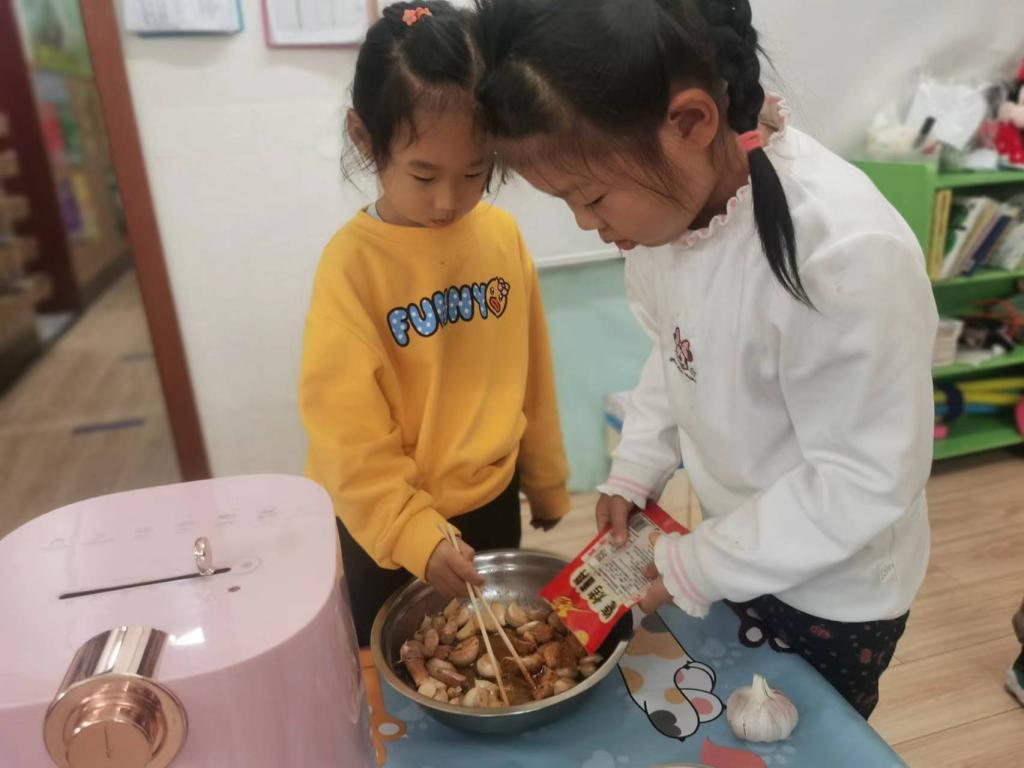 老师详细的讲解了制作步骤和注意事项。小朋友们尝试着要把蒜扒成一瓣一瓣的,之后蒜瓣放在容器里倒入少量的油,再倒入一些烧烤调料,慢慢的搅拌下,再放入空气炸锅中,调节好时间和温度,孩子们高兴的等待烤大蒜的出锅哦!