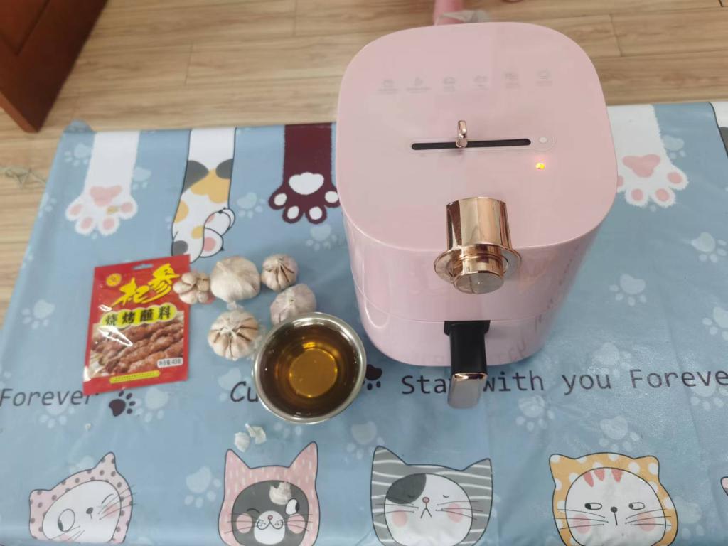 我们和孩子们先做了一些准备工作和材料,如油、烧烤调料、大蒜、空气炸锅等,一起来一次生活小实践吧!
