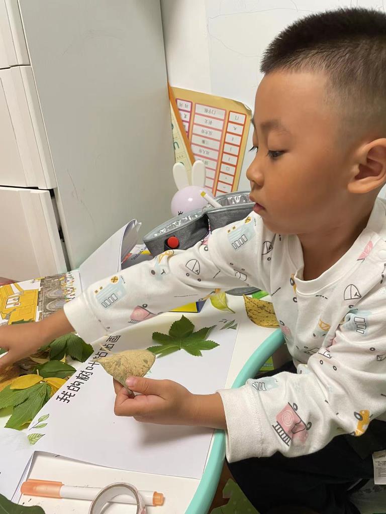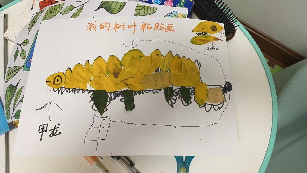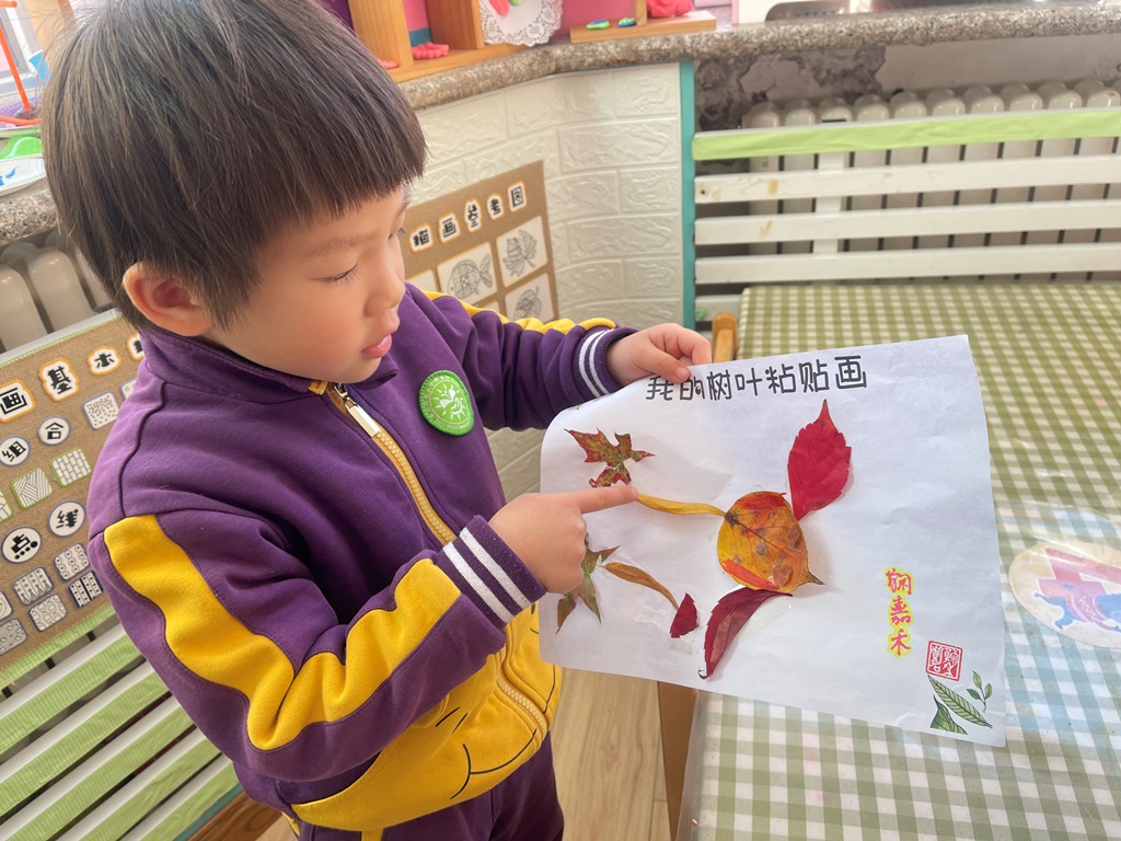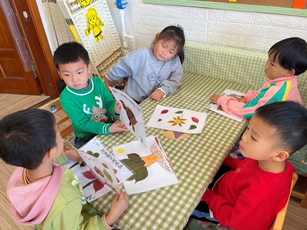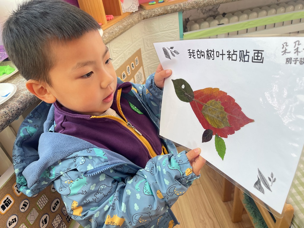 给小伙伴们讲一讲自己的树叶粘贴画小故事。