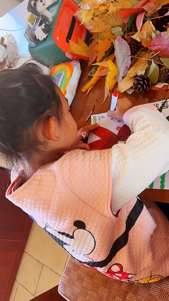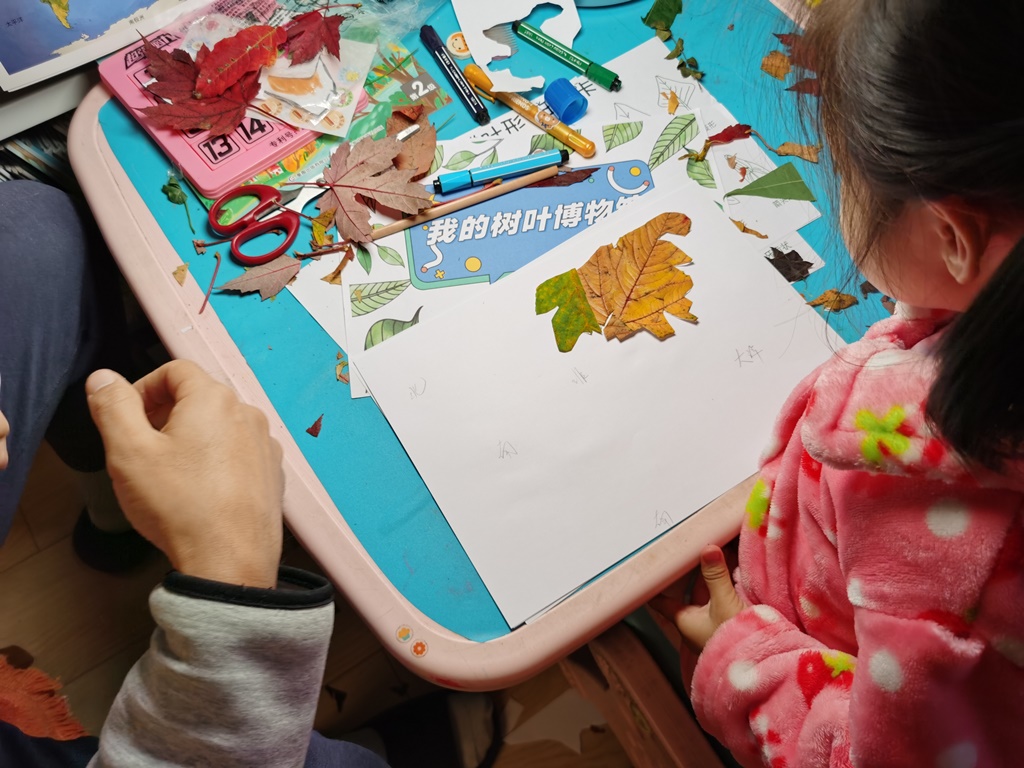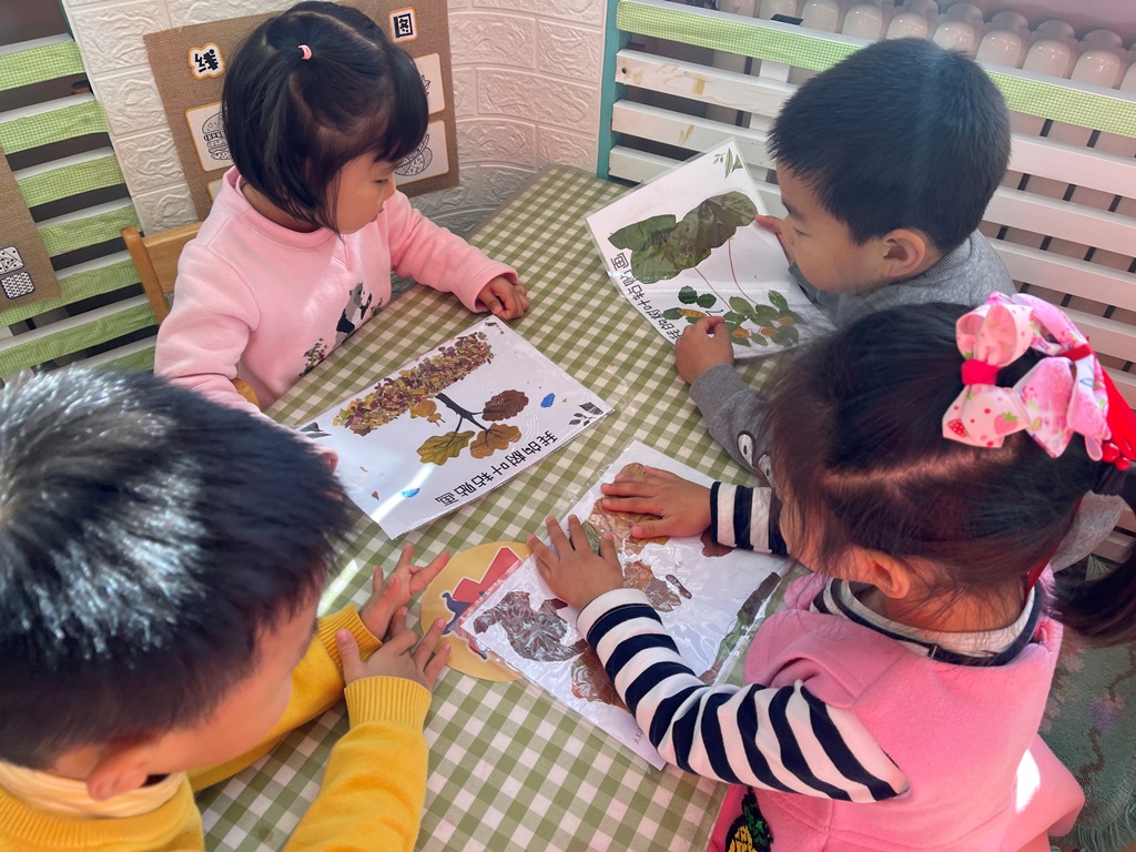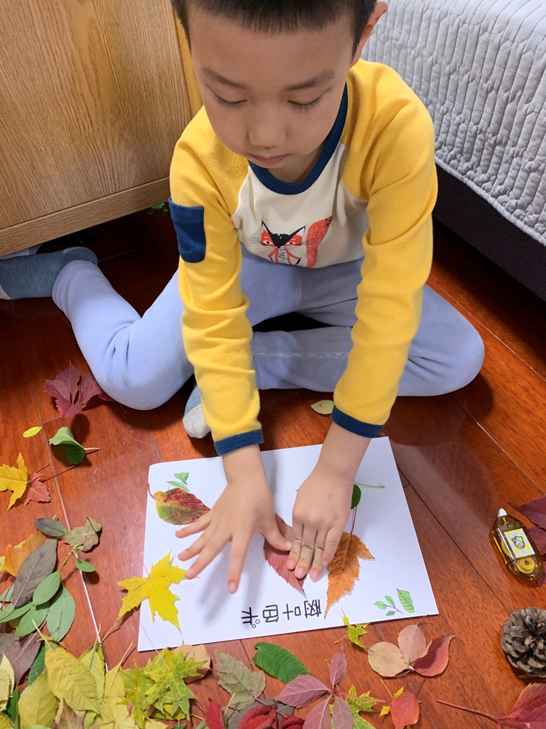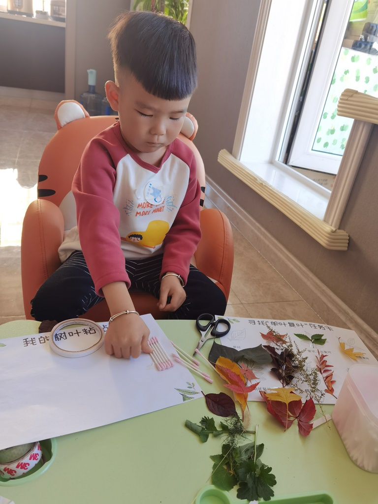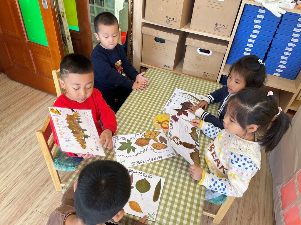 给小伙伴们讲一讲自己的树叶粘贴画小故事。
