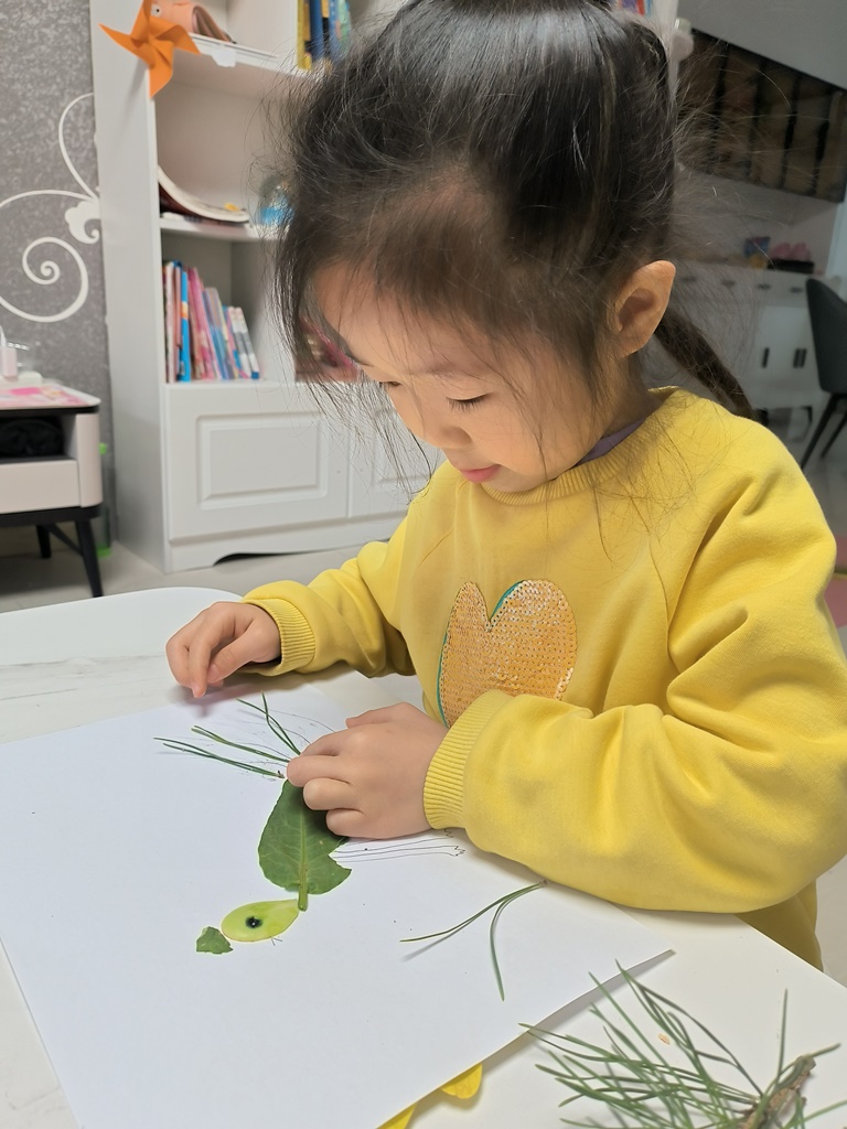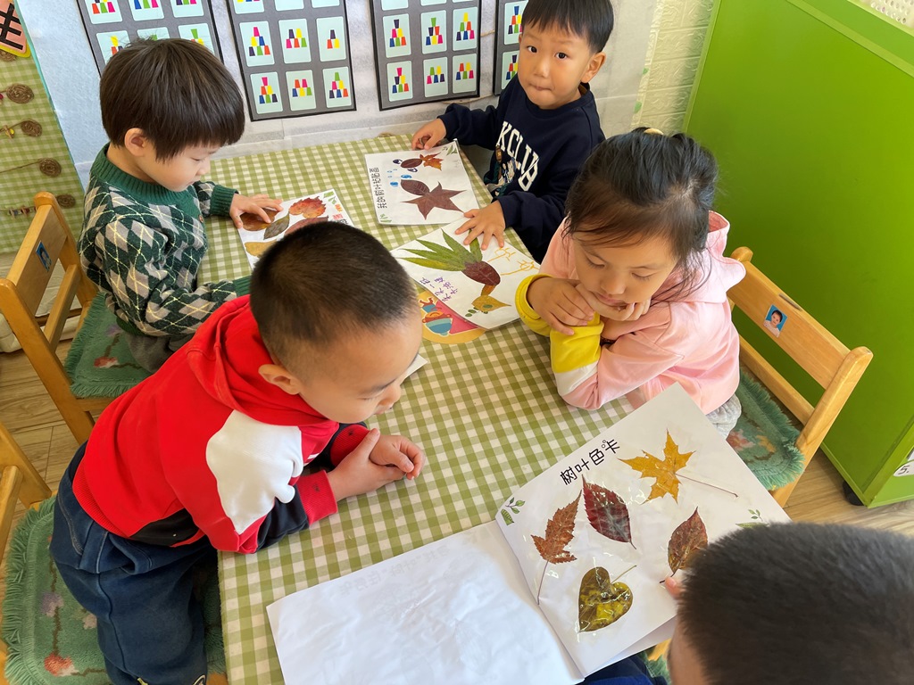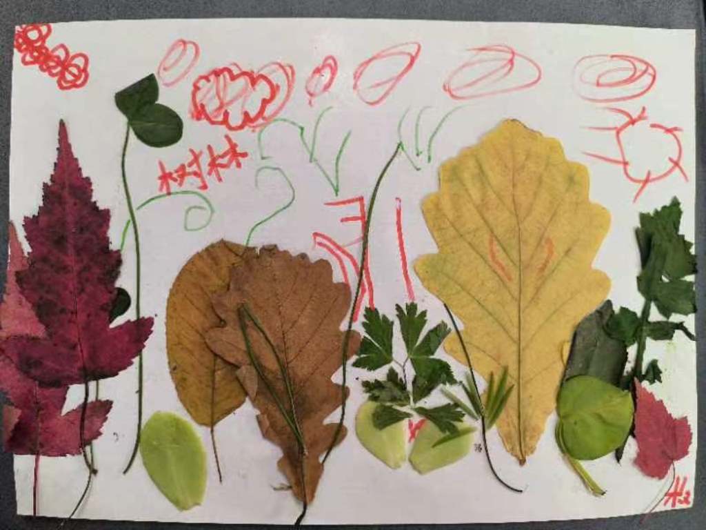 树叶之美,美在看似一样,又总有细微不同的叶形和叶脉,美在姿态各异、形式不同的叶缘,美在如同画家调色板上调出的或温暖明媚、或生机盎然、或枯败凋零的叶色,真是别有韵味和意趣。所有的美对孩子们都是想象力和创造力的激发。快看,朵朵一班的小朋友,迸发出什么样的艺术和智慧火花。