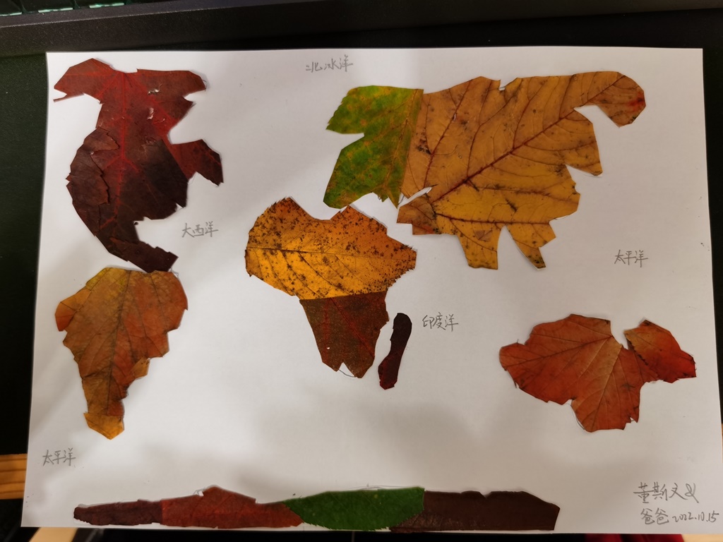 文文爸爸用搜集来的树叶跟宝贝进行了一次地理知识的亲密互动,瞧,用树叶粘贴画表现的四大洋,太有创意了!