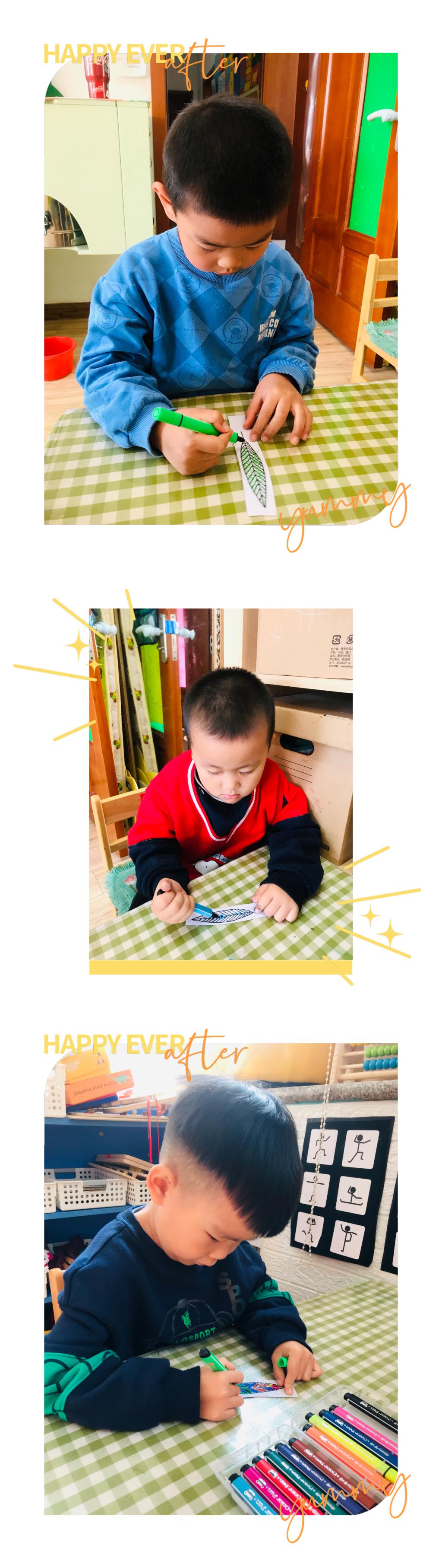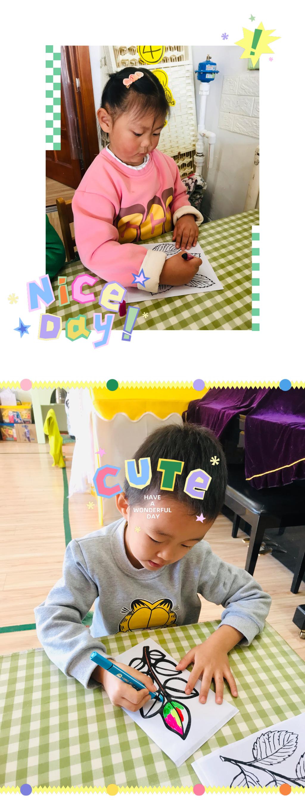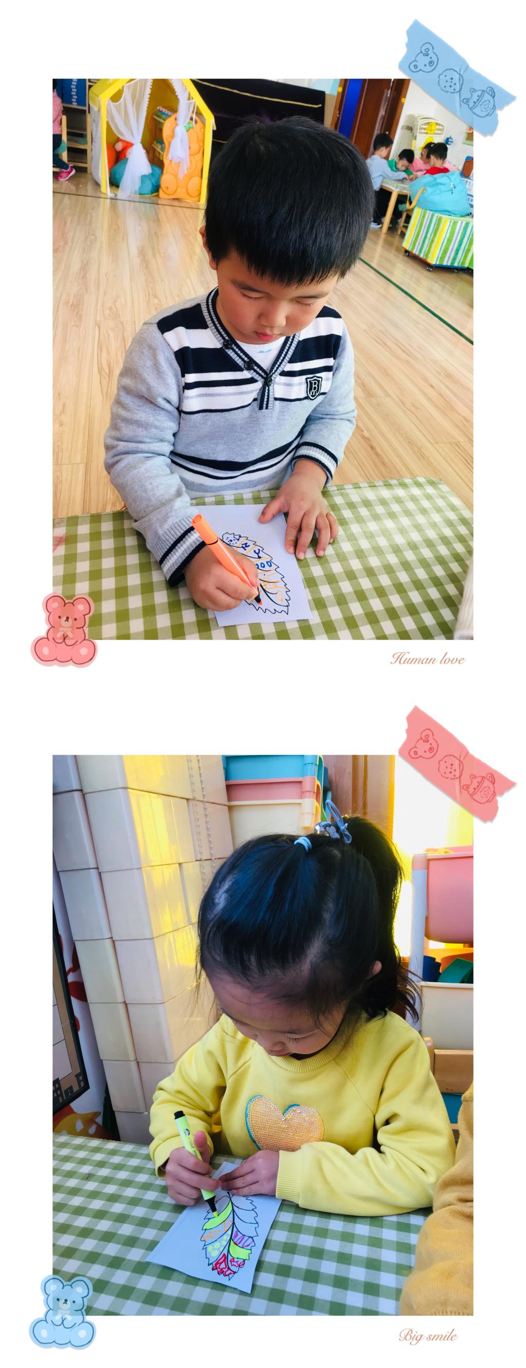 秋天是五彩斑斓的,是多彩的,树的叶子开始慢慢的变红、变黄。在寻找到不同形状、叶脉的叶子后,小朋友们对叶子也有了独特的喜爱。我最喜欢想羽毛形状一样的叶子,我最喜欢红红的叶子,我喜欢细细的叶子......每个小朋友都能说出自己喜欢叶子的模样。突然有个小朋友说,老师为什么没有彩色树叶?我喜欢五颜六色的!是呀,虽然没有五颜六色的叶子,可是我们可以把叶子装饰成自己喜欢的颜色和图案呀!