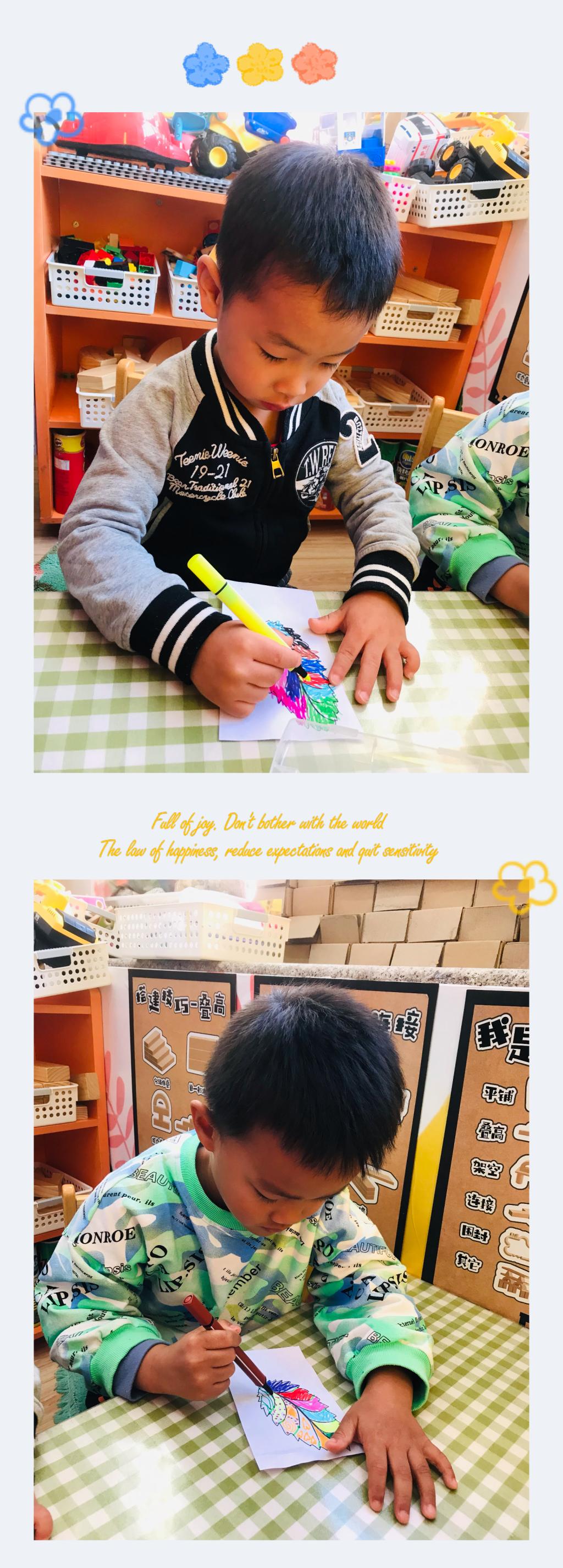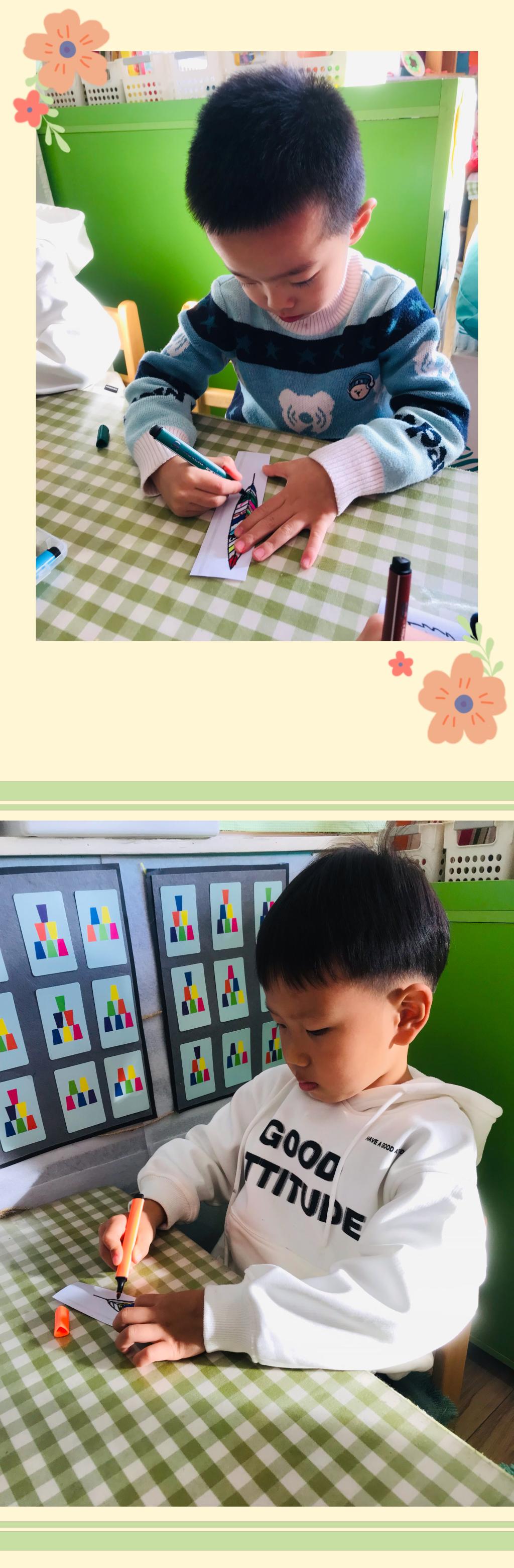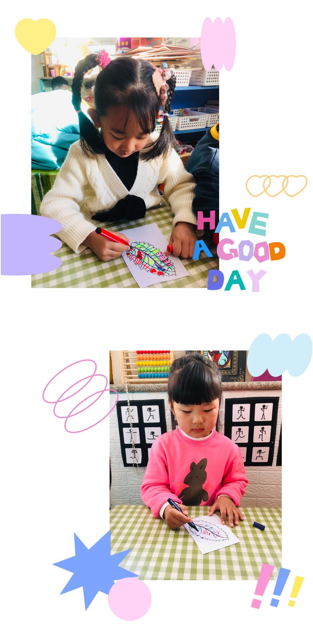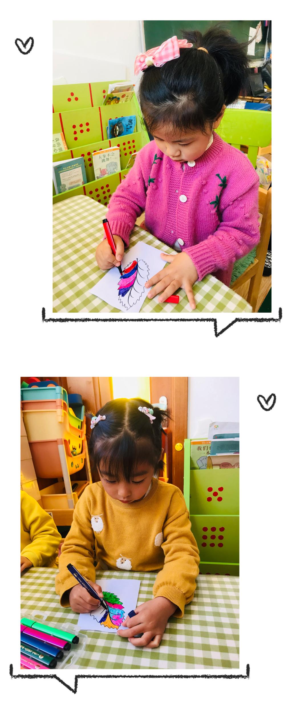 秋天是五彩斑斓的,是多彩的,树的叶子开始慢慢的变红、变黄。在寻找到不同形状、叶脉的叶子后,小朋友们对叶子也有了独特的喜爱。我最喜欢想羽毛形状一样的叶子,我最喜欢红红的叶子,我喜欢细细的叶子......每个小朋友都能说出自己喜欢叶子的模样。突然有个小朋友说,老师为什么没有彩色树叶?我喜欢五颜六色的!是呀,虽然没有五颜六色的叶子,可是我们可以把叶子装饰成自己喜欢的颜色和图案呀!