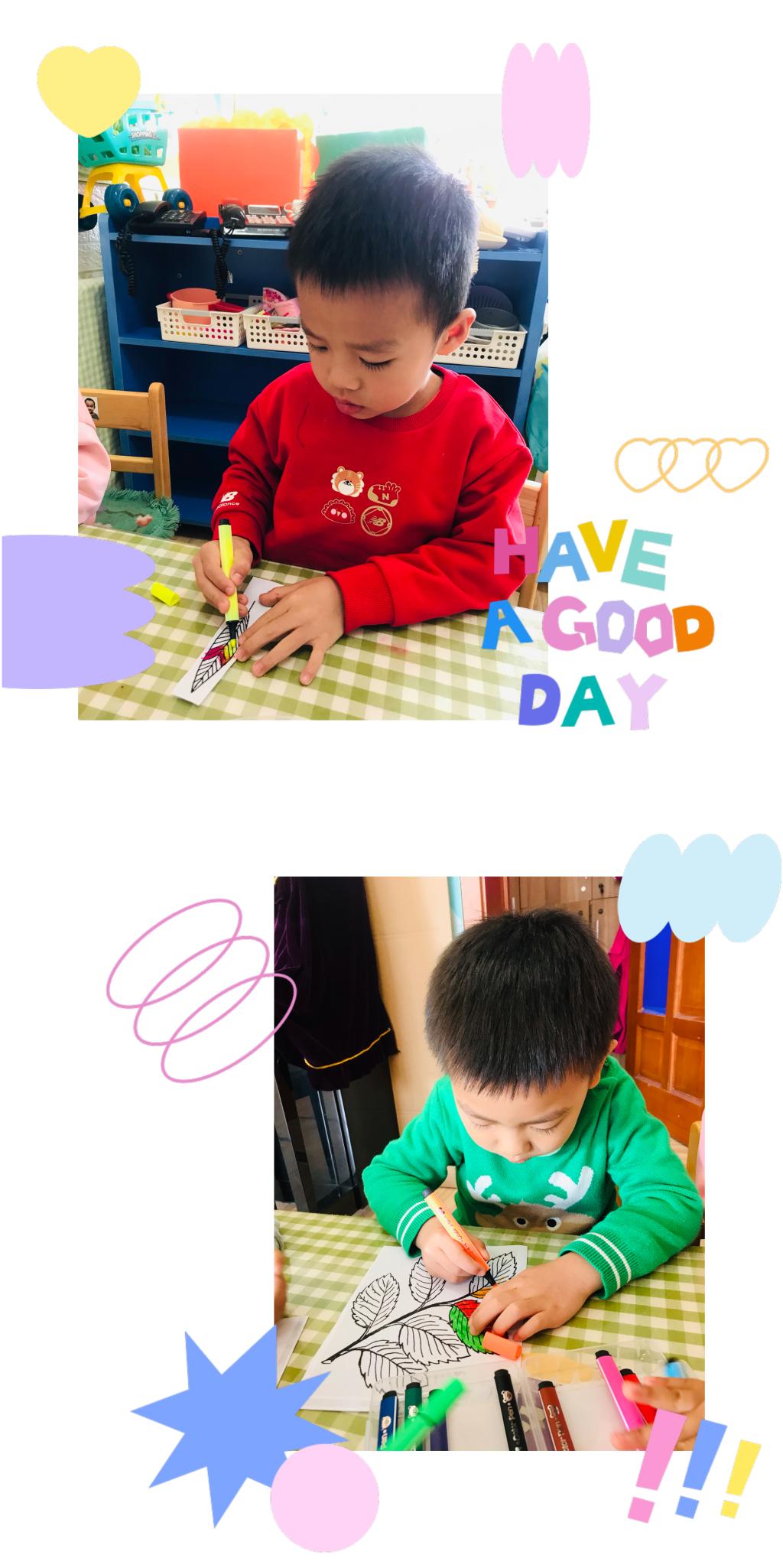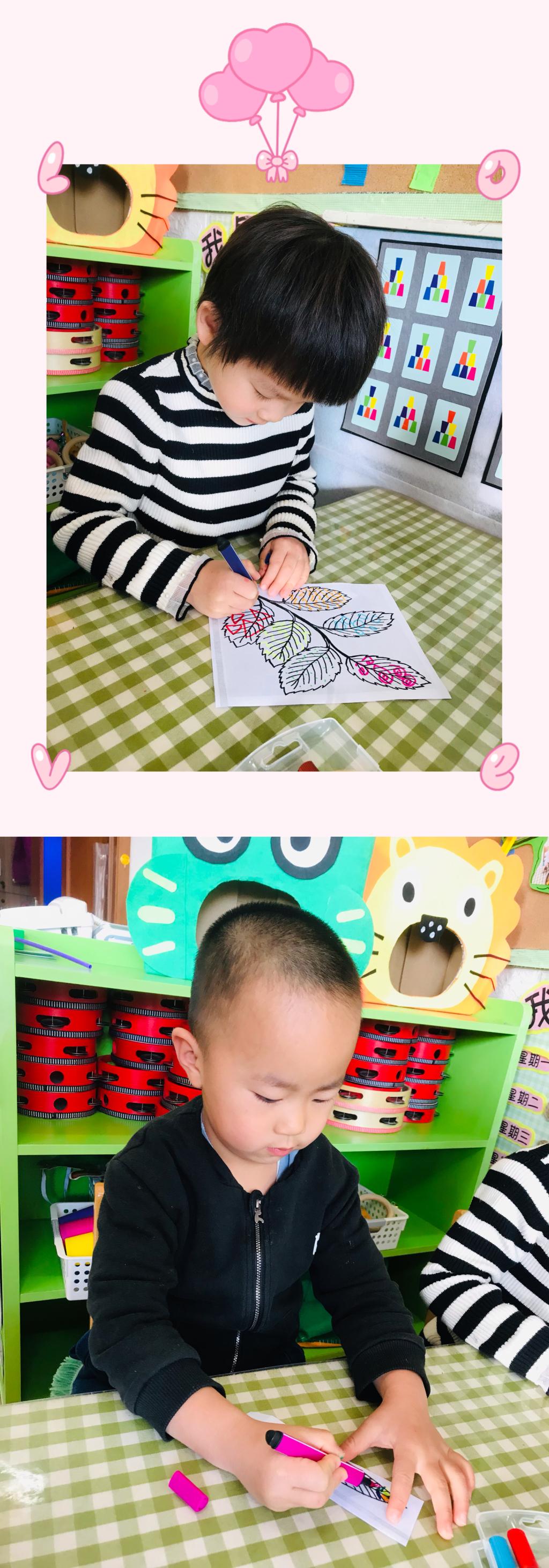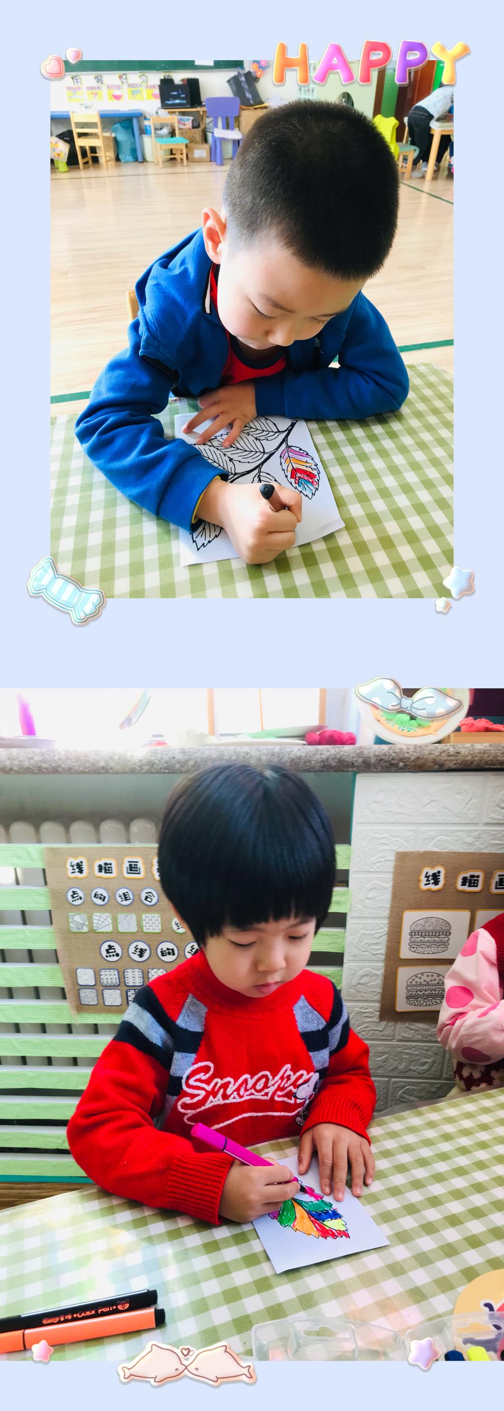 老师准备了不同形状树叶的轮廓画,在绘画之前,小朋友们认真的想了想,自己想把树叶装饰成什么颜色的,什么图案?他们认真的思考着,都胸有成竹开始装饰多彩的树叶。