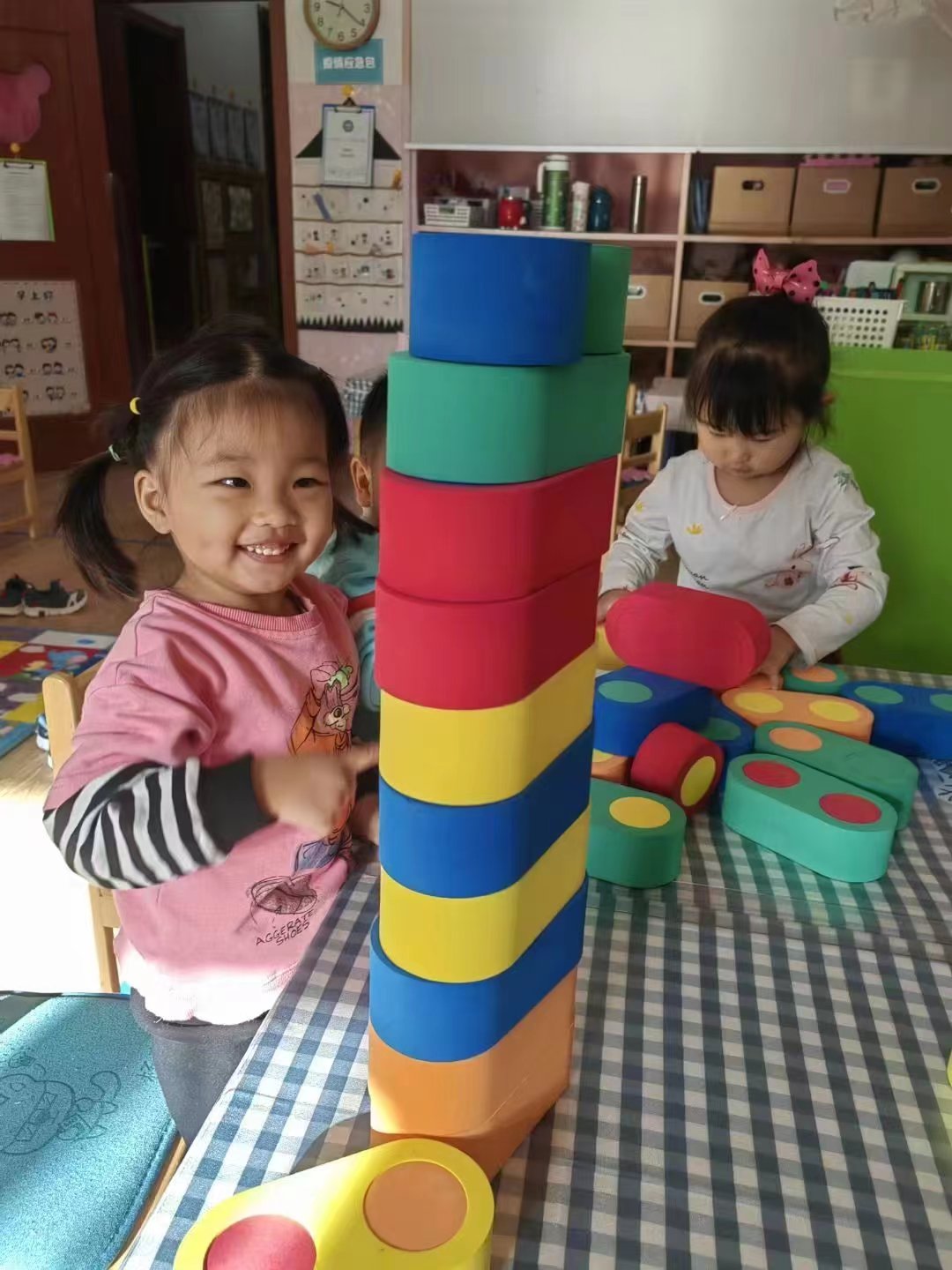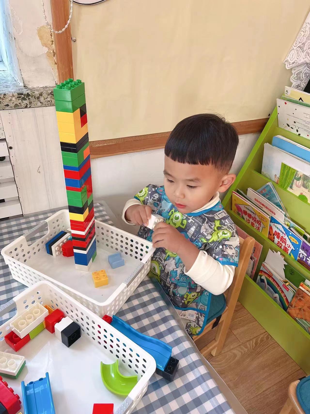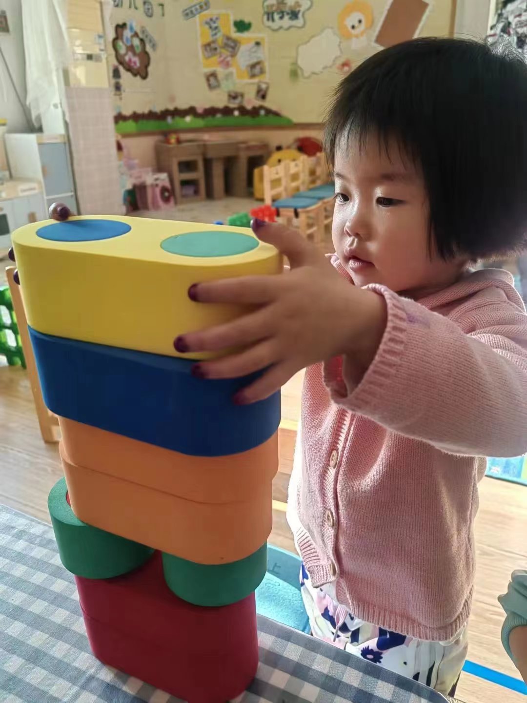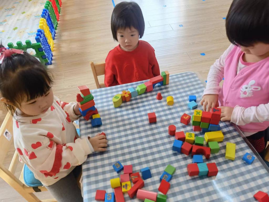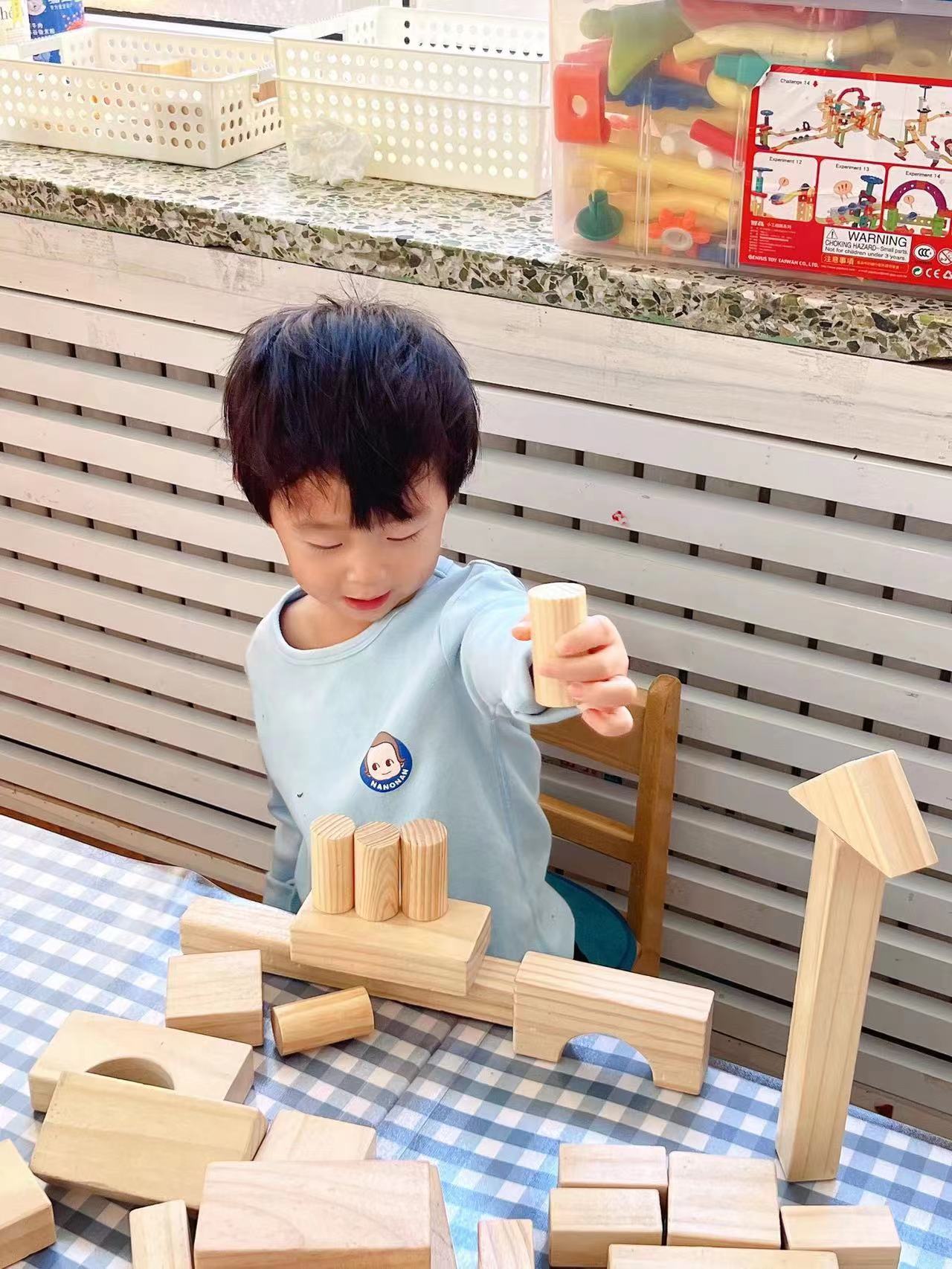 慢慢的,宝贝们开始知道,要将积木对齐,这样才会更稳固。