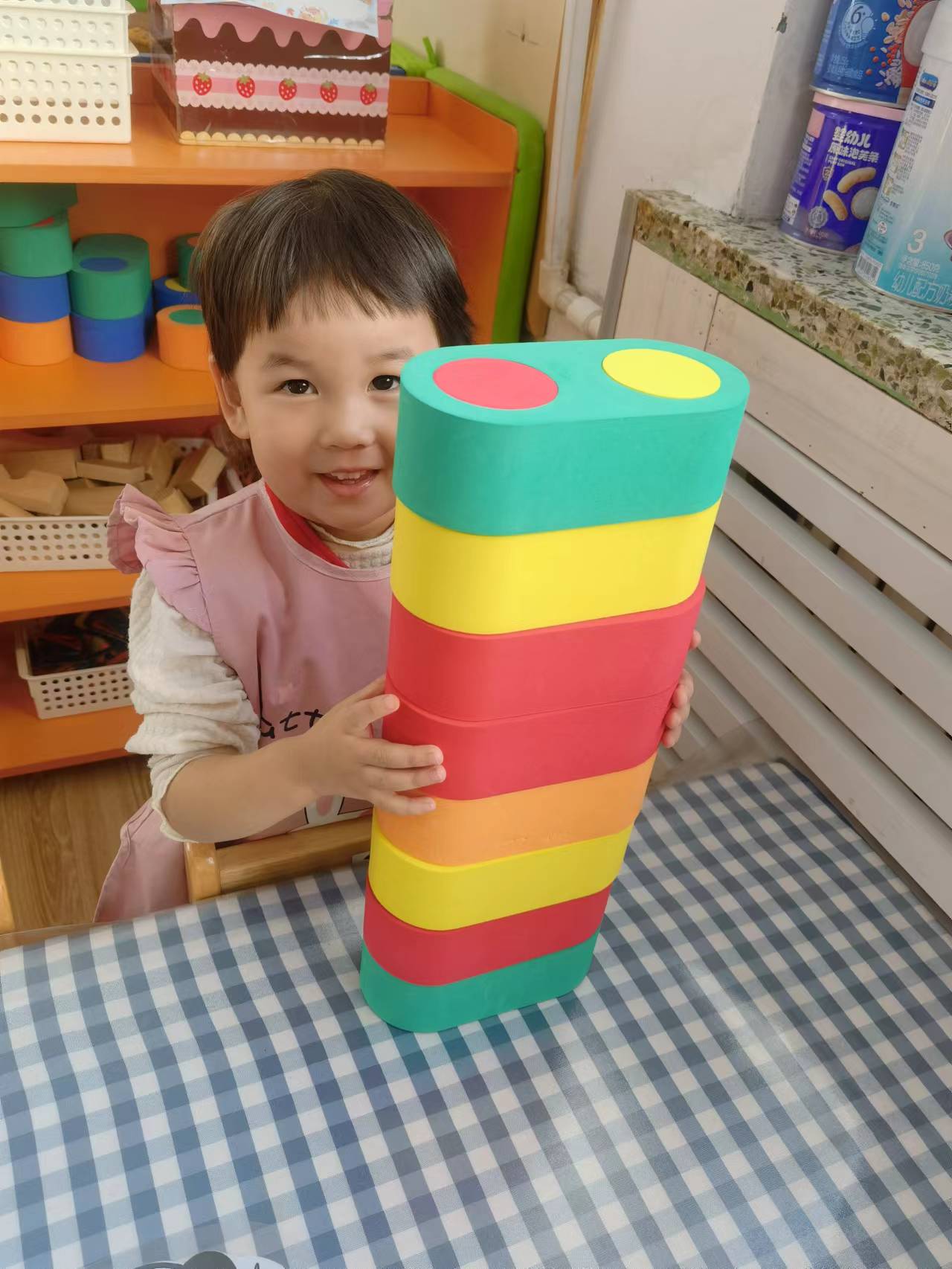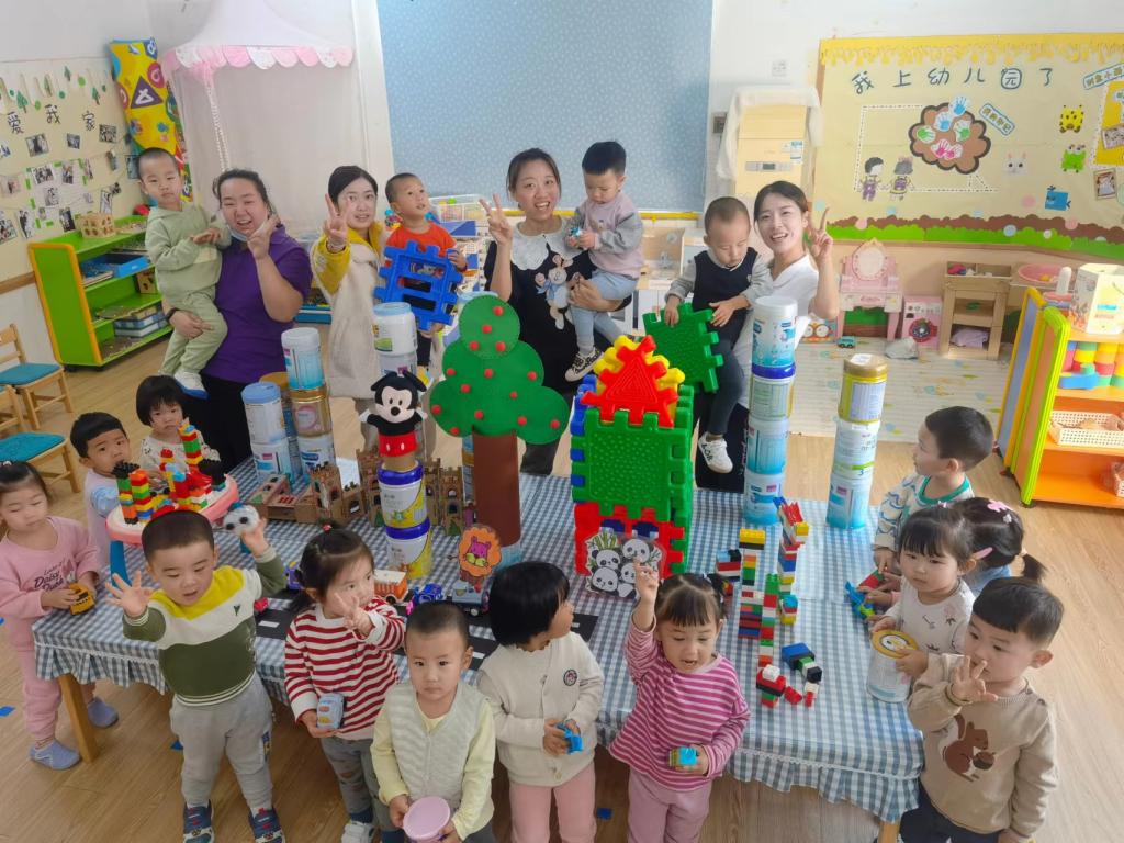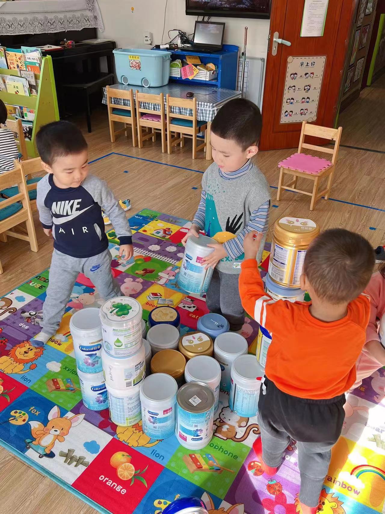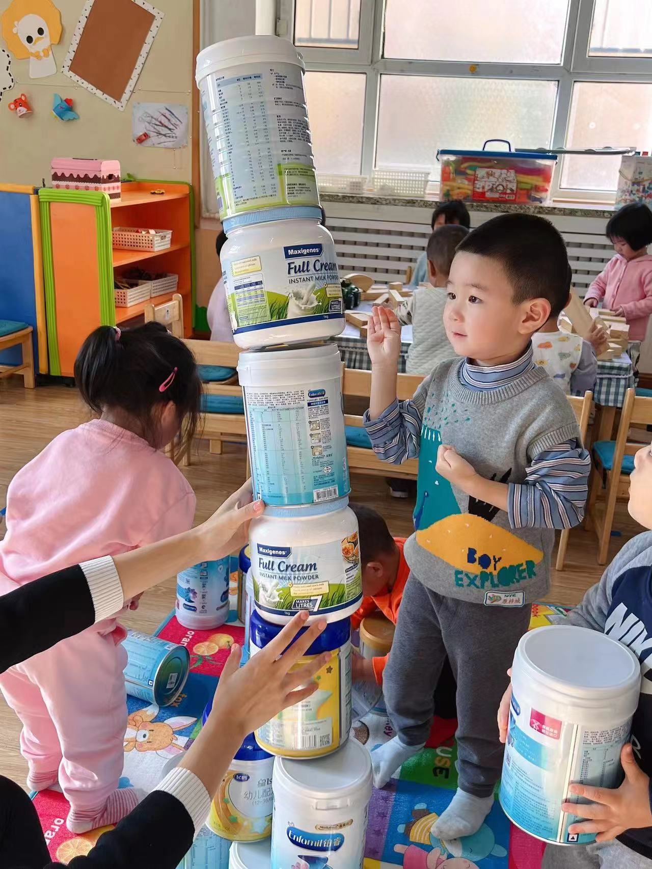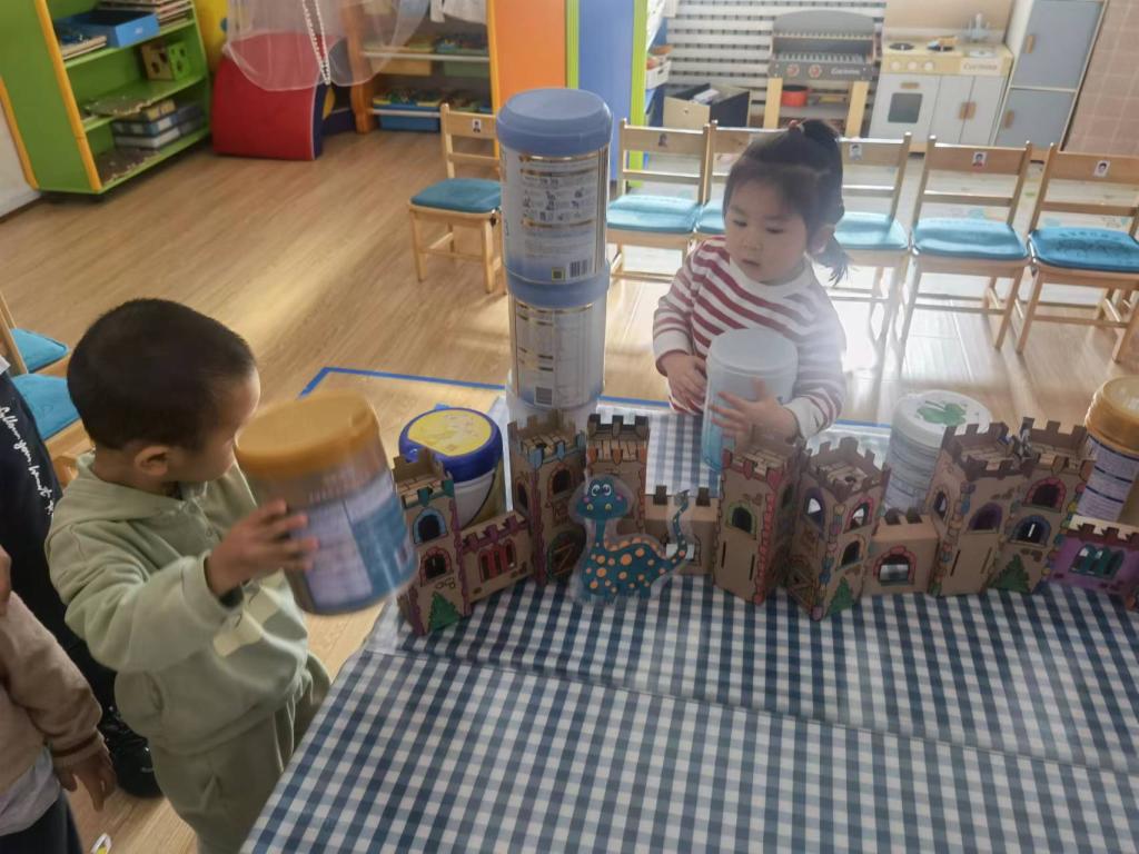 团结力量大,合作也是很好的搭建方式呦。奶粉桶越大越高,有的小朋友已经够不到了,个子最高的点点说:“我来帮你吧,我能够得到。”