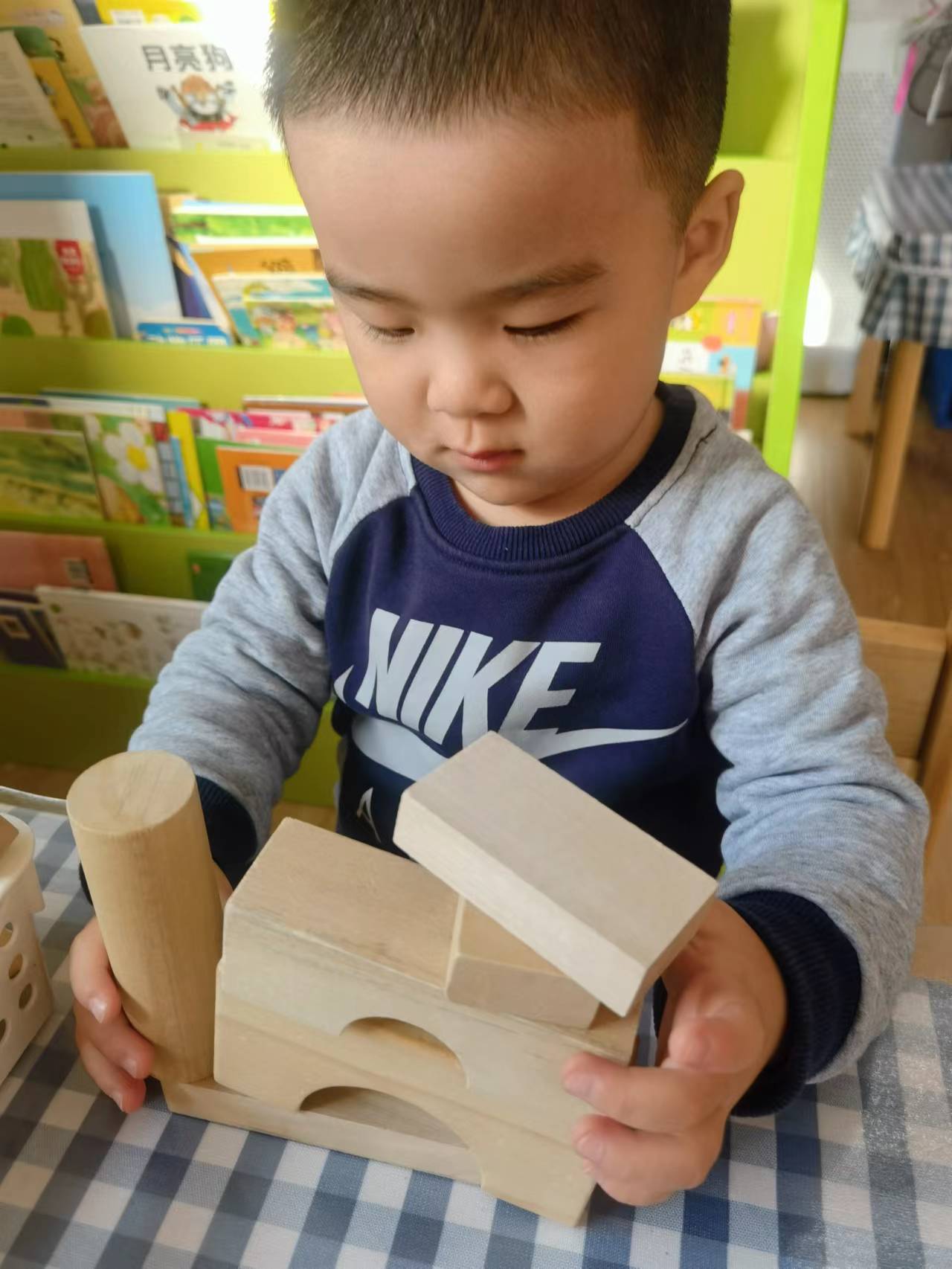六合说:“看,我要搭大城堡。”