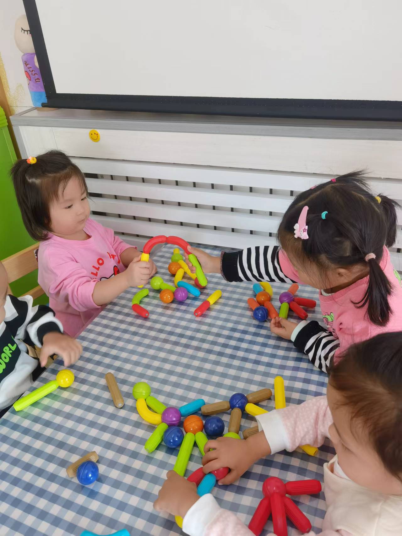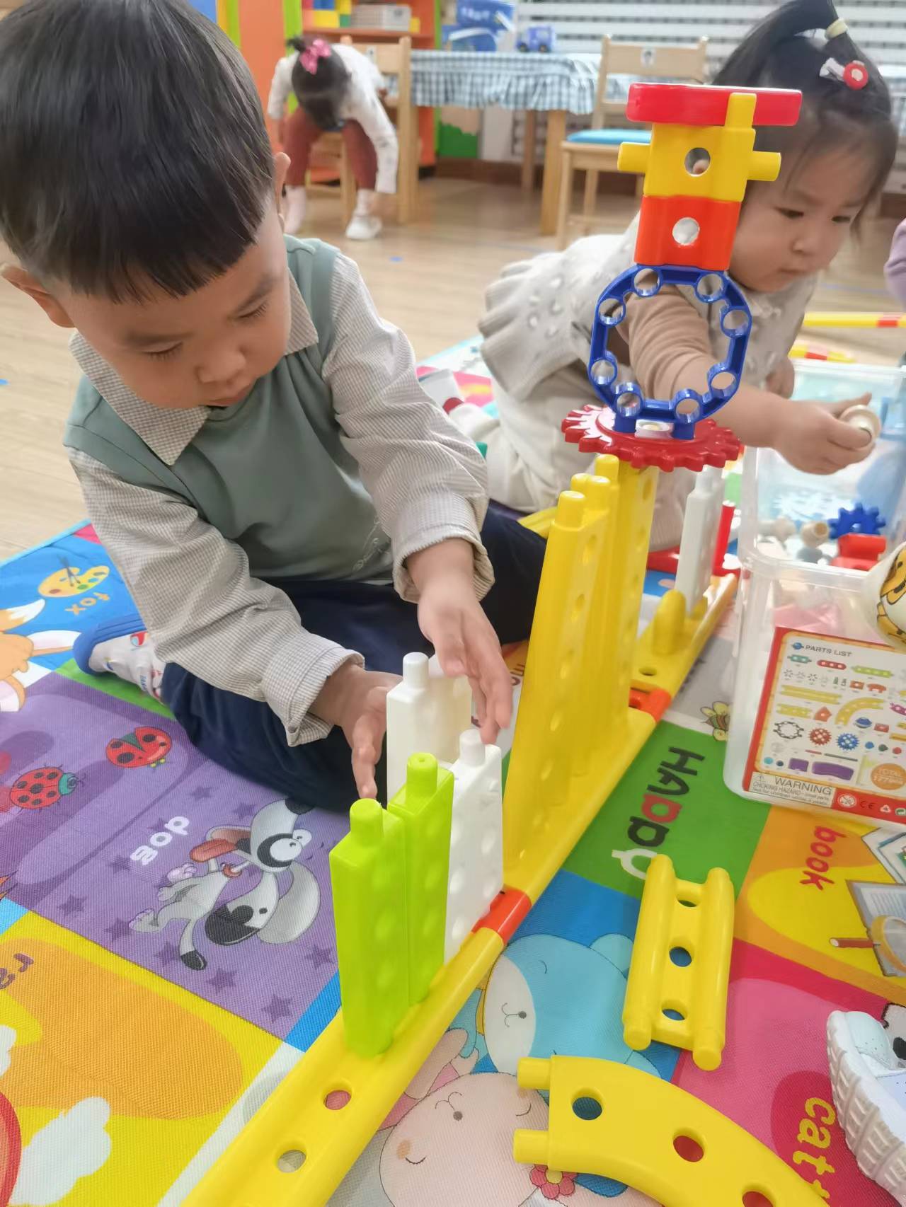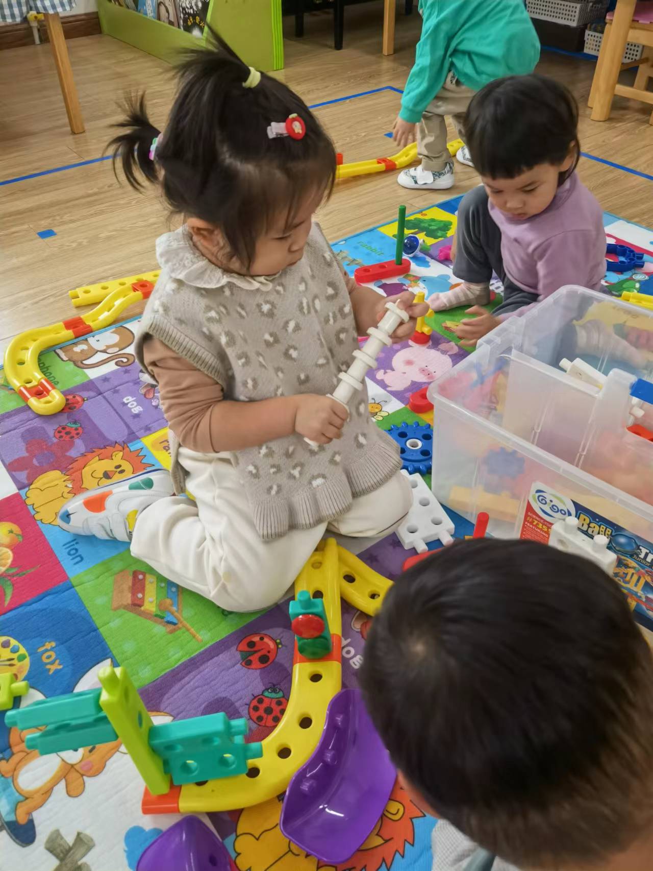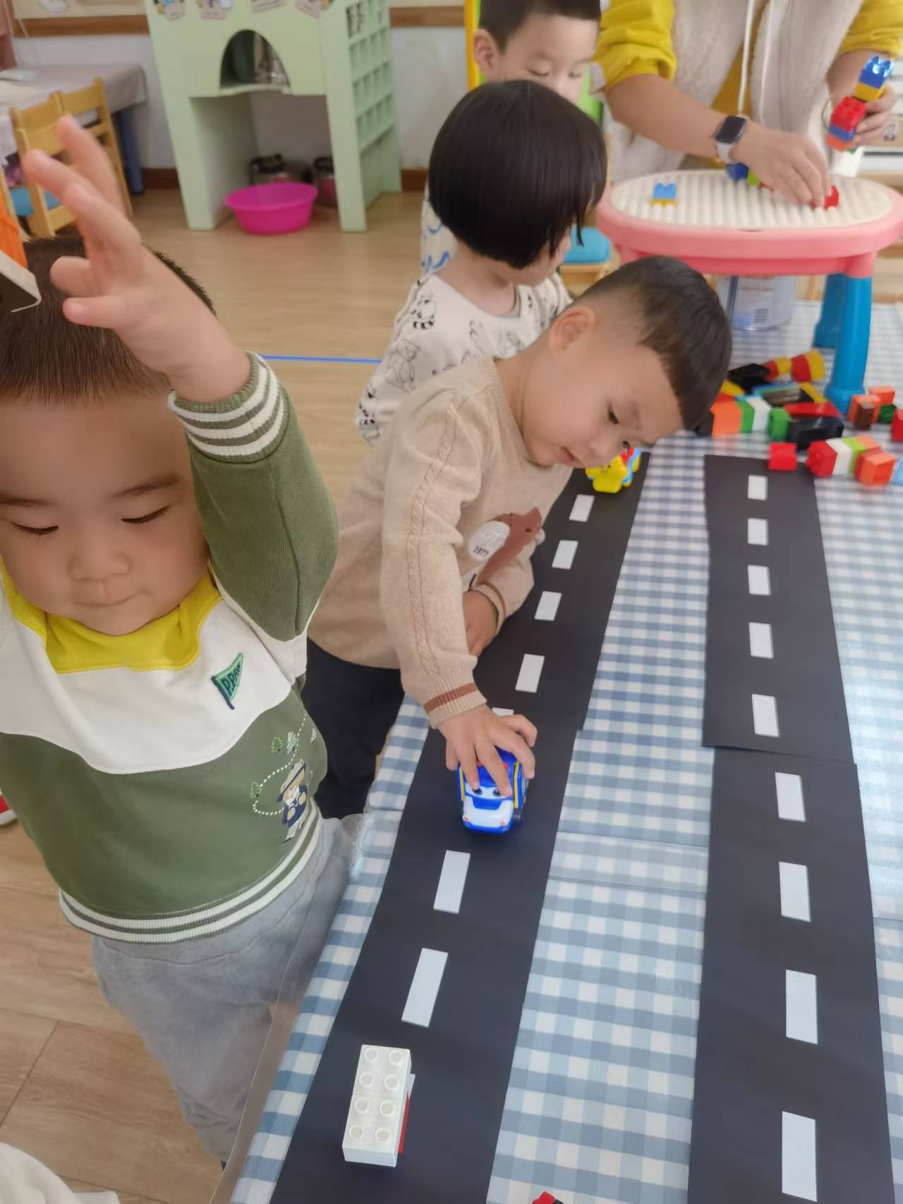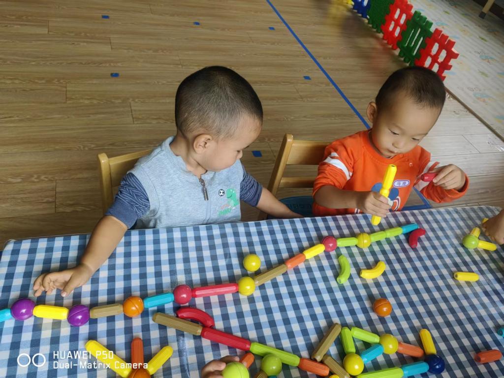 我们在游戏中为宝贝们提供了有探索性的环境,丰富多样的建构材料,满足孩子们的不同需求:男孩们喜欢的小汽车,也能建构。为小汽车搭建马路,在马路的周围还有高楼。