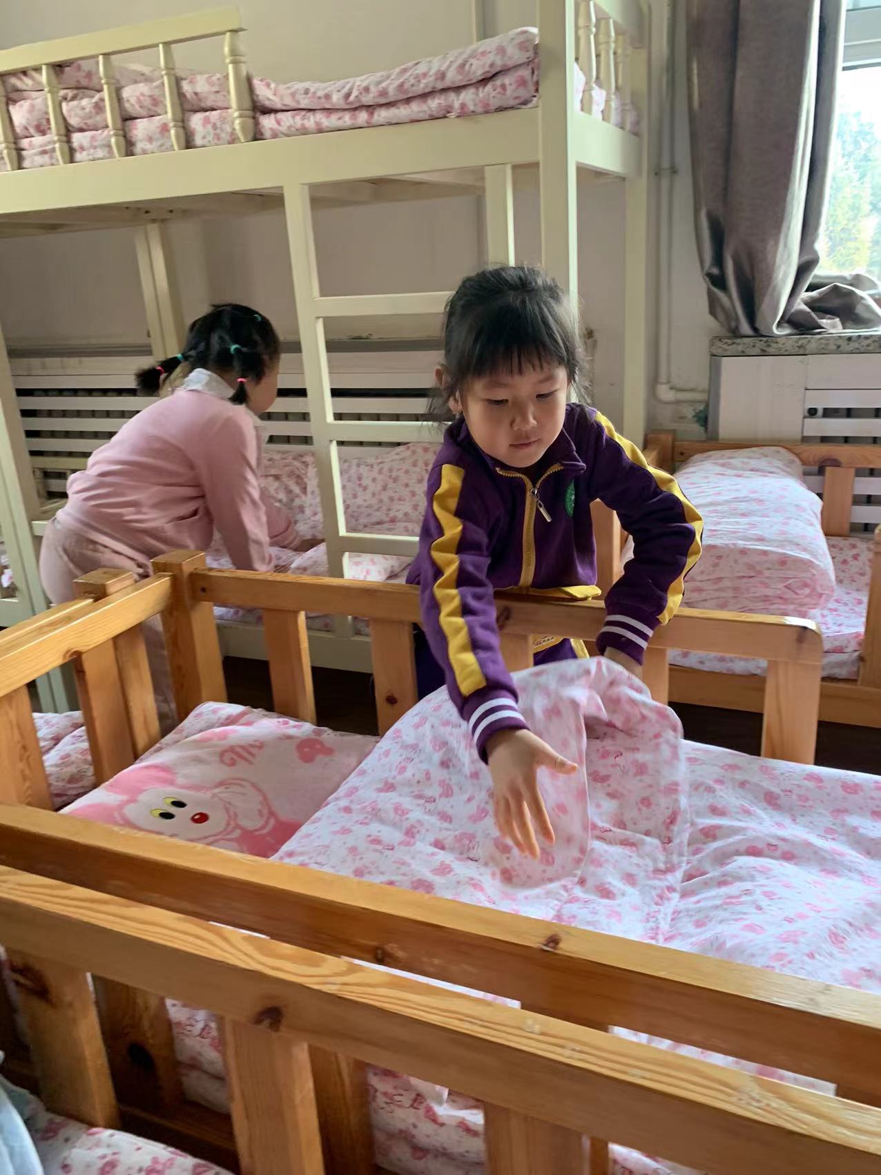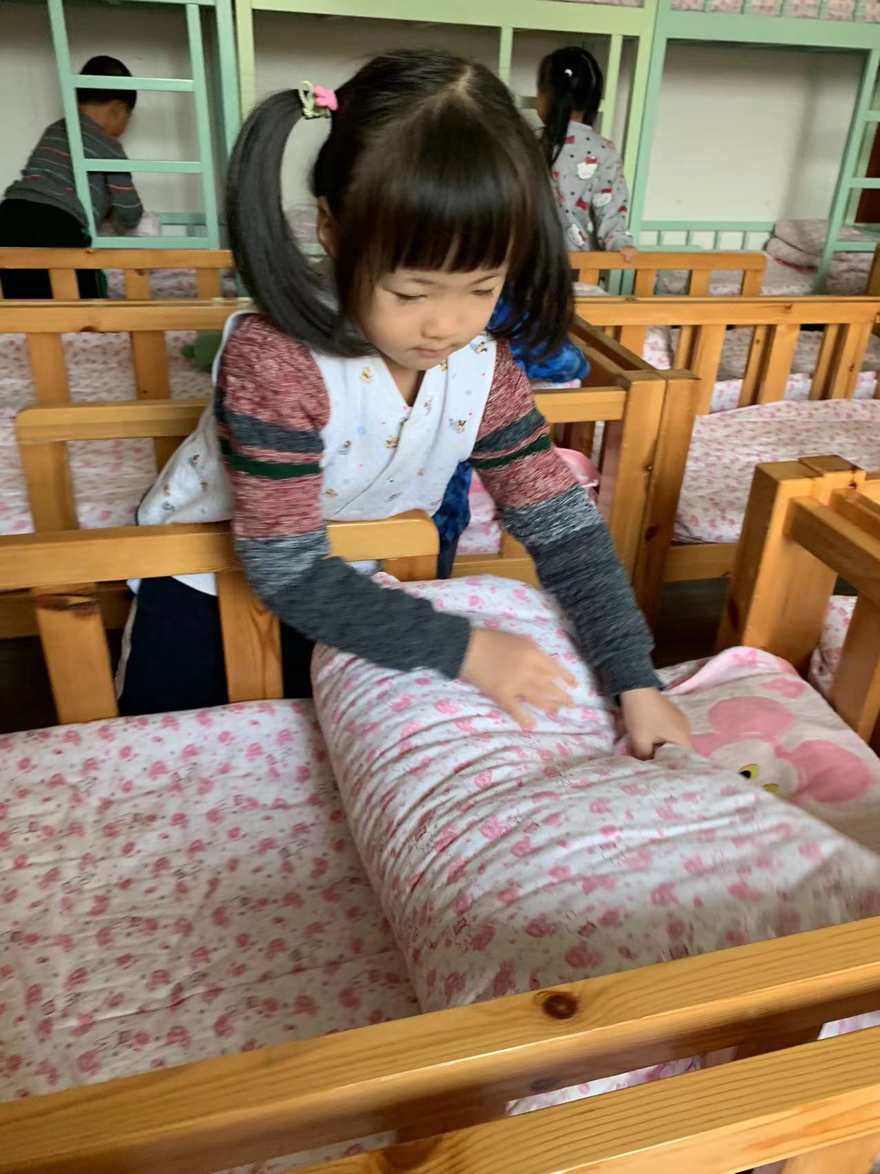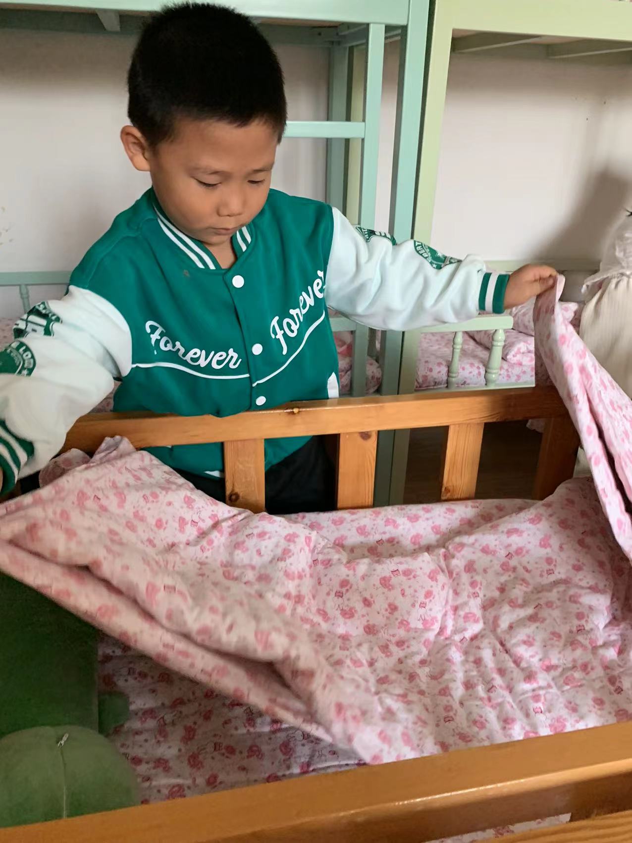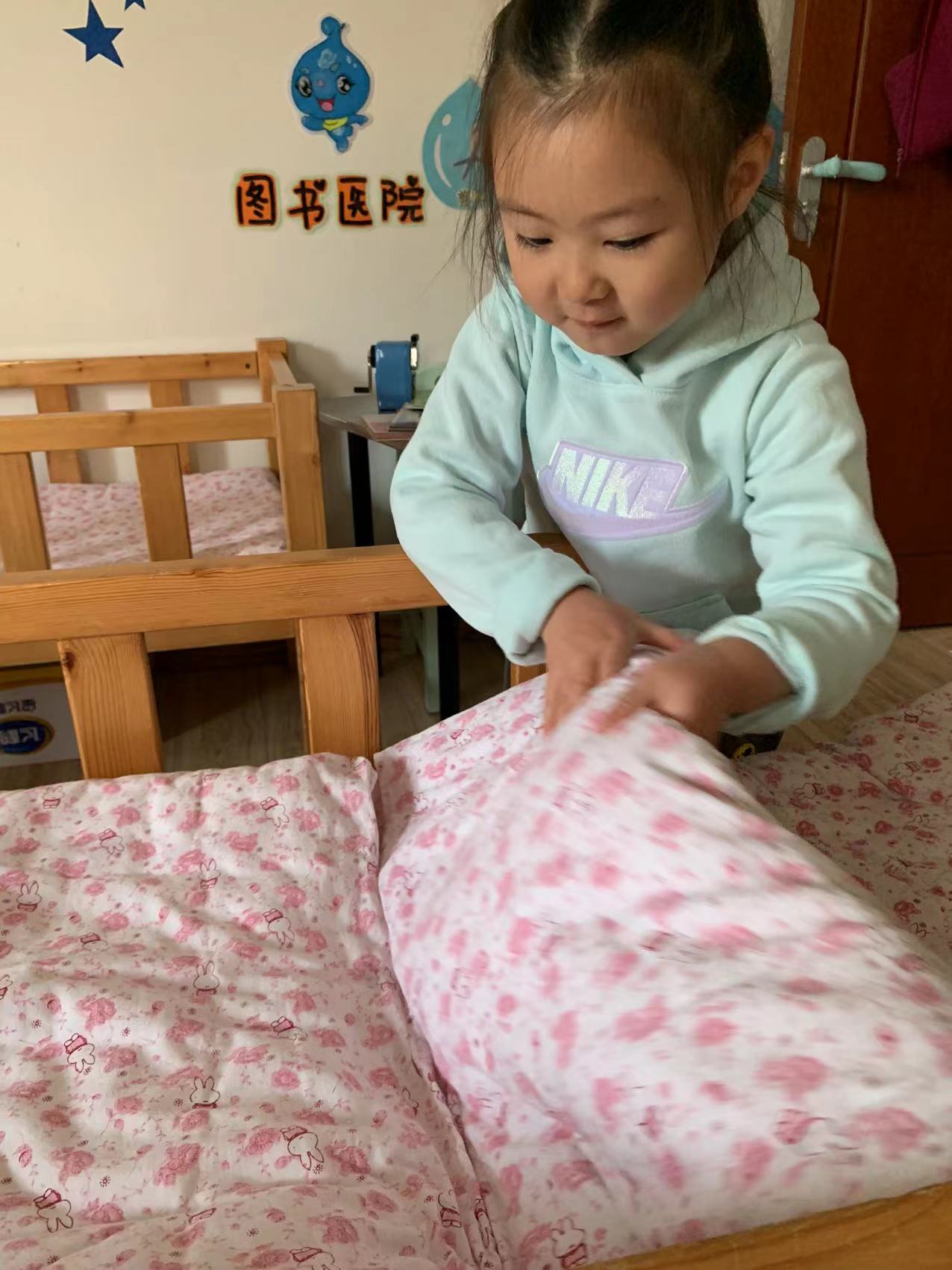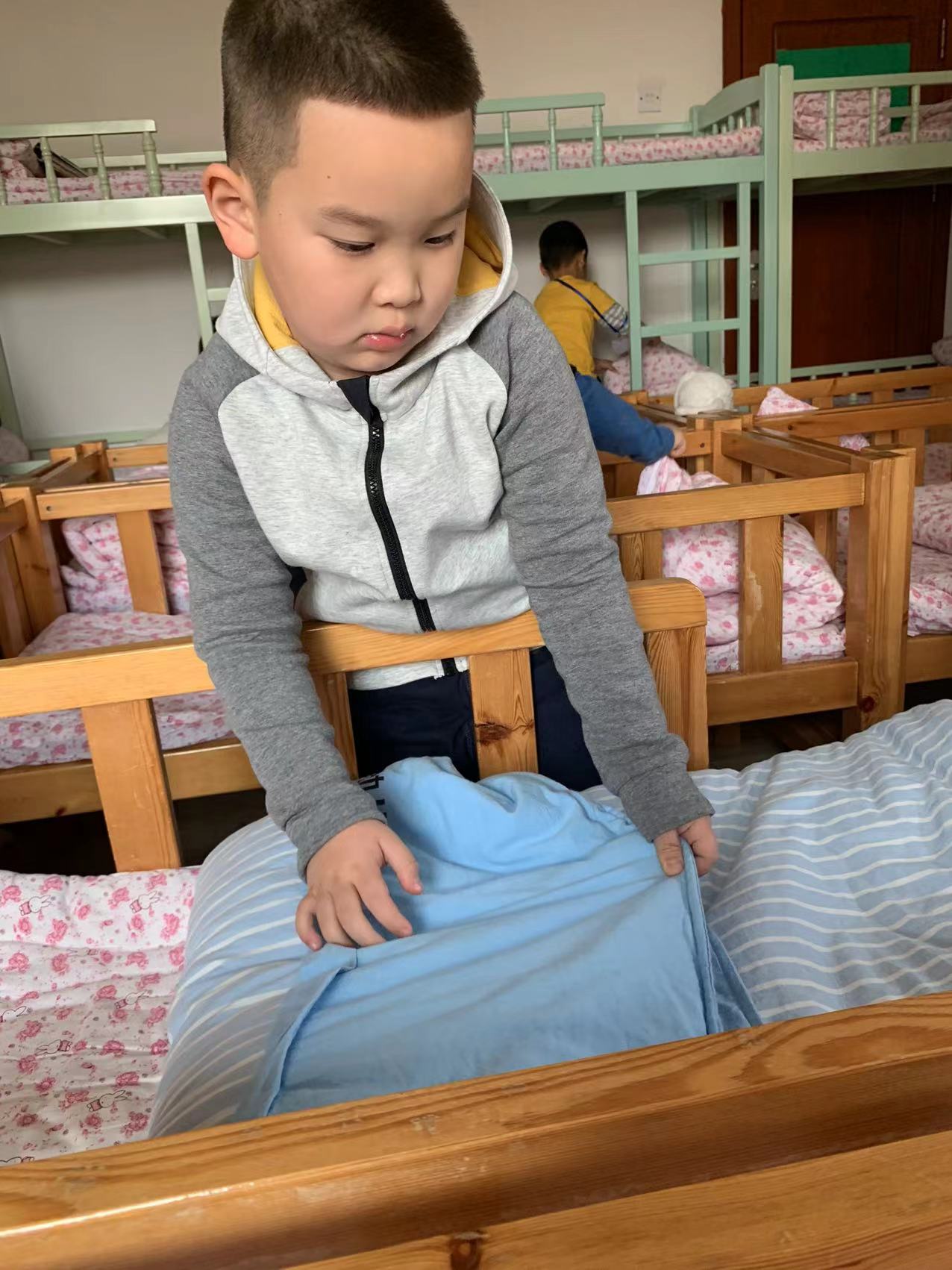 为了进一步提高幼儿的生活自理能力,学会自己的事情自己做,有效培养幼儿自我服务意识,果果一班开展了自理能力展示及比赛活动之--整理小床铺。