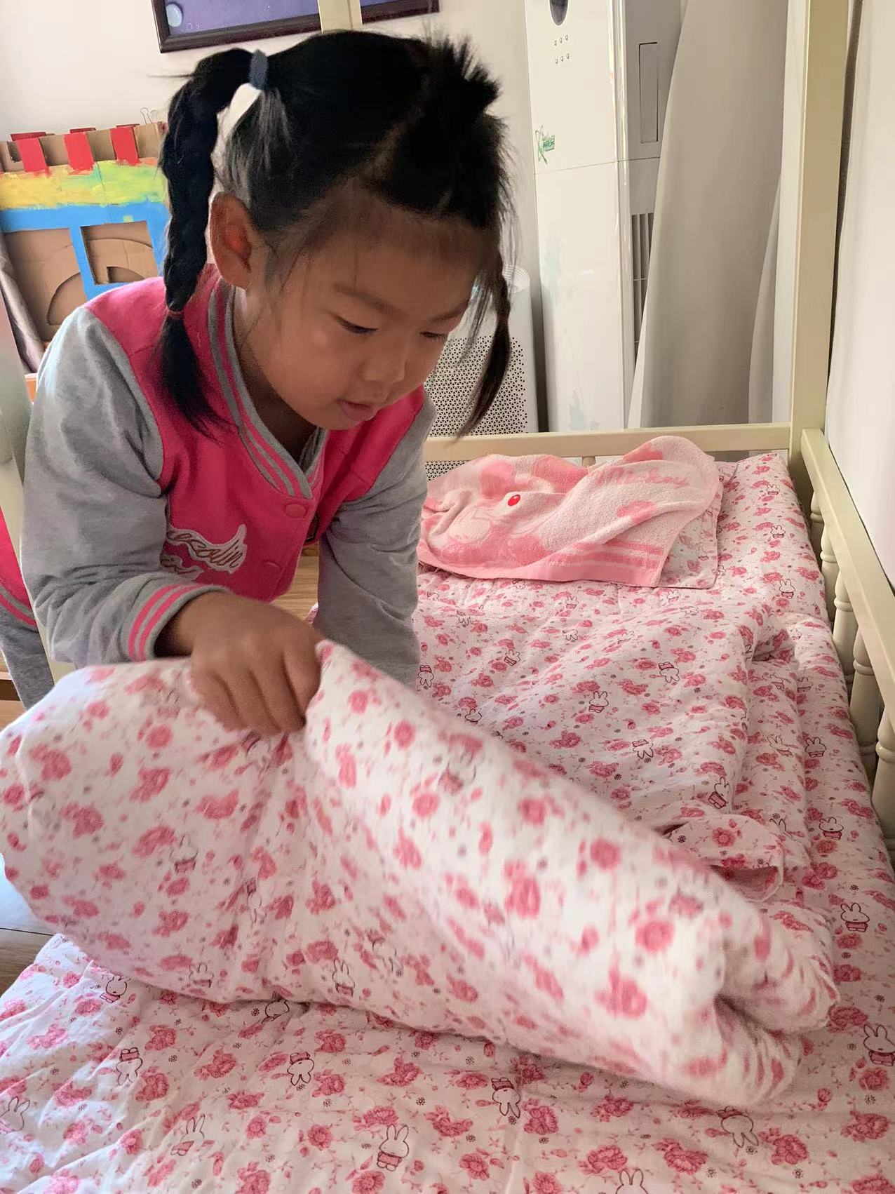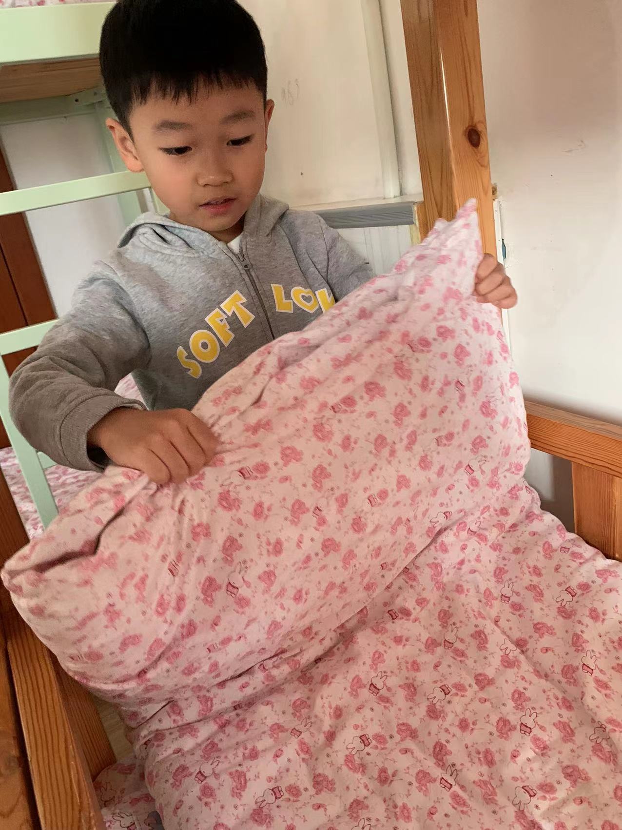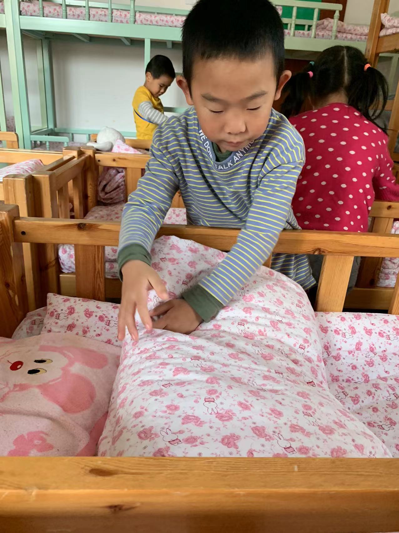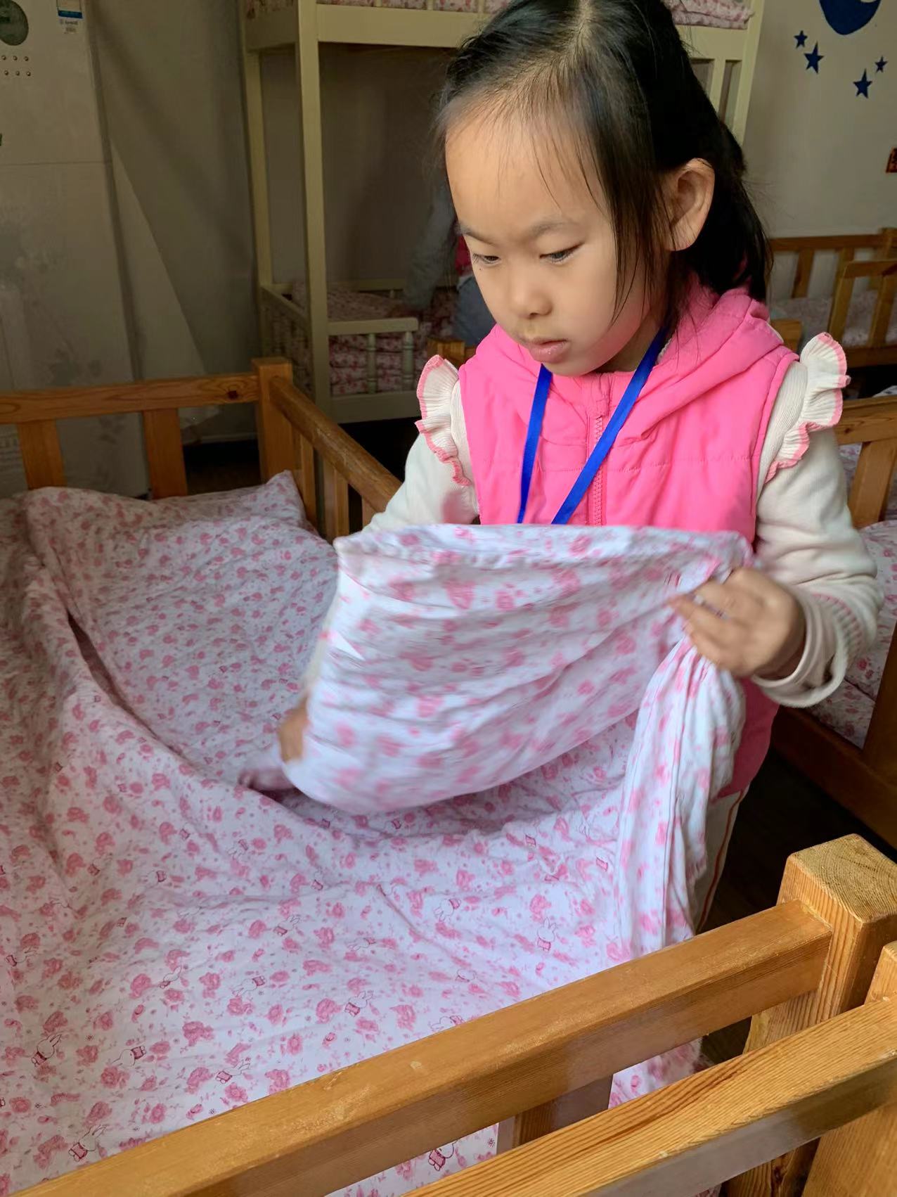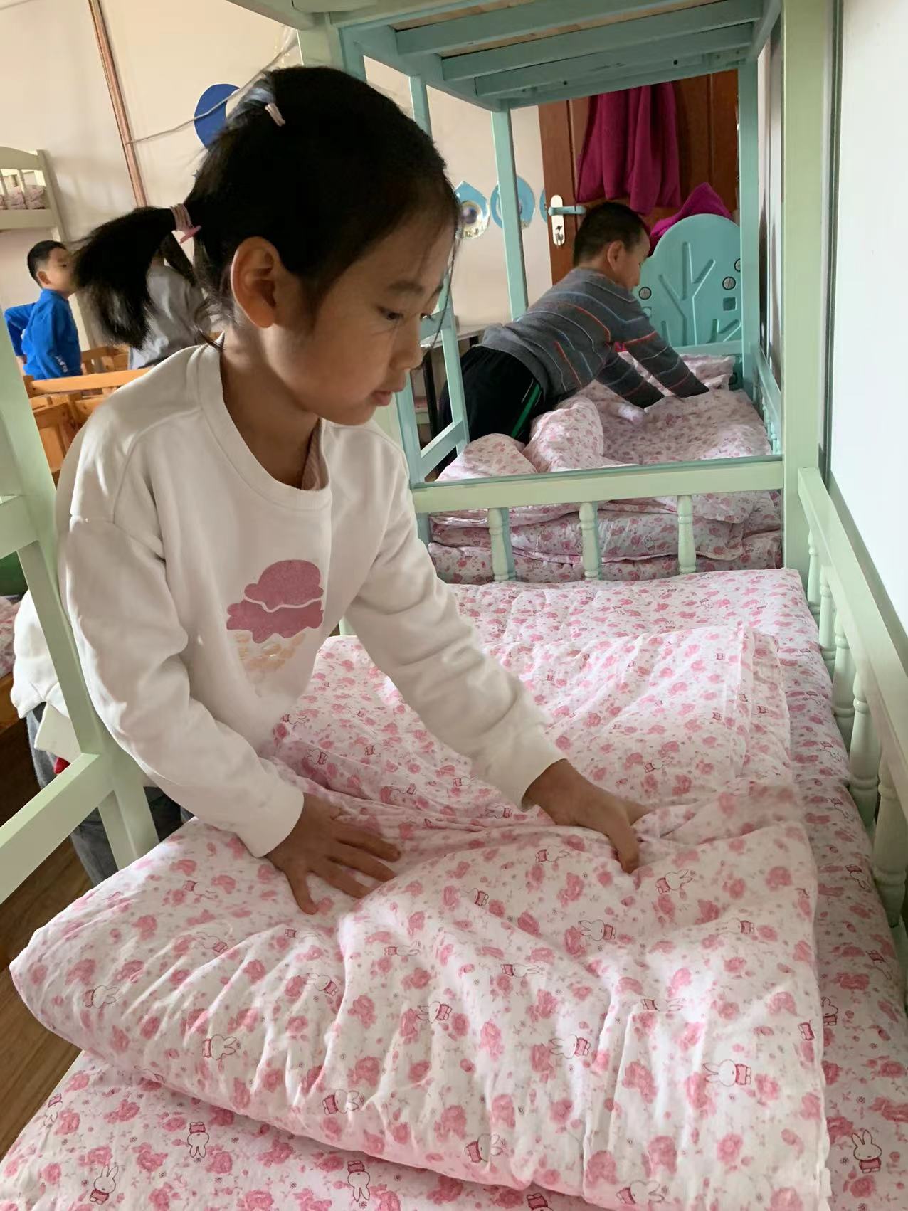为了进一步提高幼儿的生活自理能力,学会自己的事情自己做,有效培养幼儿自我服务意识,果果一班开展了自理能力展示及比赛活动之--整理小床铺。
