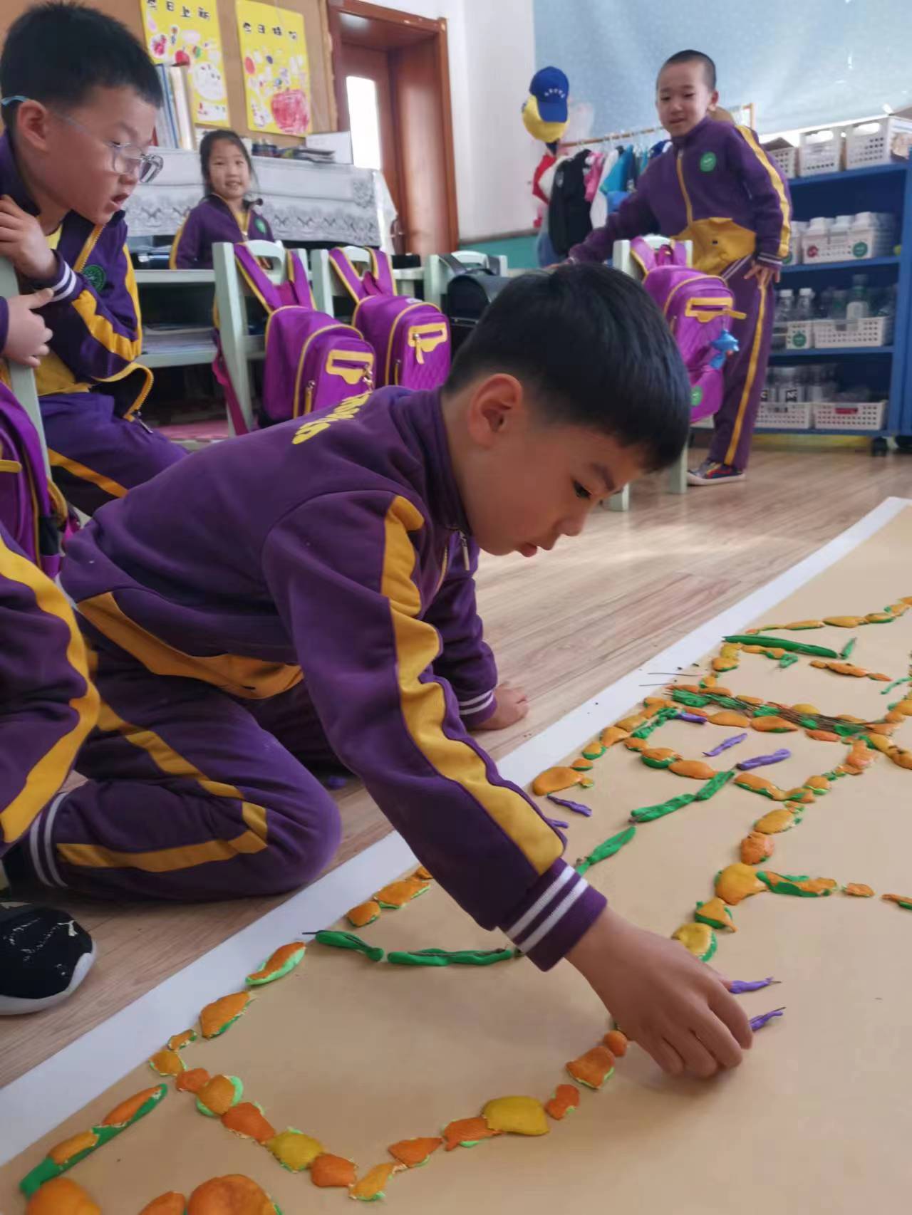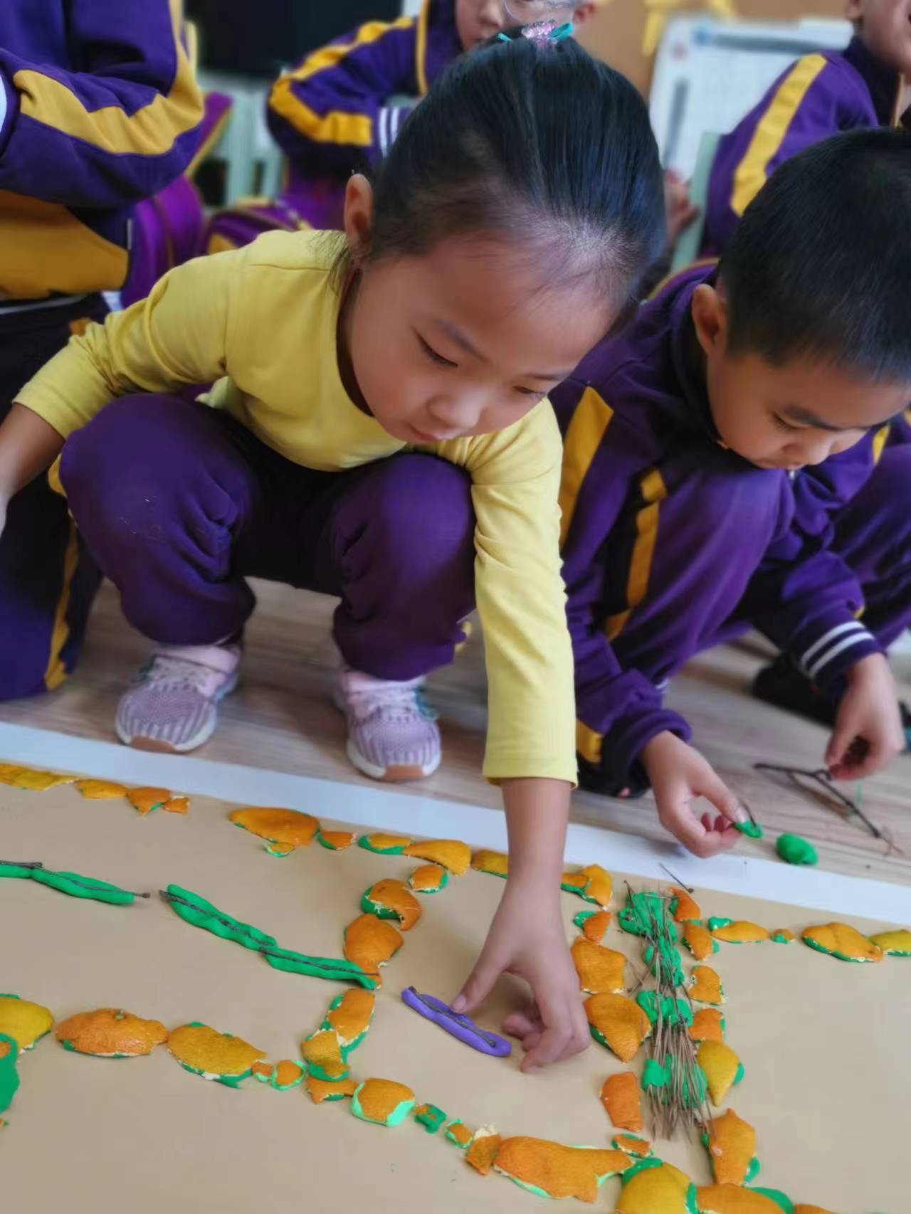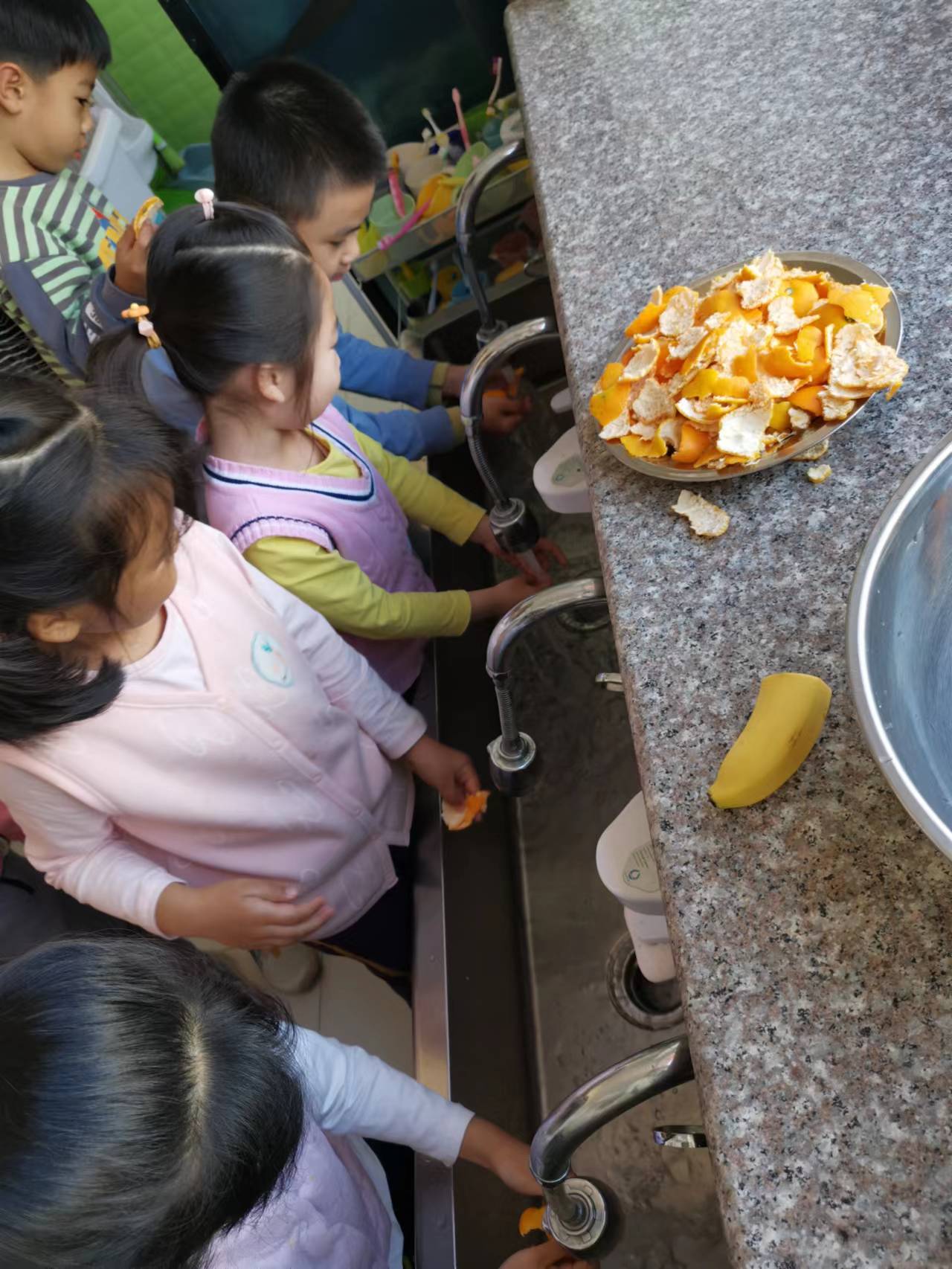 那就动手操作起来吧,在清洗橘皮的过程中,一位小朋友说:“这橘皮一块一块的好像拼图。”那我们能否用橘皮来拼搭一个百草园呢?