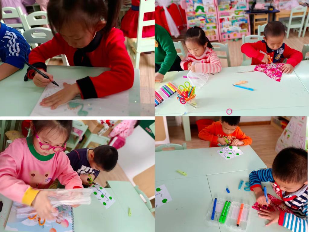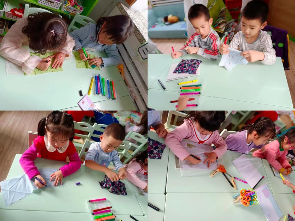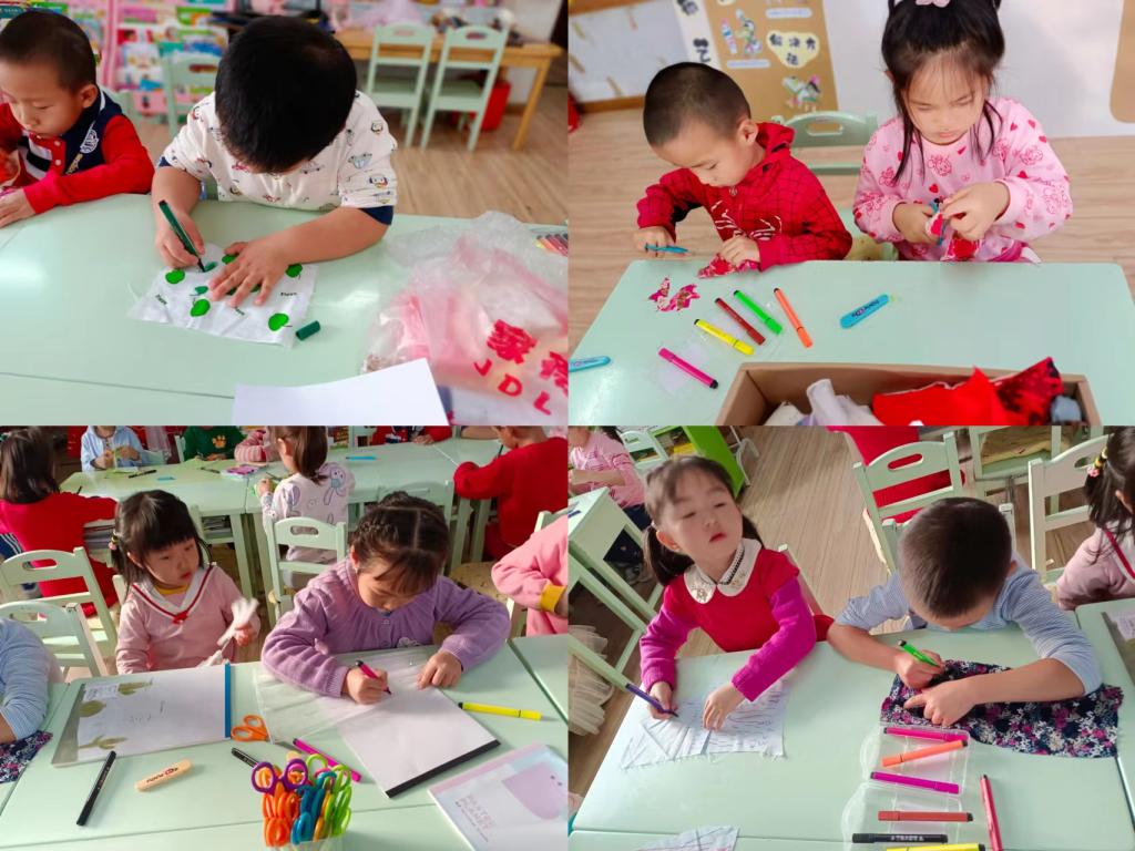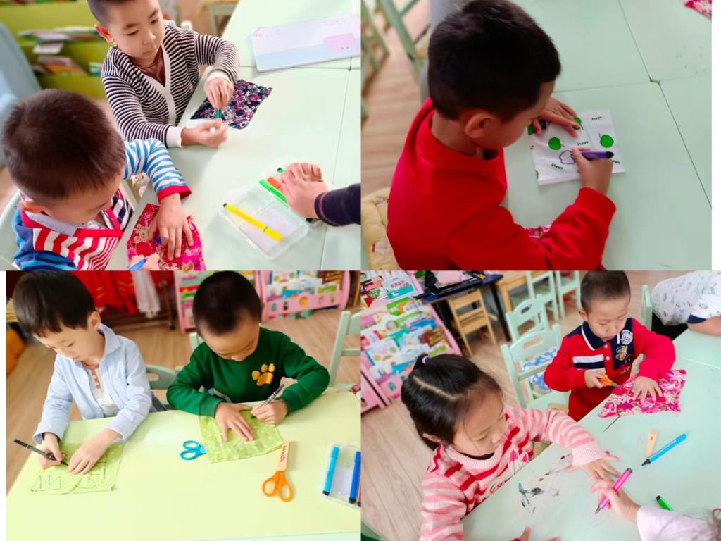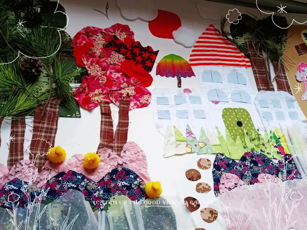 小朋友们剪裁之后,将各个部分自由组合拼装在一起,构建一幅和谐的布艺森林景象。