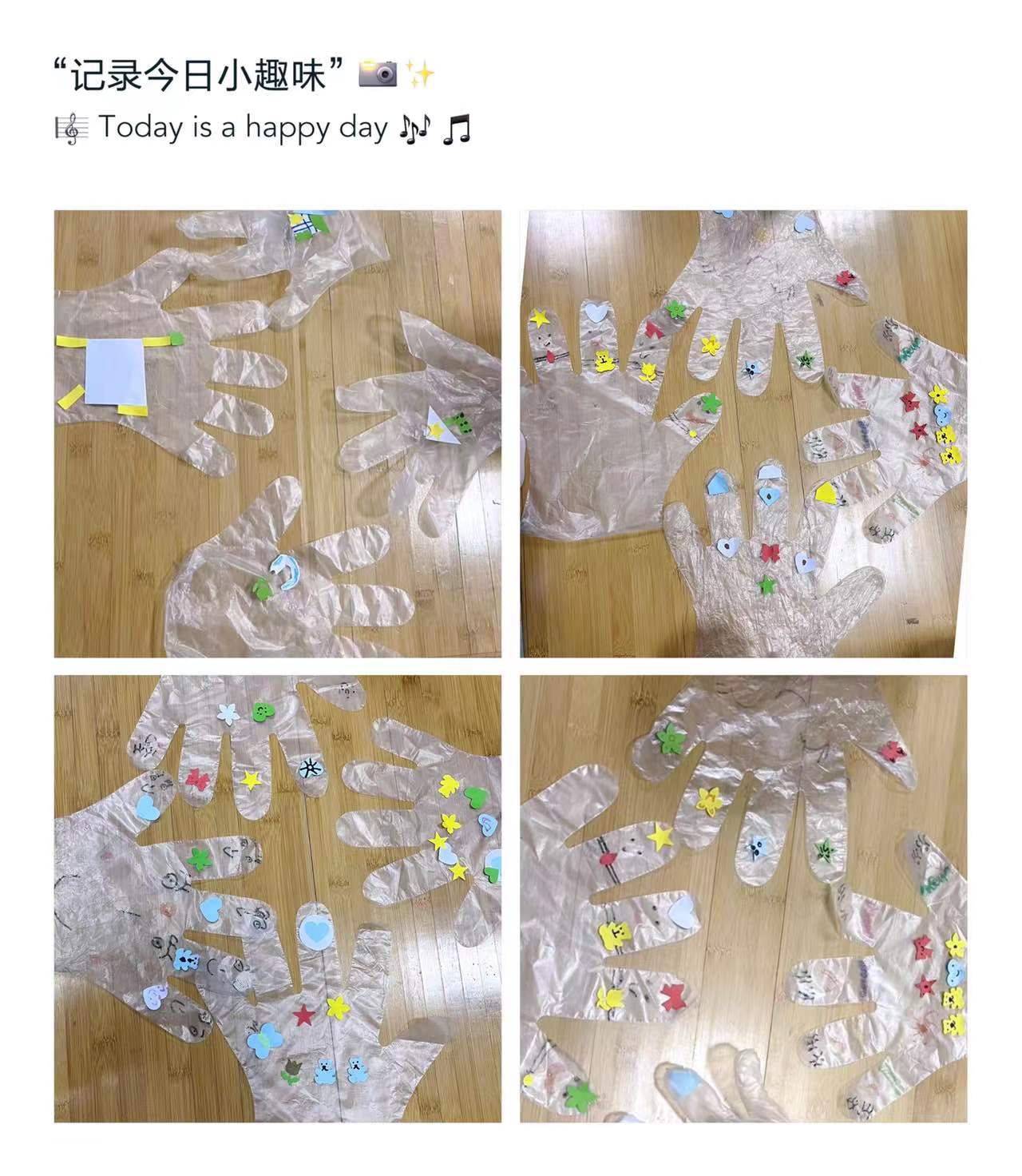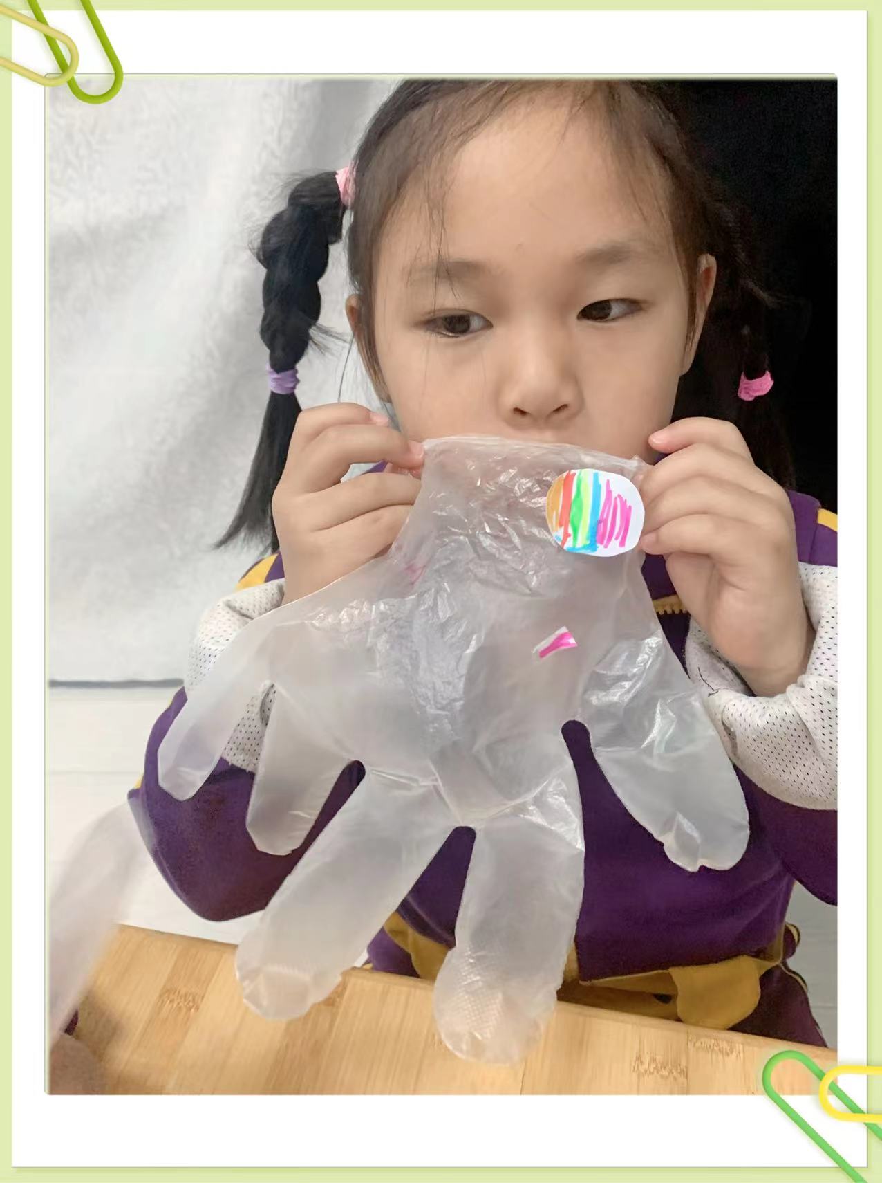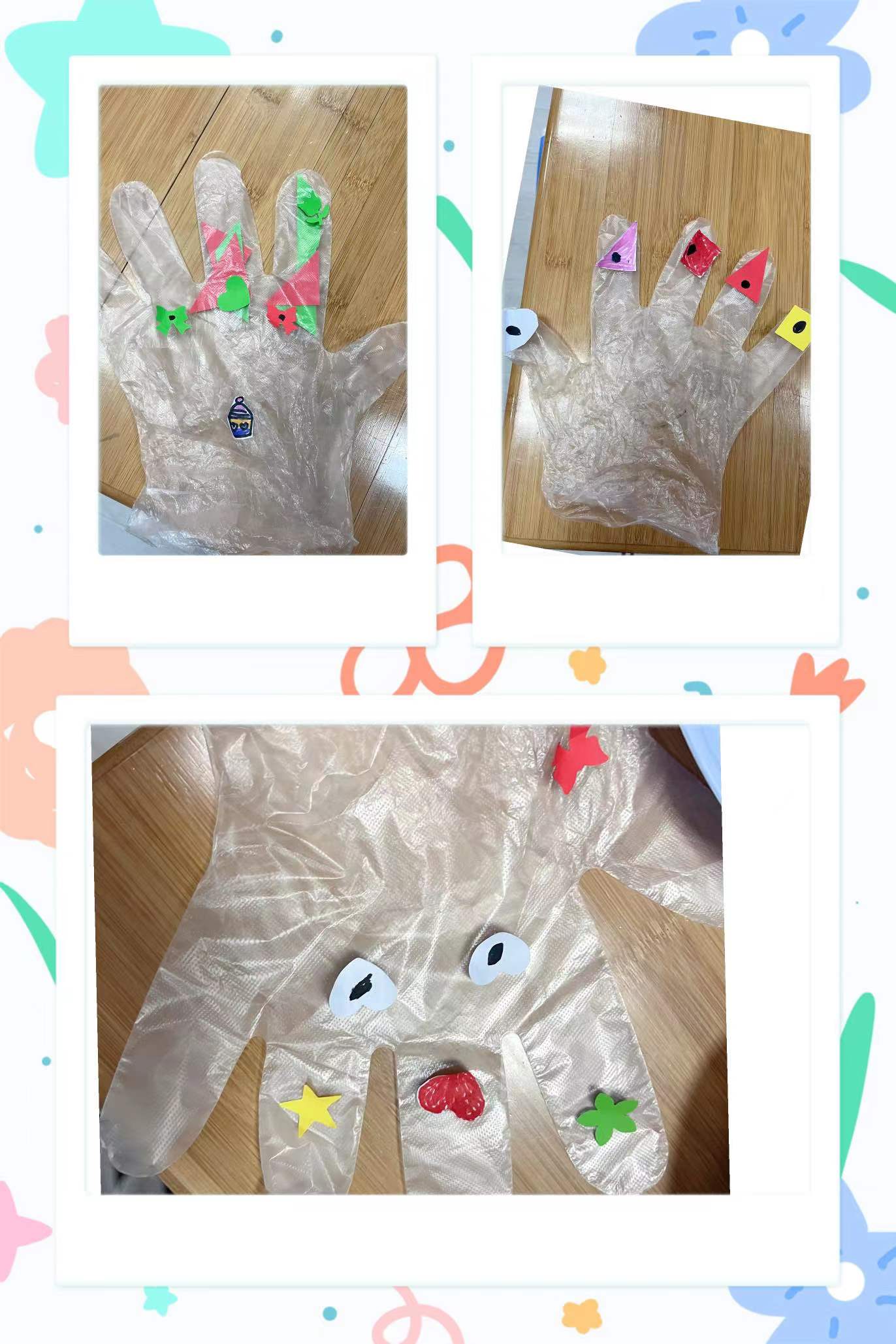 材料准备:塑料手套 彩纸图形 剪刀 胶带 彩笔