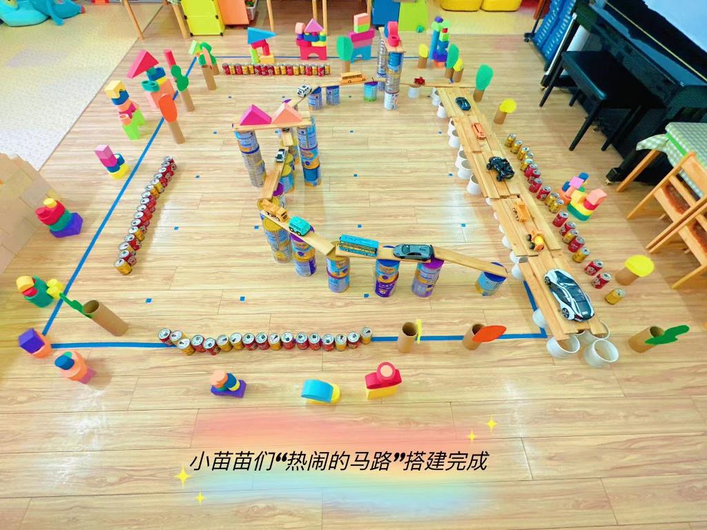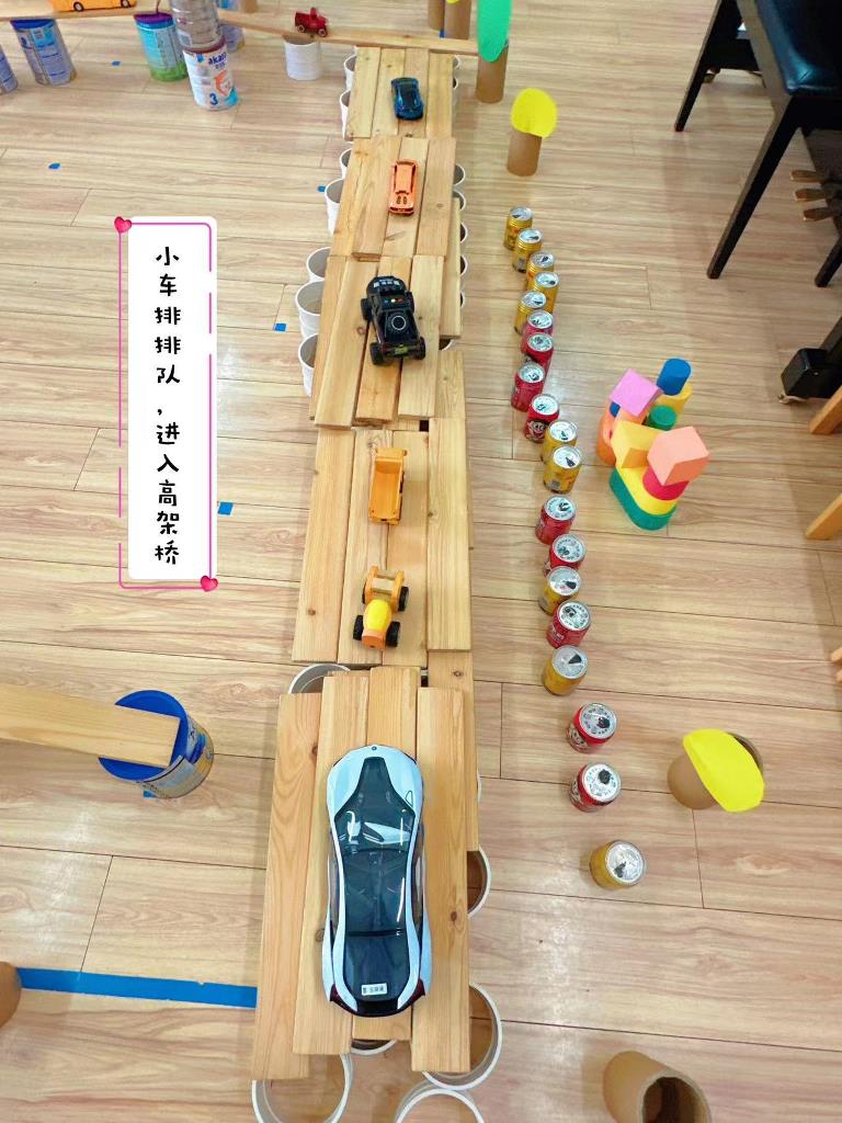 更让我们惊喜的是,孩子们主动的去汽车区拿小汽车放在马路上和桥上整个画面看上去特别丰富完整。在看着自己搭建的如此“热闹”的马路,孩子们十分开心,满满的成就感。