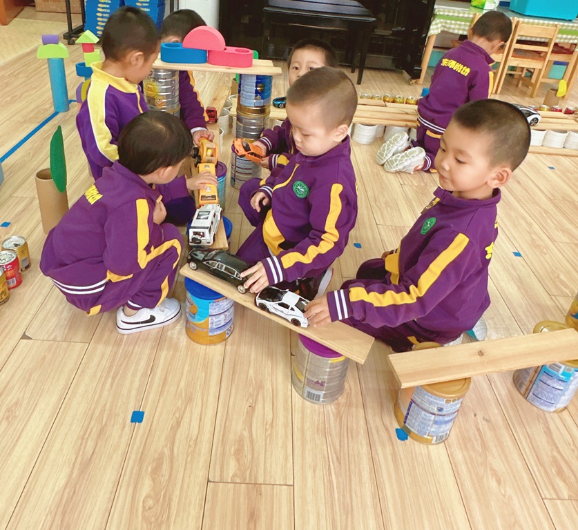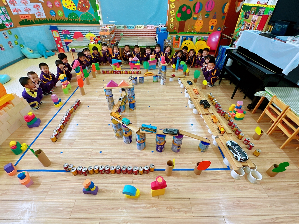 孩子们用旺仔牛奶罐先排列进行路的搭建,一条主路就出现了,然后小朋友们在主路上搭建高架桥,并在主路的两侧搭建了房子、树等。