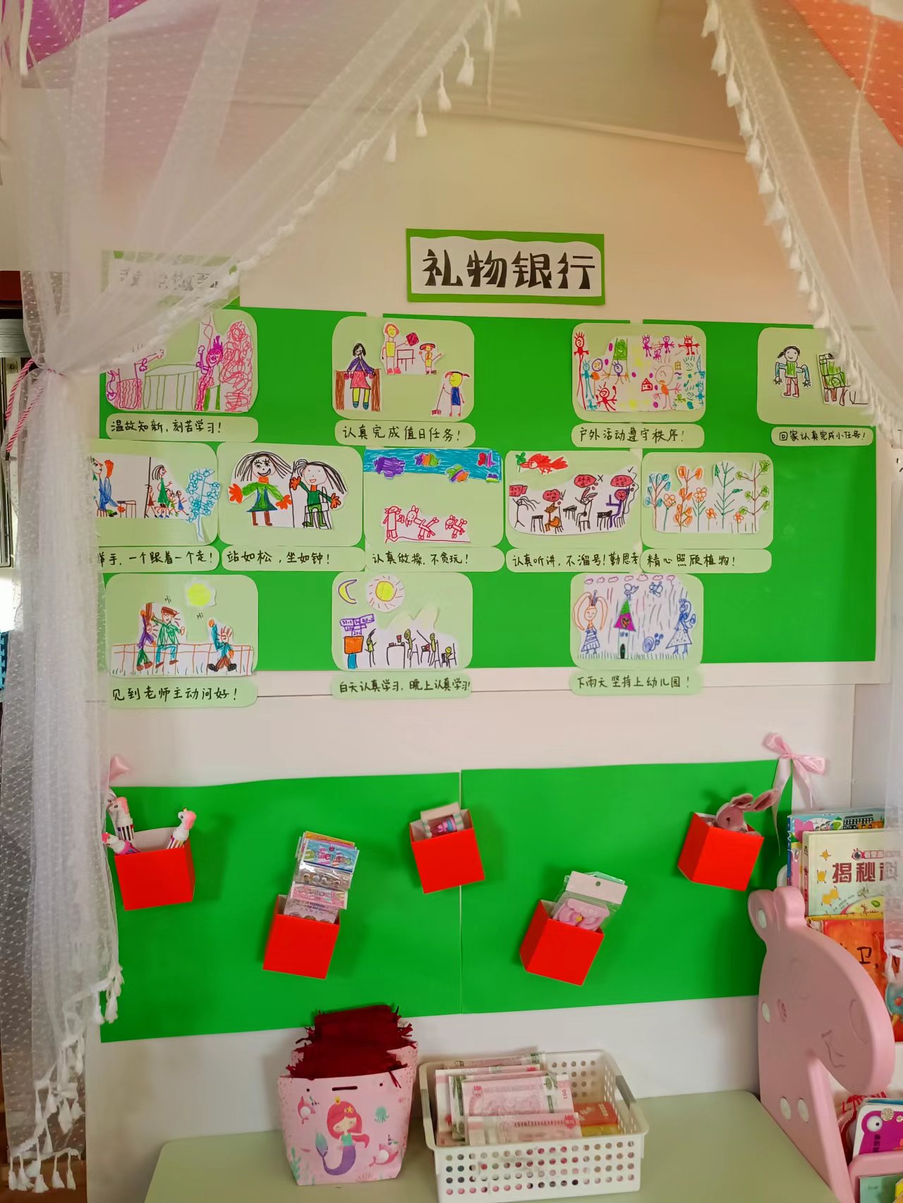 班级设立“礼物银行”,它是将班级规则与数和数量关系、数学在生活中的应用相结合,了解人民币的价值。