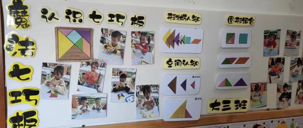 孩子们通过玩七巧板,利用常见的几何形体有创意地拼搭和画出物体的造型。