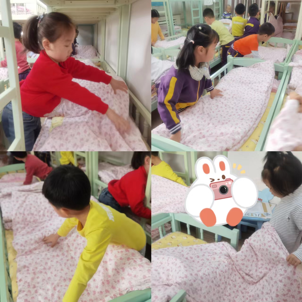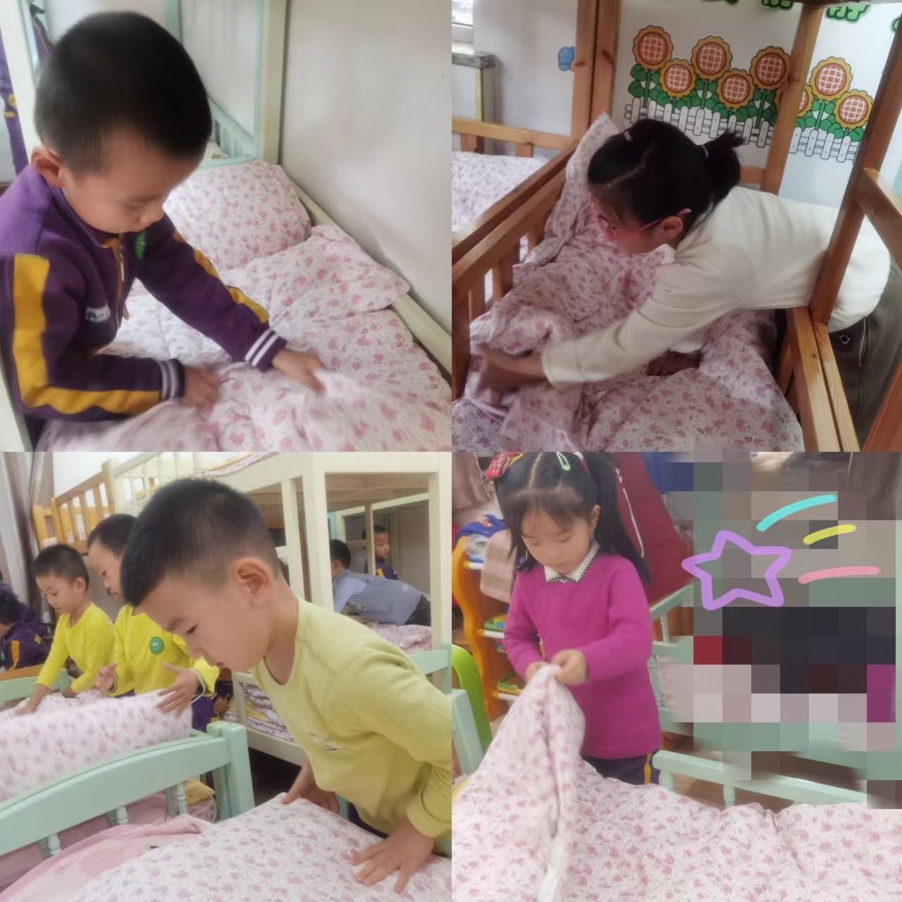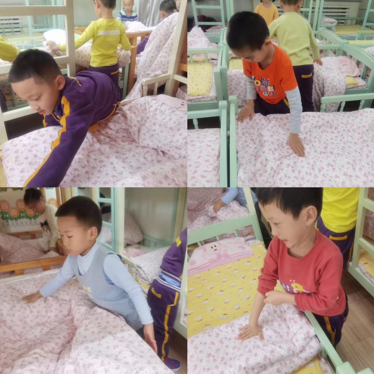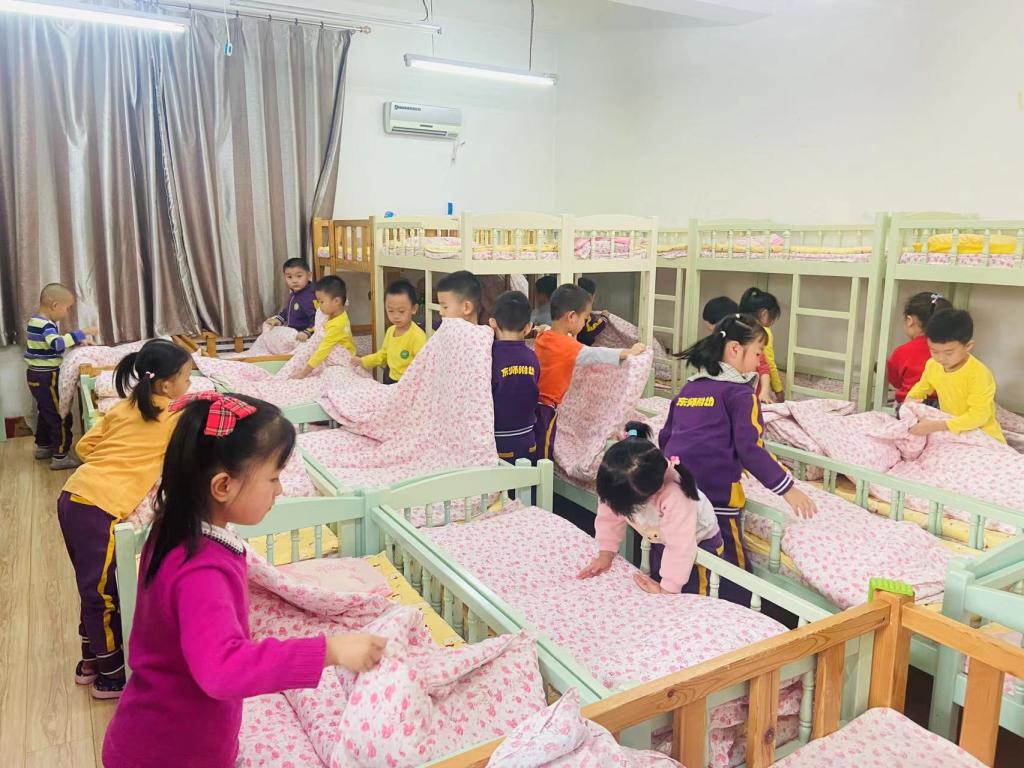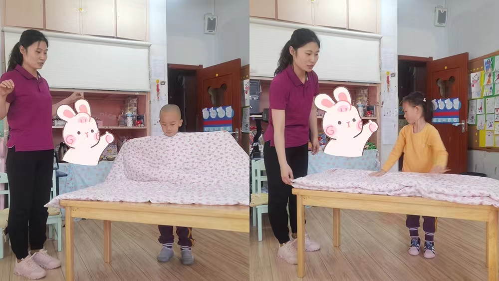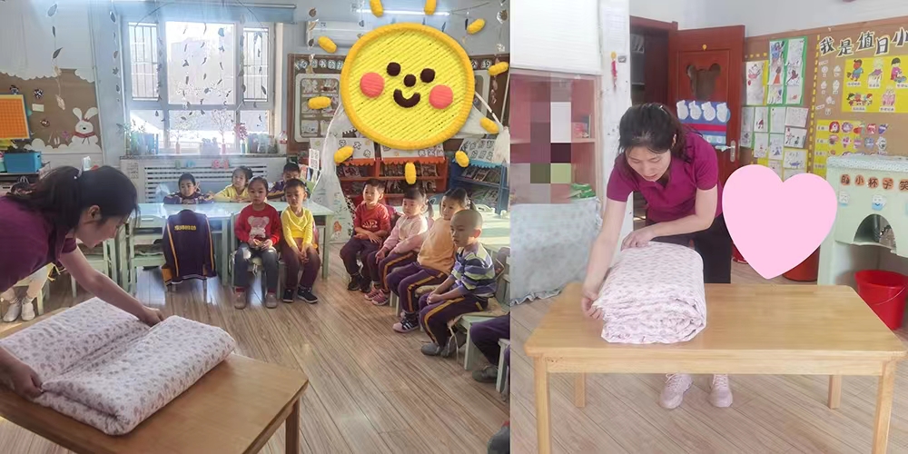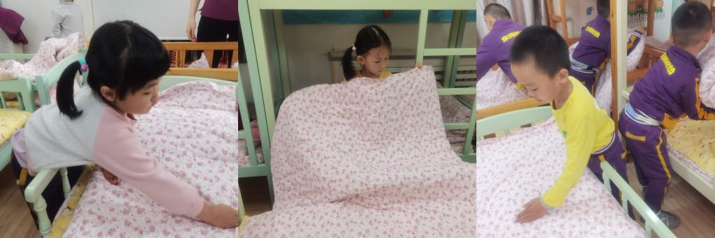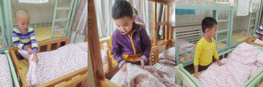 在叠被子过程中,小朋友们都很投入,这虽是生活技能的练习,也是一场专注力和耐心的锻炼和考验。