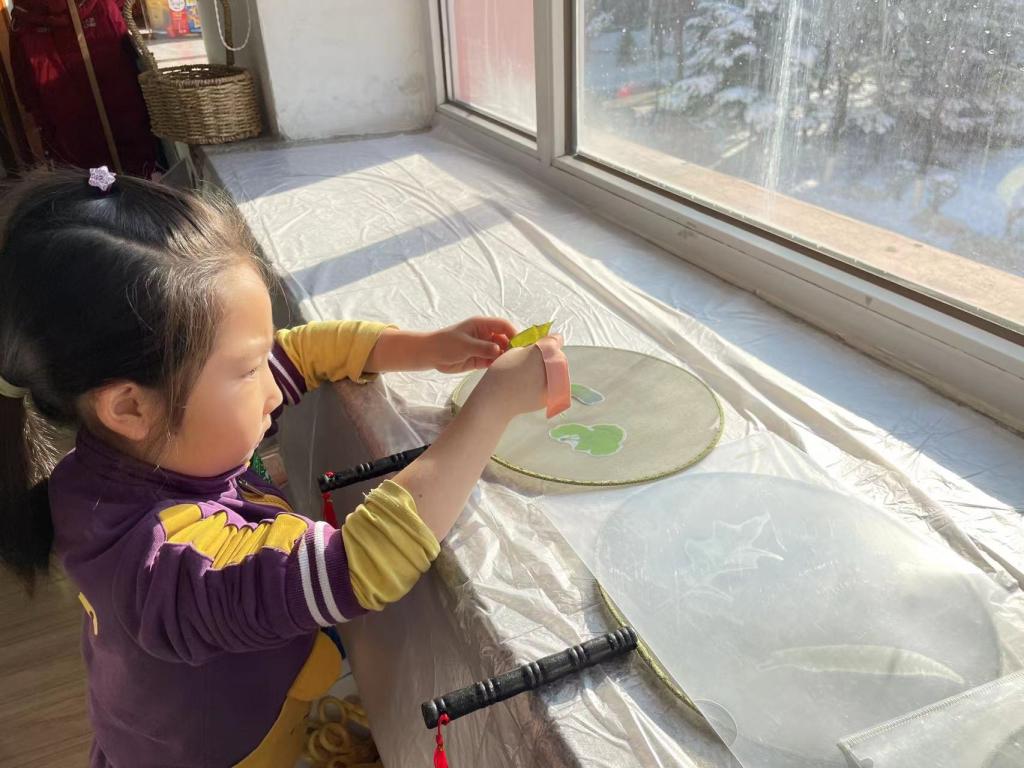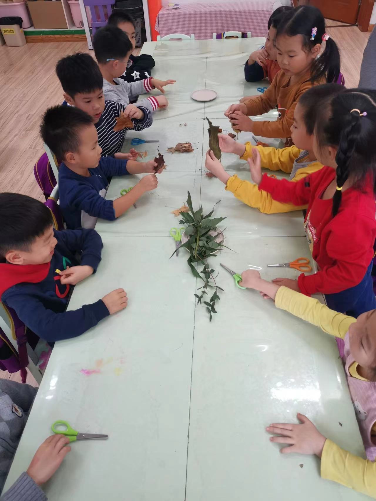 “把树叶用塑料膜压一下,装饰在幼儿园里,我们每天都能看到它。”