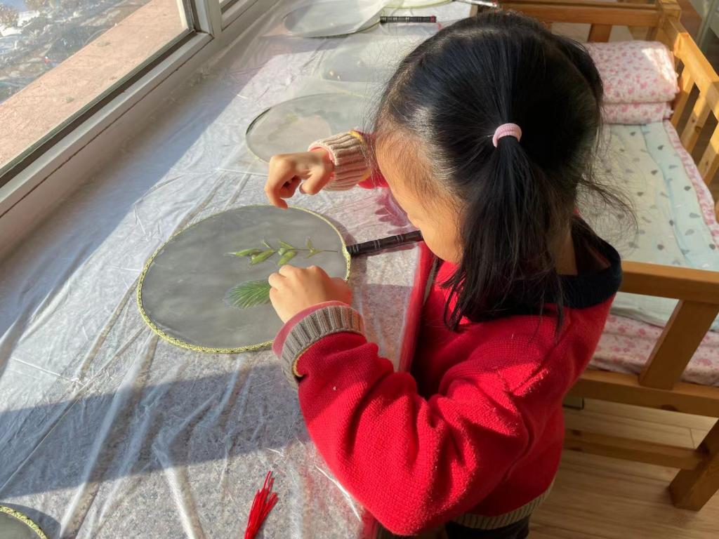 将两种溶液1:1混合,用刷子蘸取溶液涂抹于团扇上。