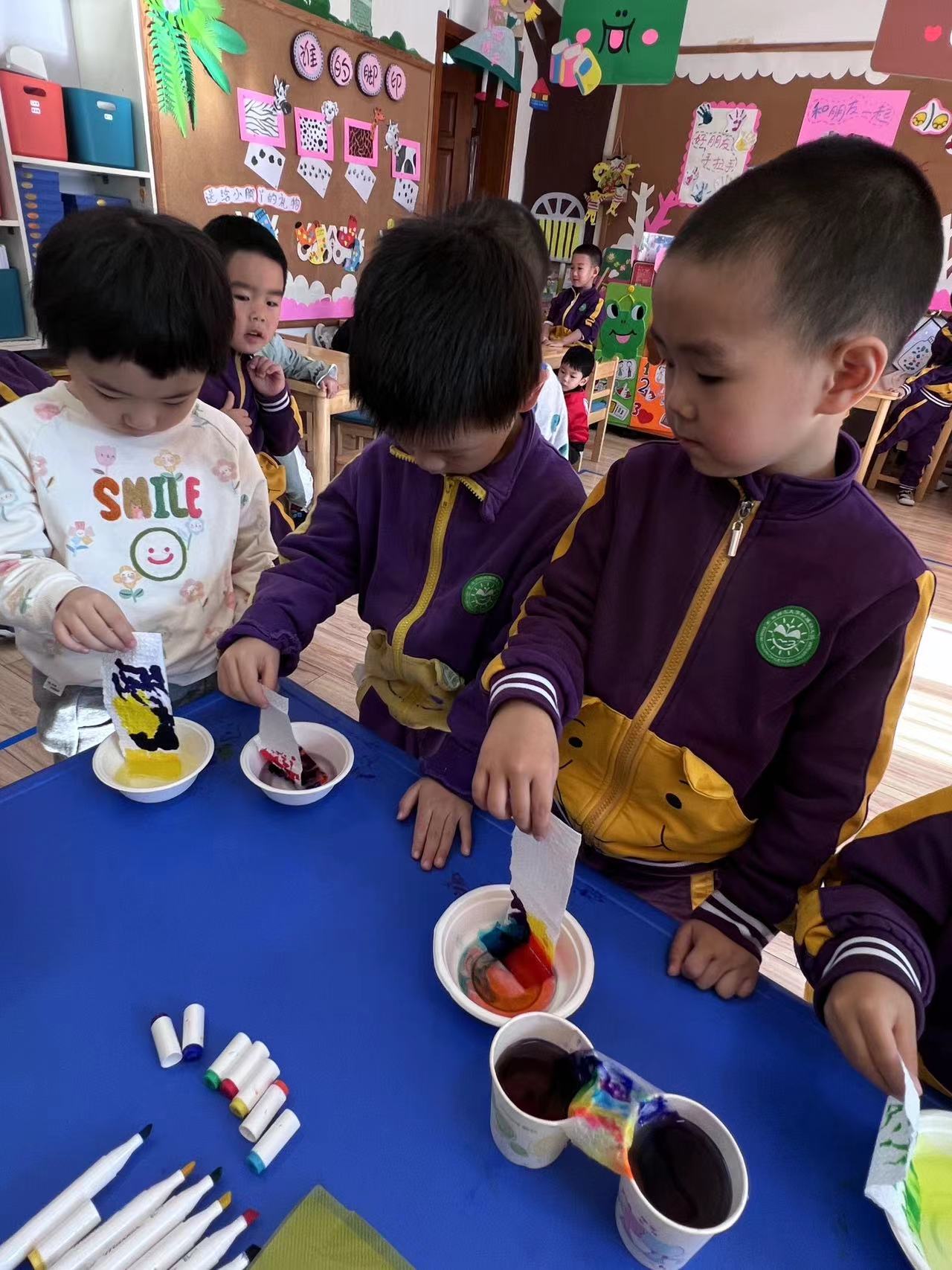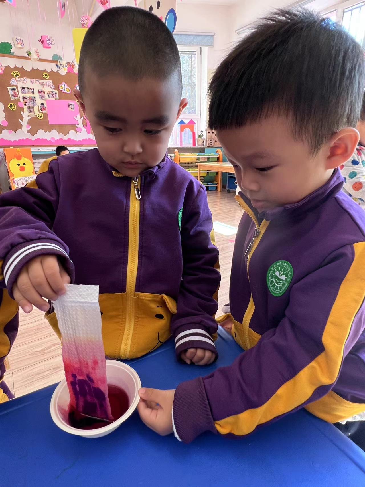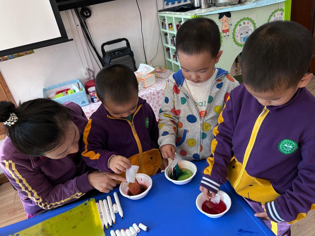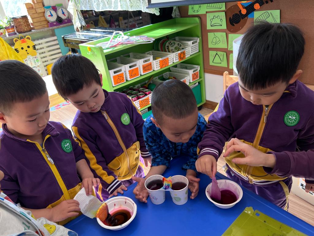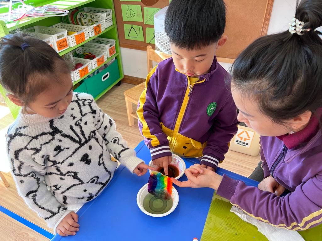 让我们一起来探索吧!我们需要水彩笔、水、纸杯、纸巾等材料,然后将纸杯装满水,将颜色放在水中,把纸巾两端分别放在水里,静静等待颜色沿着纸巾慢慢爬上来。神奇的现象出现了,“彩虹桥”来喽!
