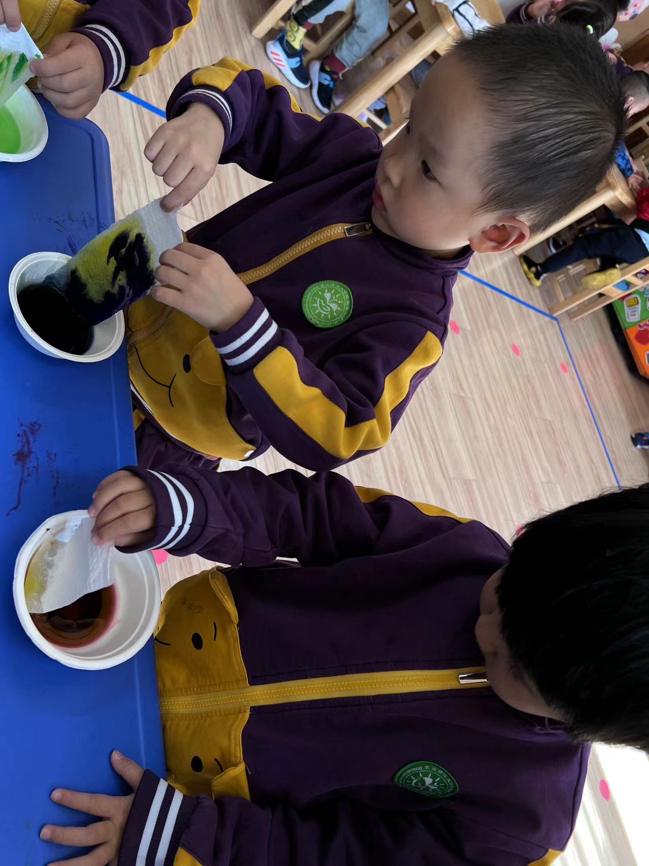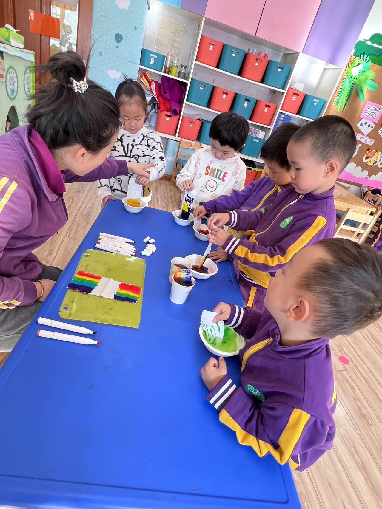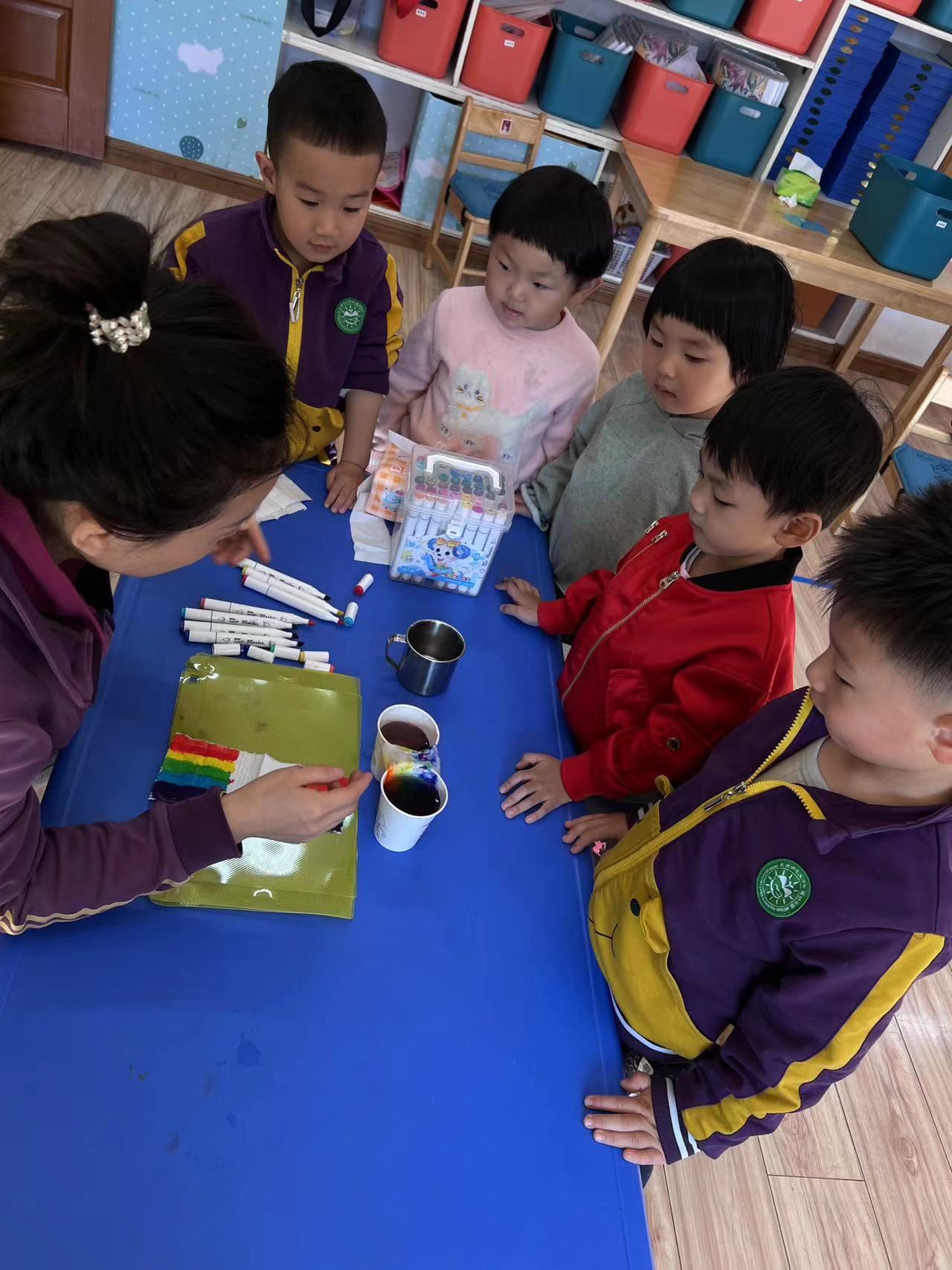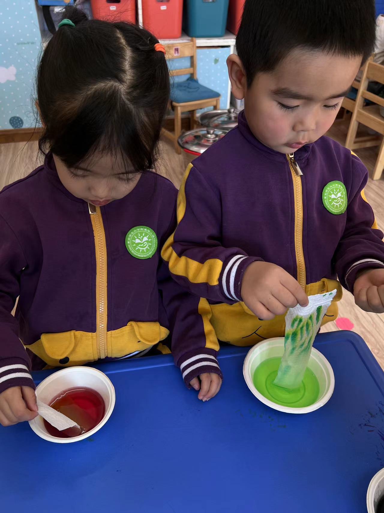 让我们一起来探索吧!我们需要水彩笔、水、纸杯、纸巾等材料,然后将纸杯装满水,将颜色放在水中,把纸巾两端分别放在水里,静静等待颜色沿着纸巾慢慢爬上来。神奇的现象出现了,“彩虹桥”来喽!