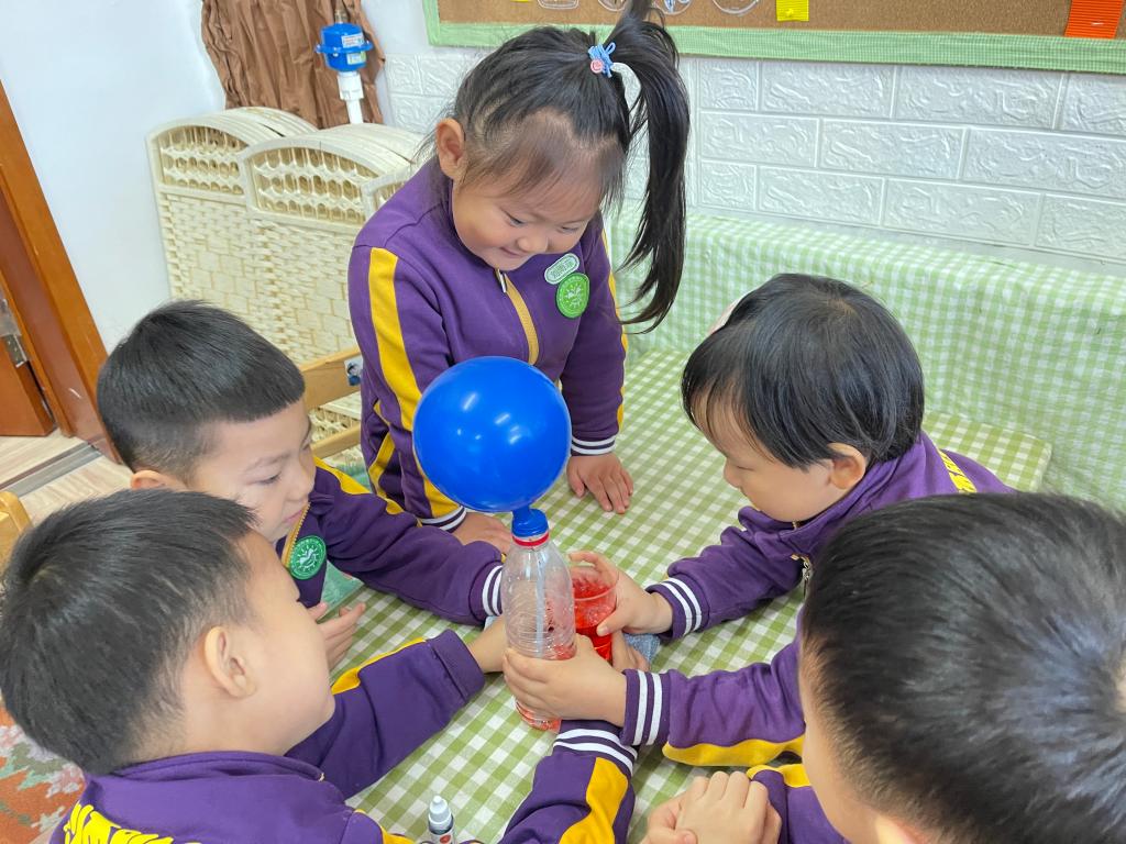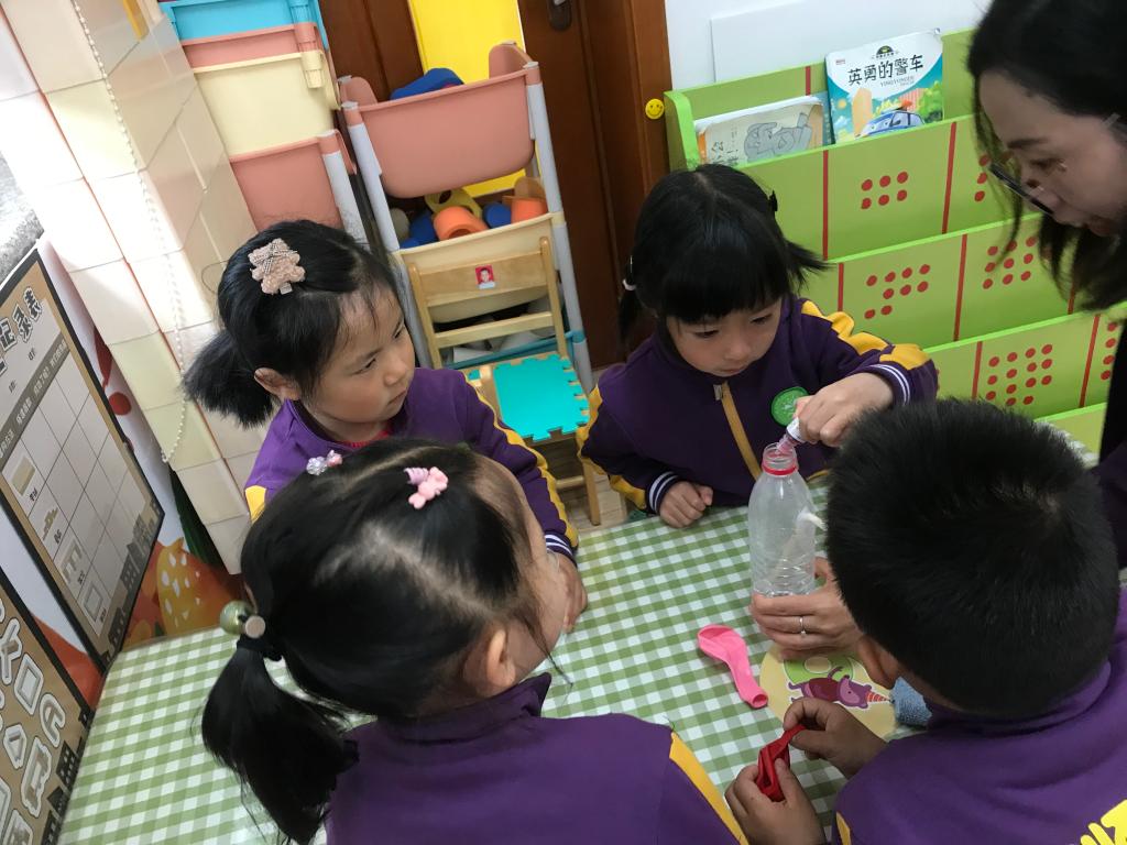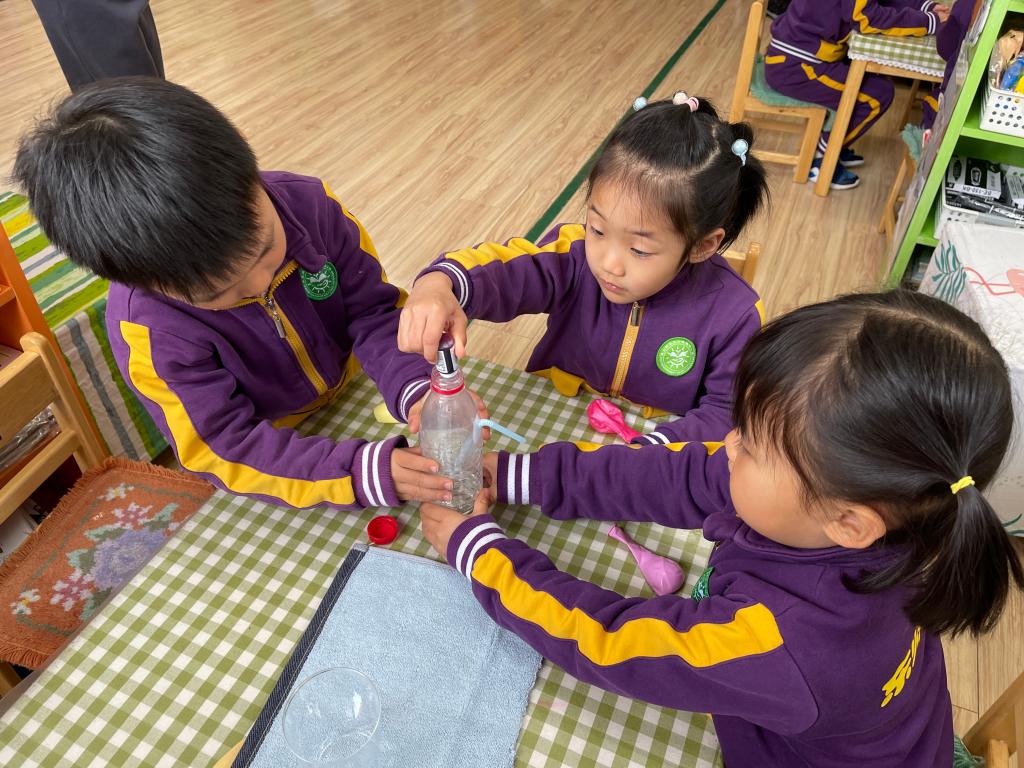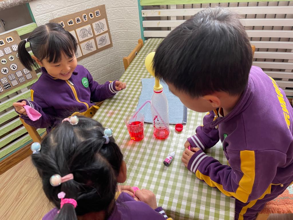 文文妈妈为本次科普活动做了精心的准备,为小朋友们带来了丰富的探究材料,如:矿泉水瓶、食用色素、杯子、气球、打气筒等,可千万别小看这些在生活中寻常可见的物品,它们的组合让孩子们大感神奇。