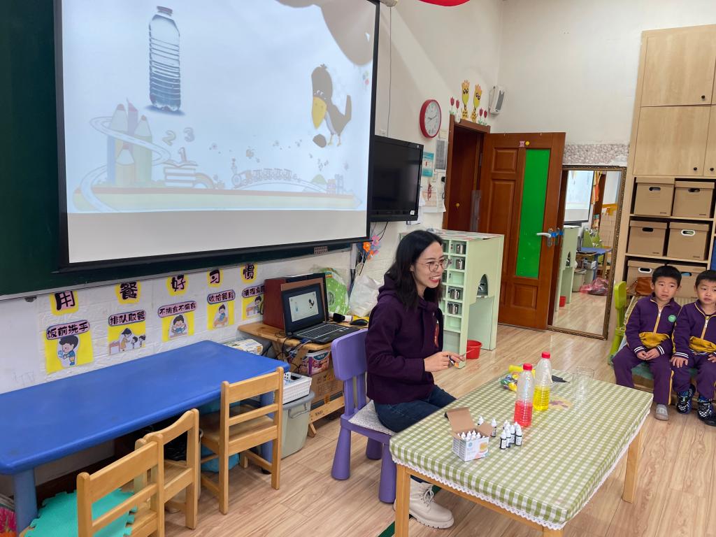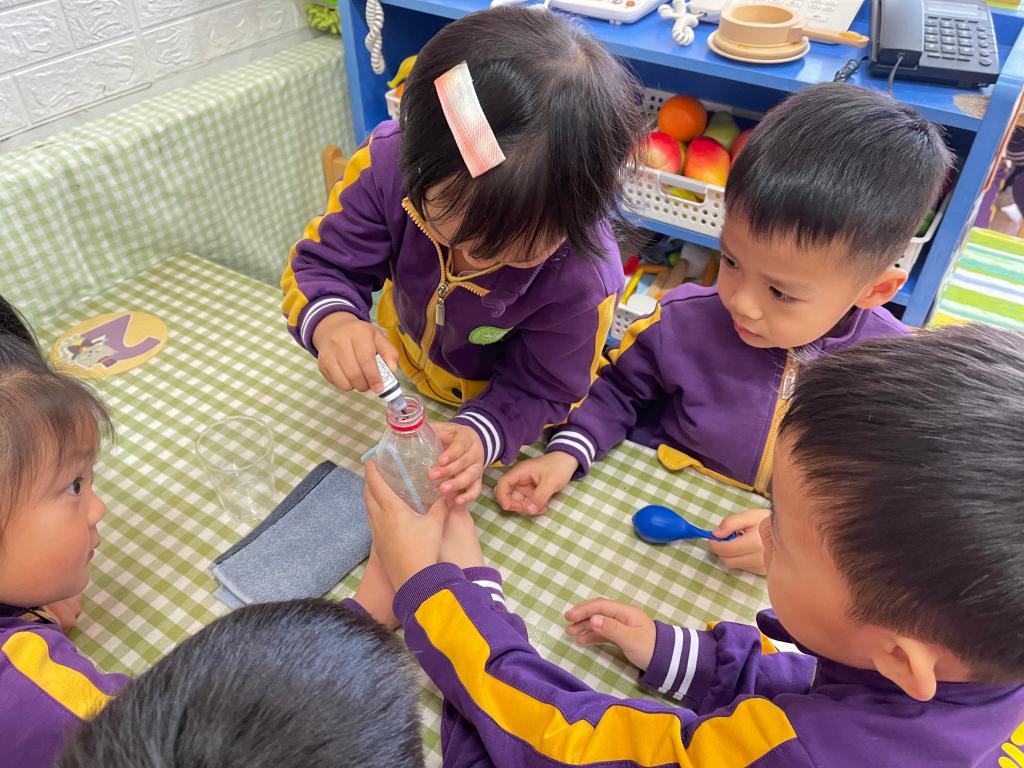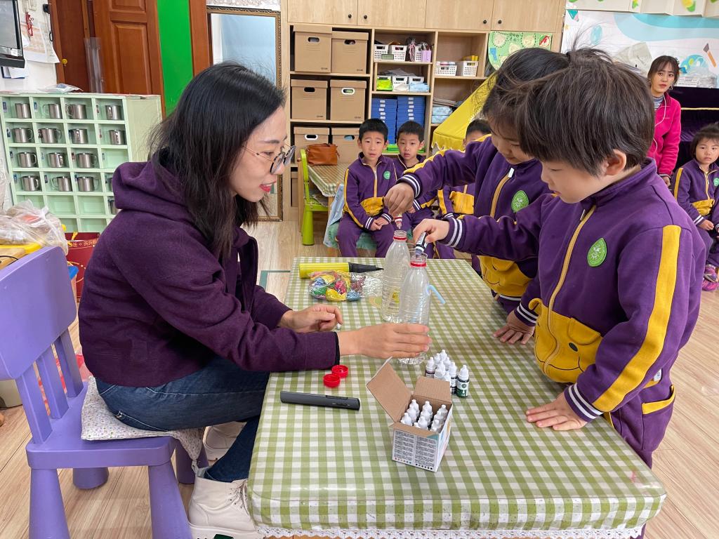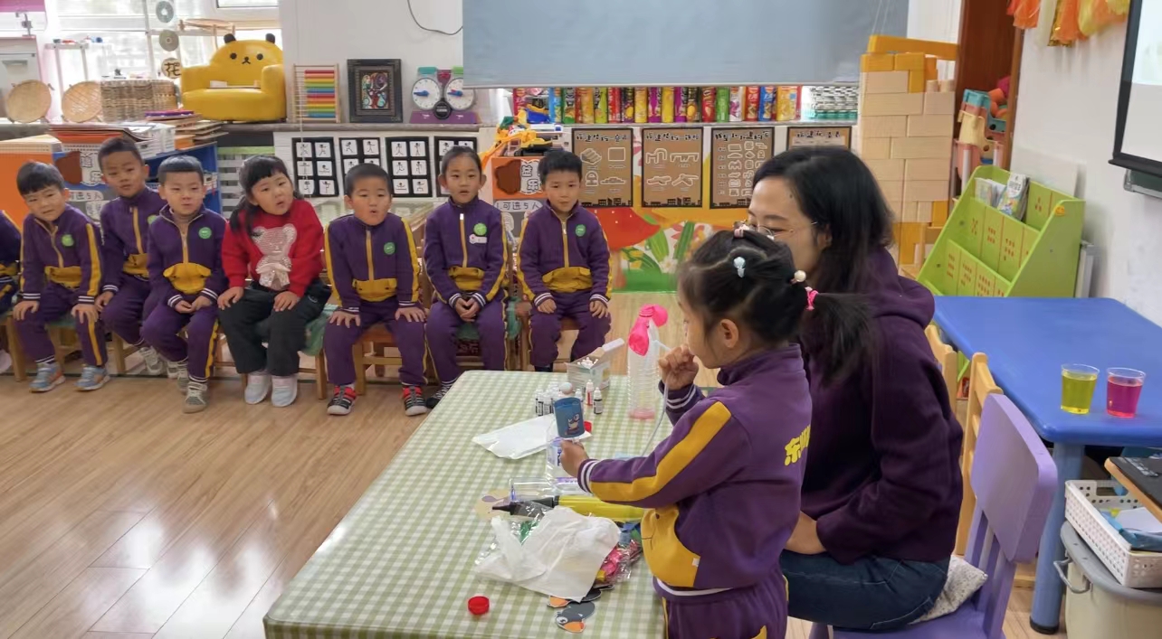 文文妈妈为本次科普活动做了精心的准备,为小朋友们带来了丰富的探究材料,如:矿泉水瓶、食用色素、杯子、气球、打气筒等,可千万别小看这些在生活中寻常可见的物品,它们的组合让孩子们大感神奇。