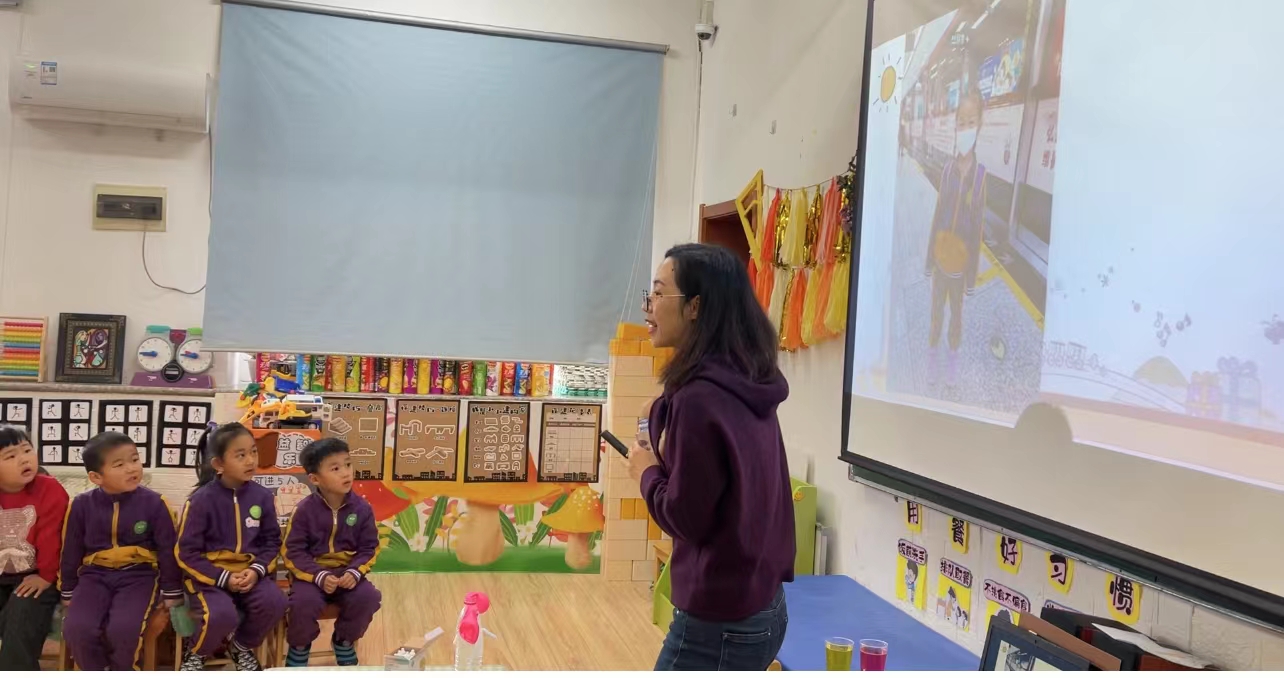 小朋友们惊喜地发现屏幕上播放的是馨馨在地铁站等待乘坐地铁的照片。