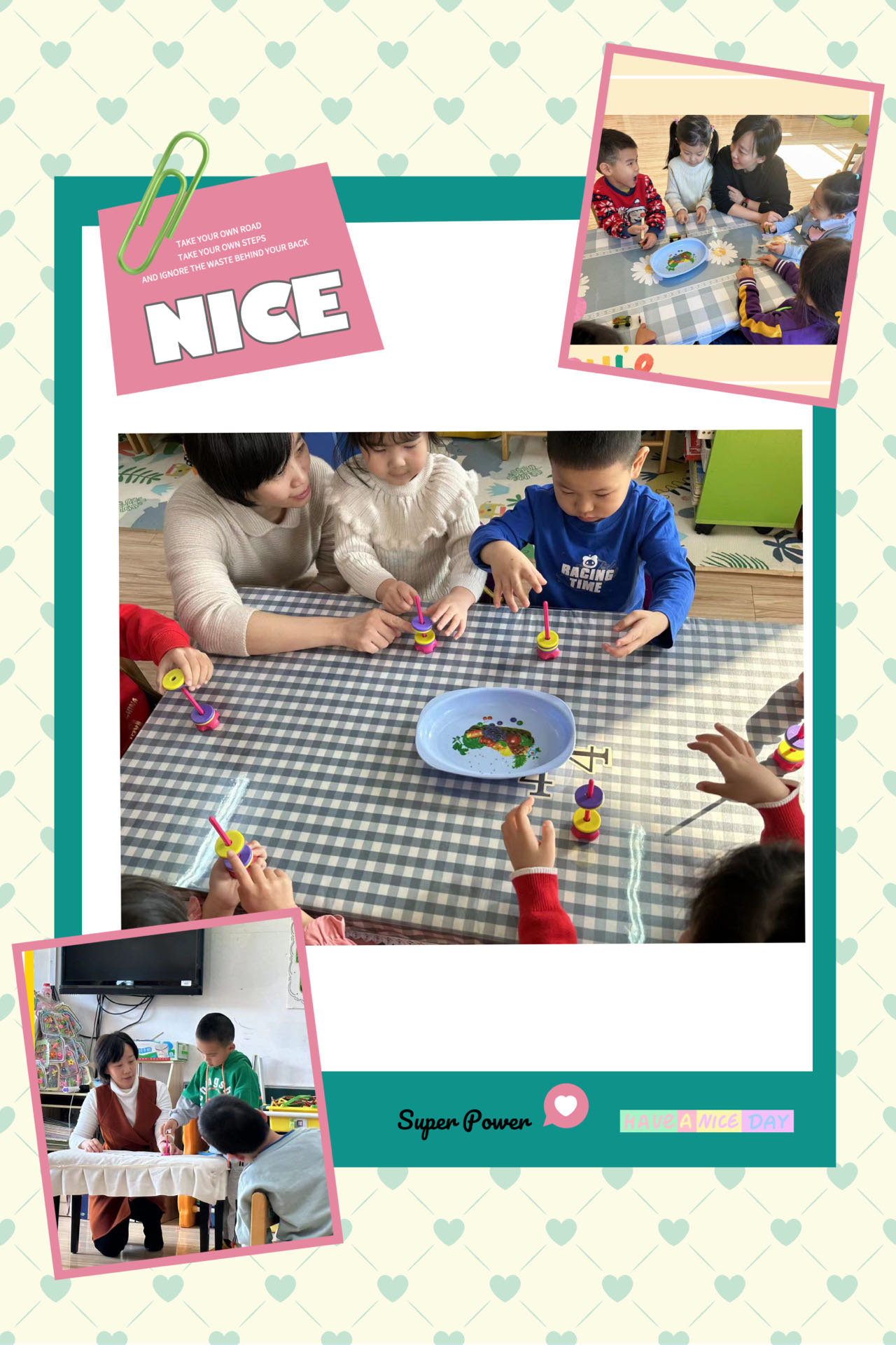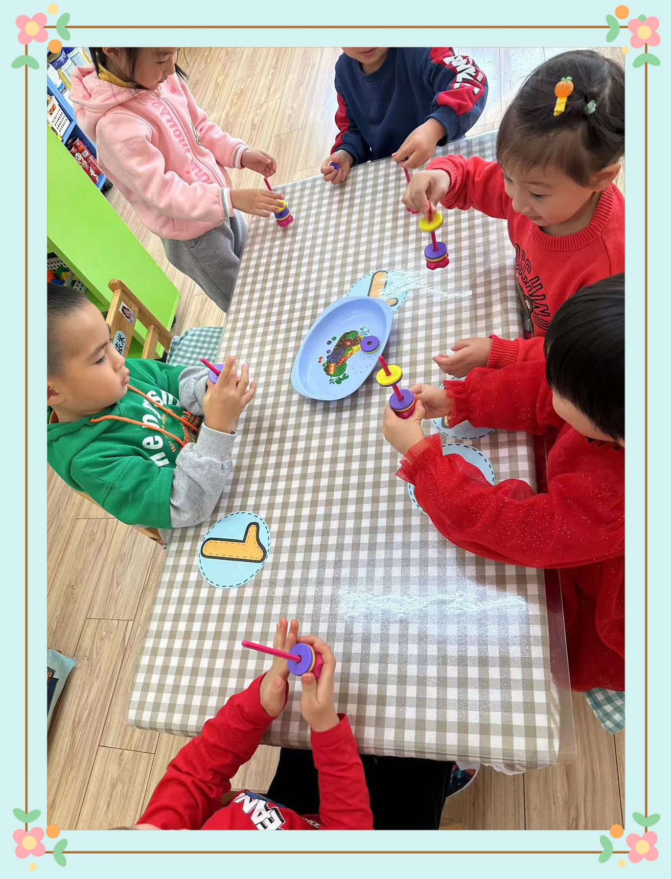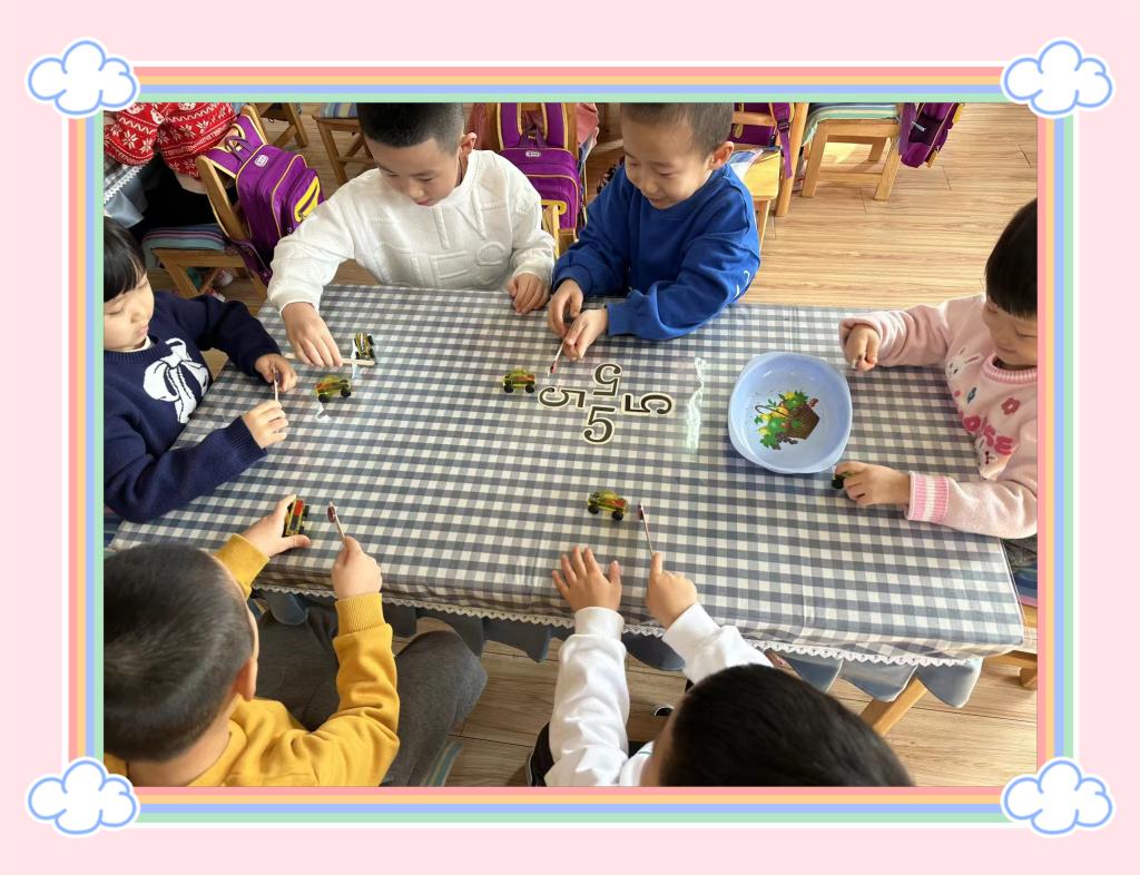 通过孩子们自主探索,他们发现了当两块环形磁铁同极(即南极和南极或北极和北极)接近时,就相互排斥,使得环形磁铁一直跳跳;当小车上的磁铁和指挥棒的磁铁同极同色,指挥棒不碰小车,它就会自己跑。