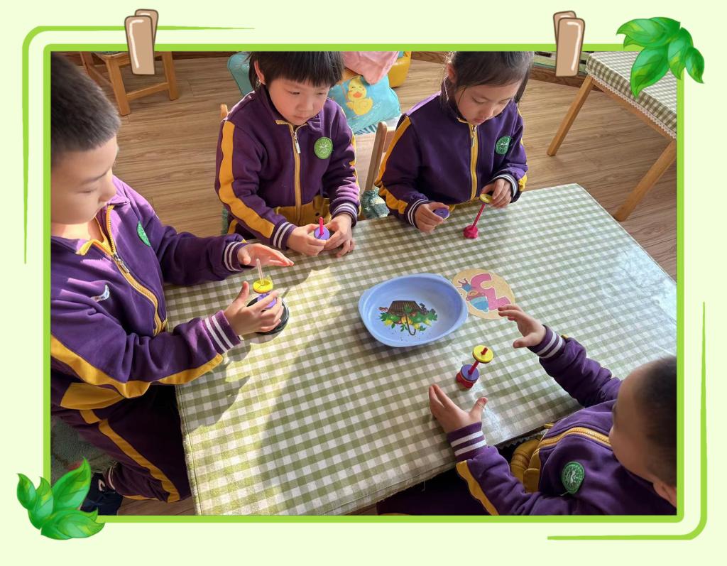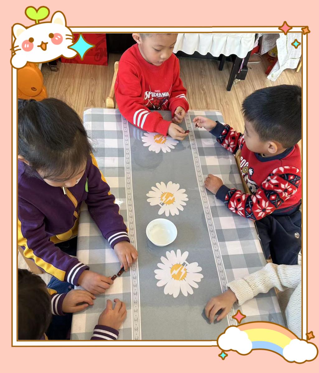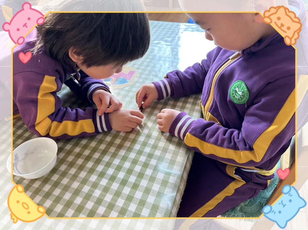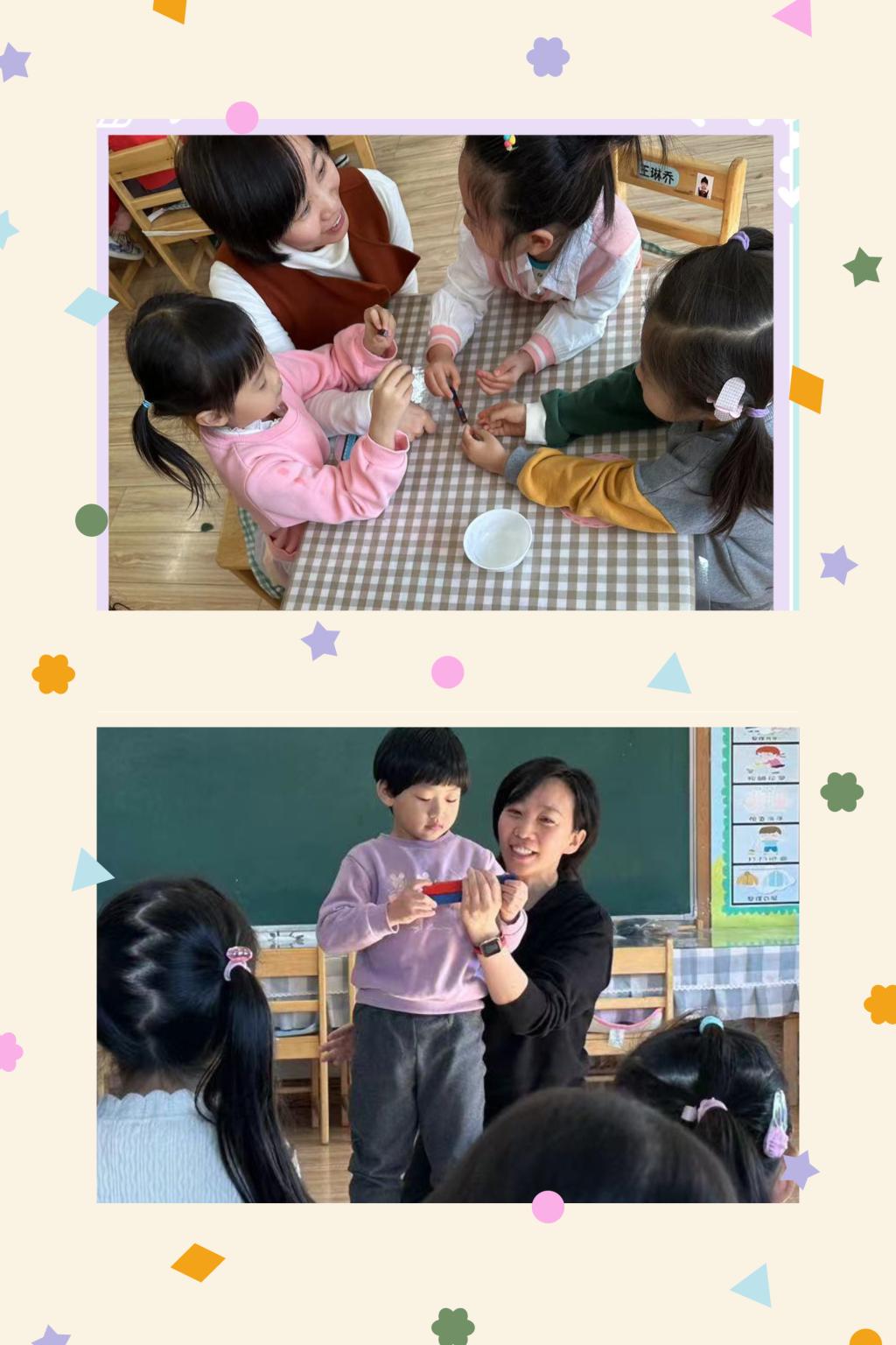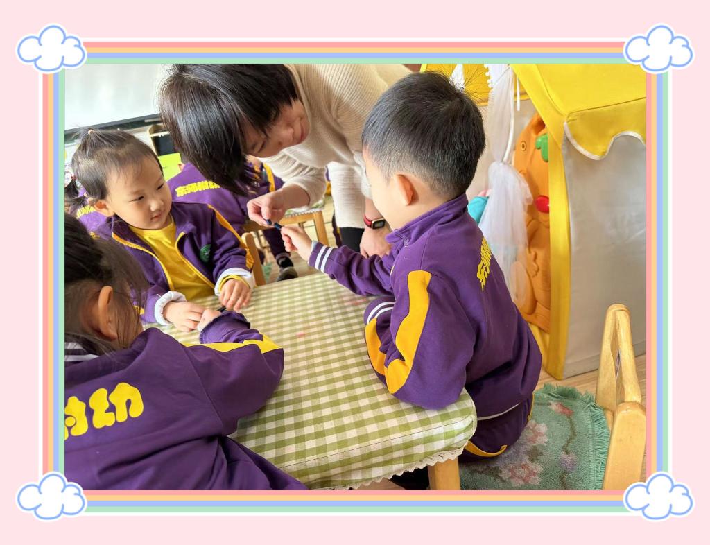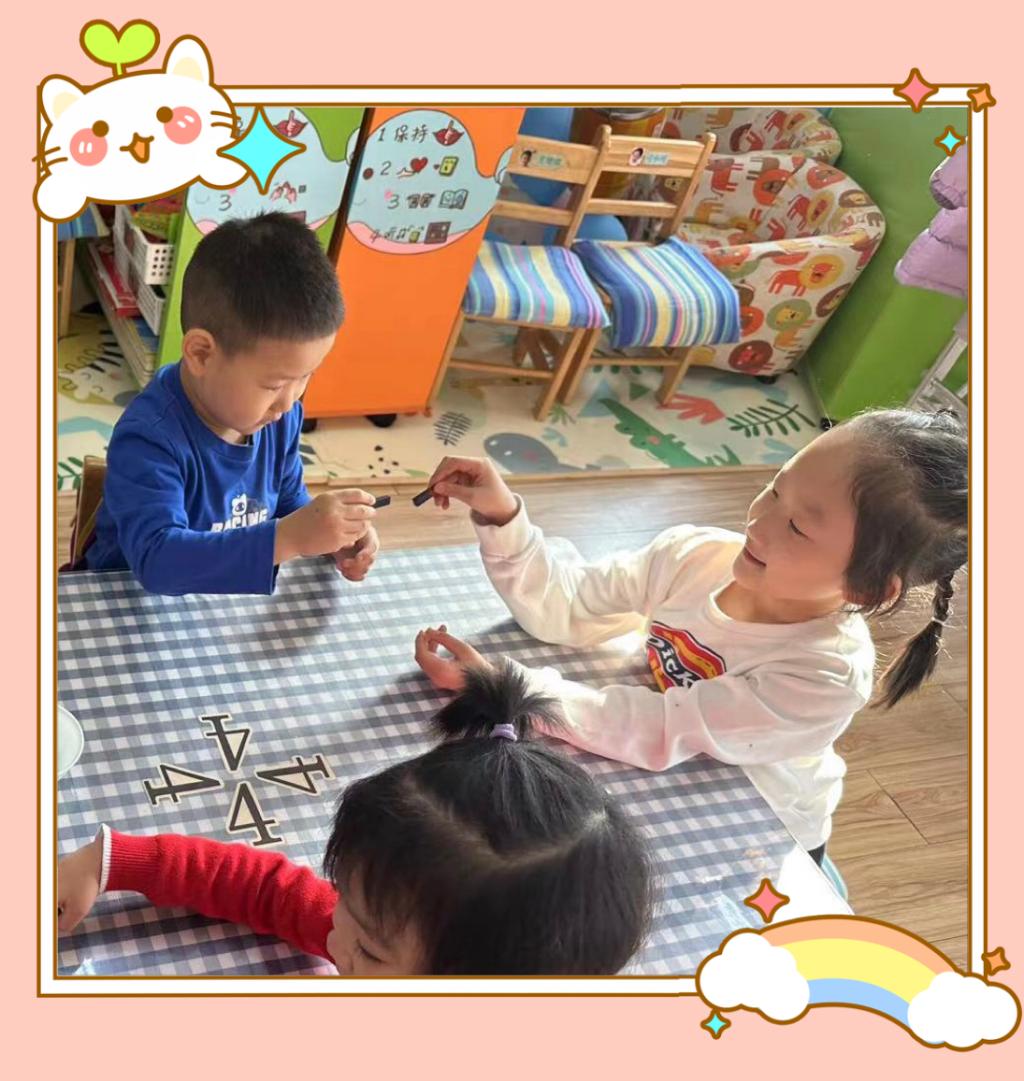 通过观察与动手操作体验,孩子们发现磁铁有两个磁极,分别称为北极(或N级)、南极(或S级),一般标注不同的两种颜色。当两块磁铁同极同色时,会相互排斥,不同极不同色时,则会相互吸引。