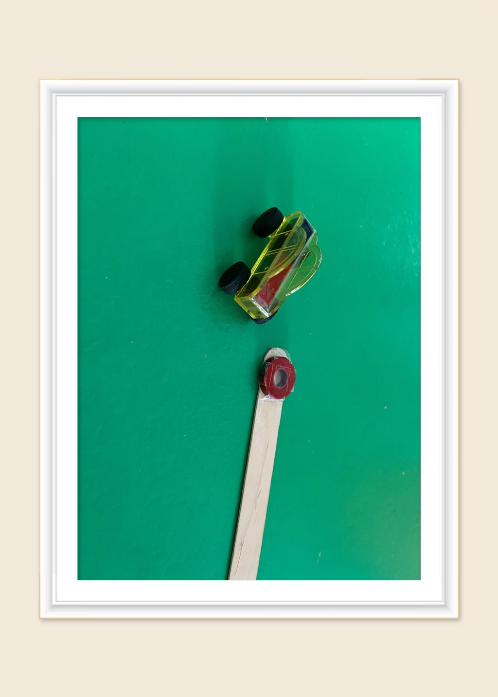 “我把一样颜色的磁铁对在一起,小车就跑。”
