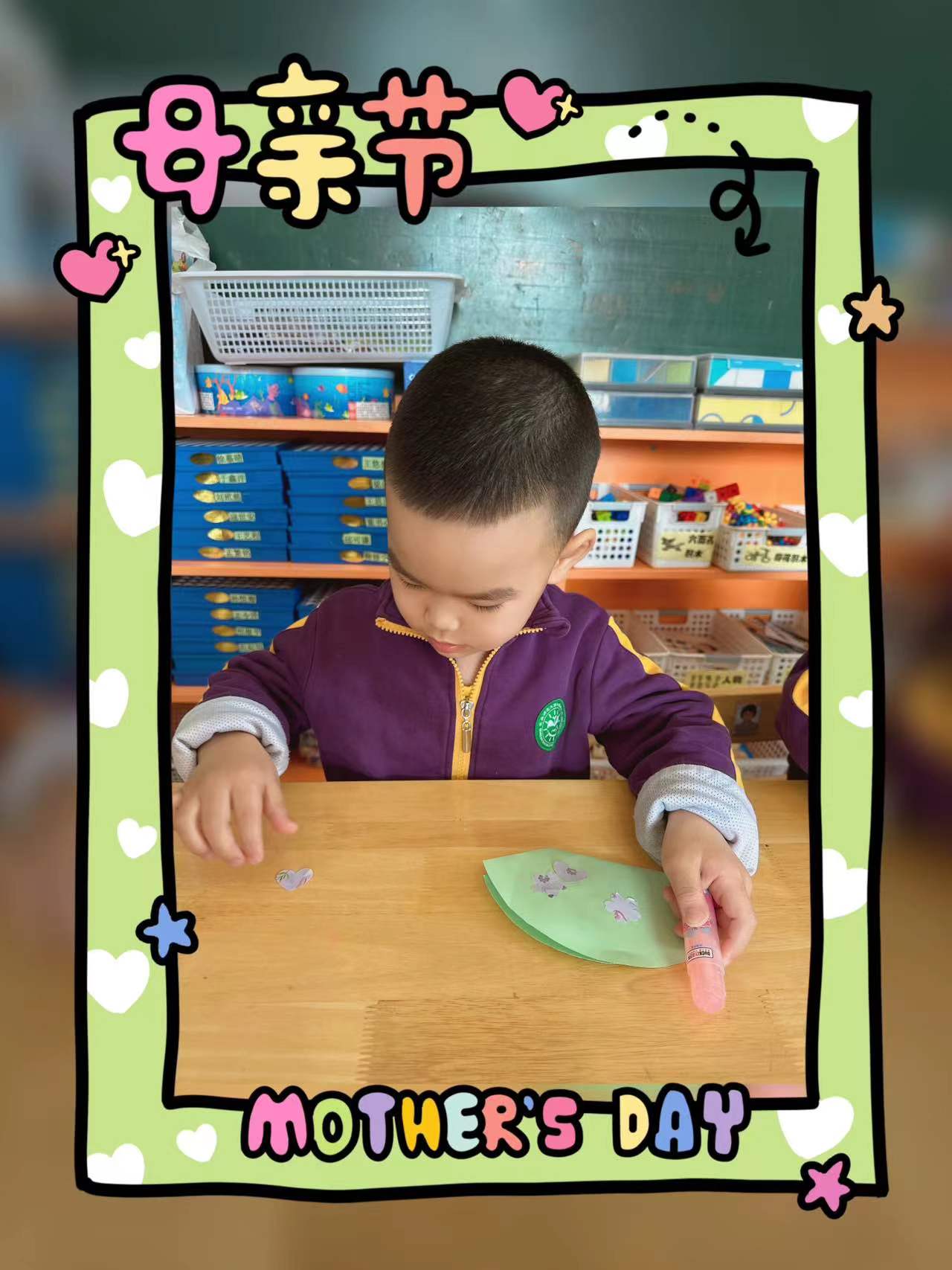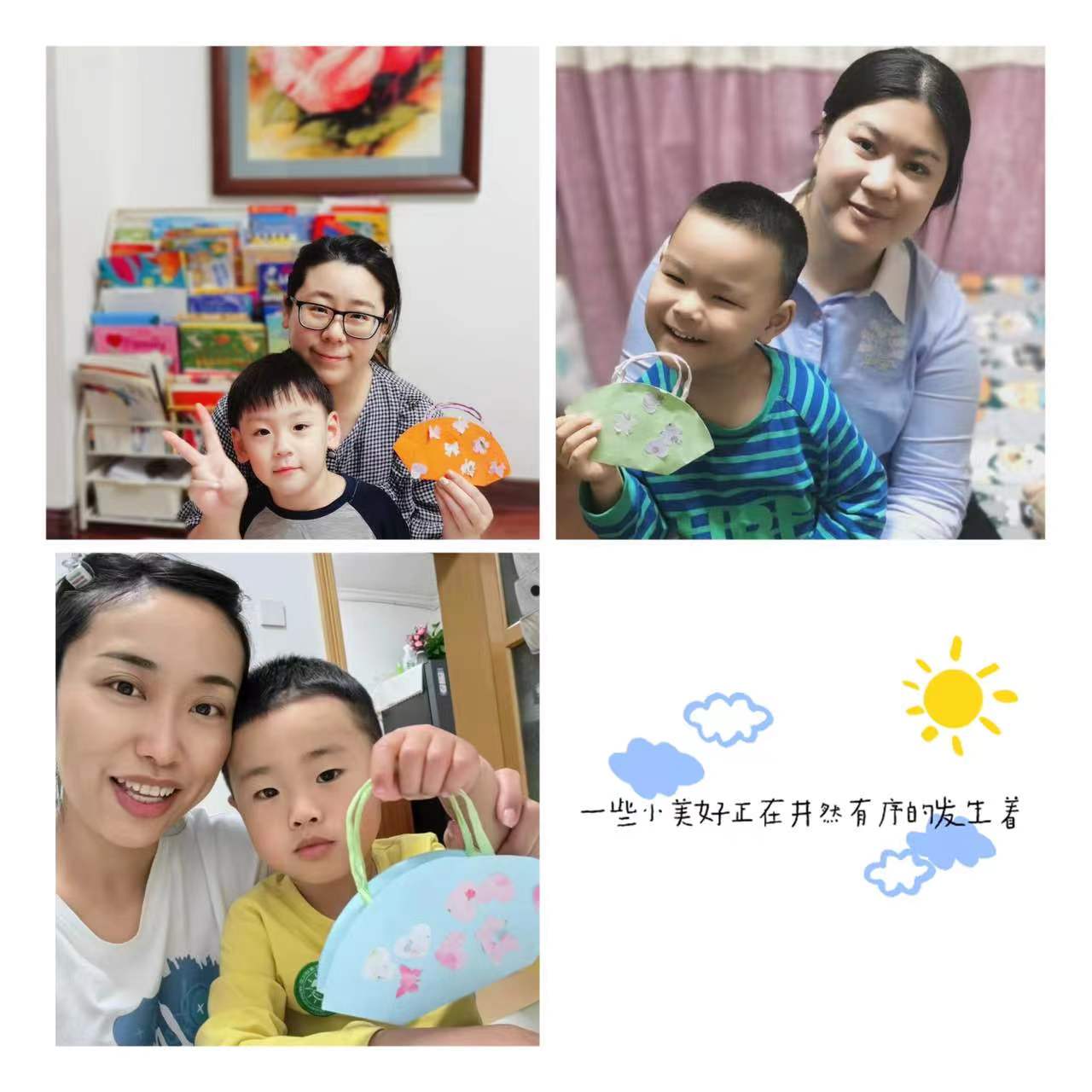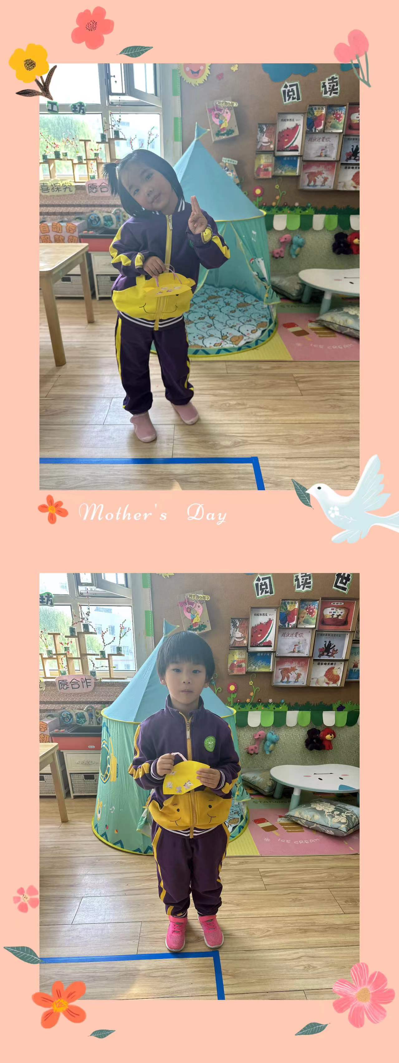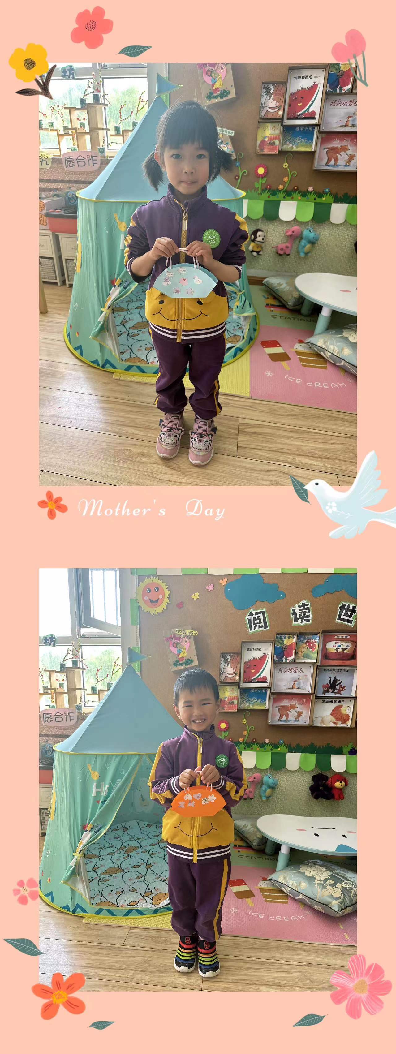 在这个特别的日子里,小朋友们用自己灵巧的小手为妈妈制作了一个漂亮的包包,送给最爱的妈妈。