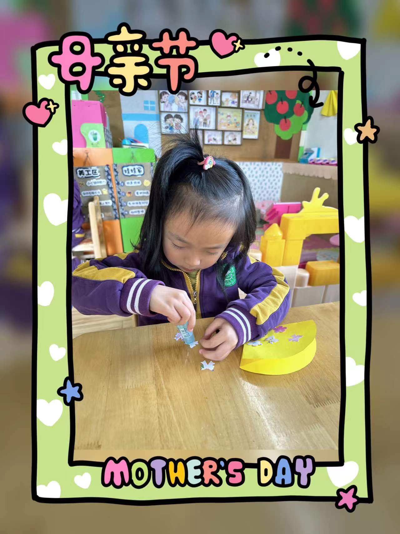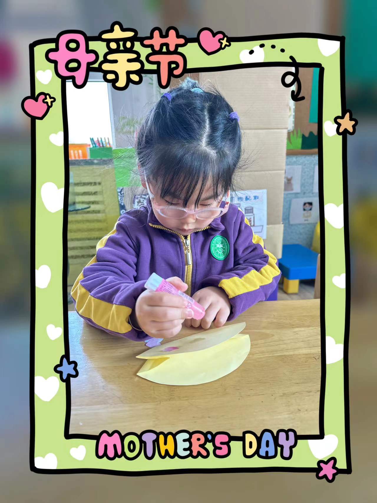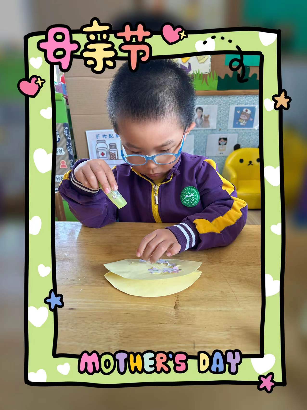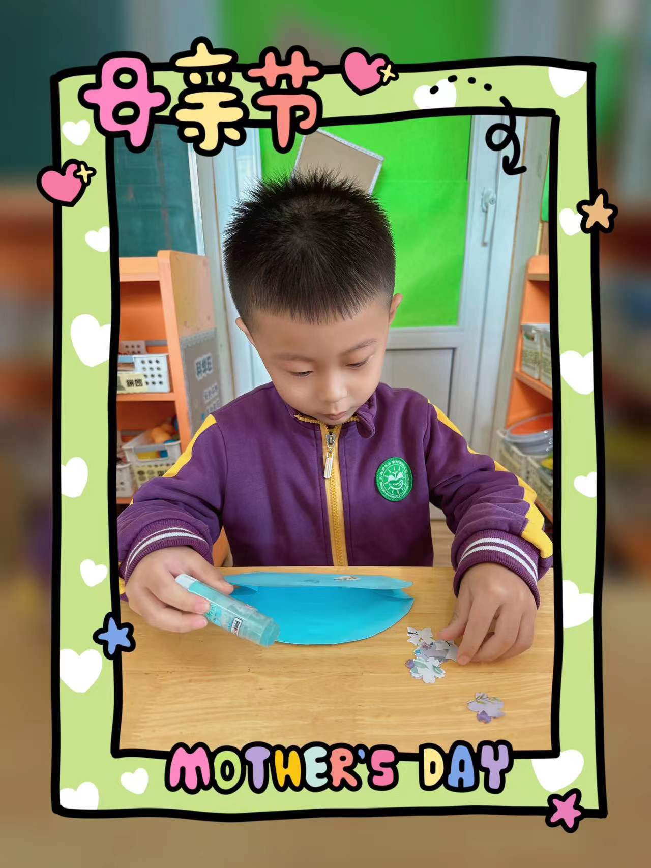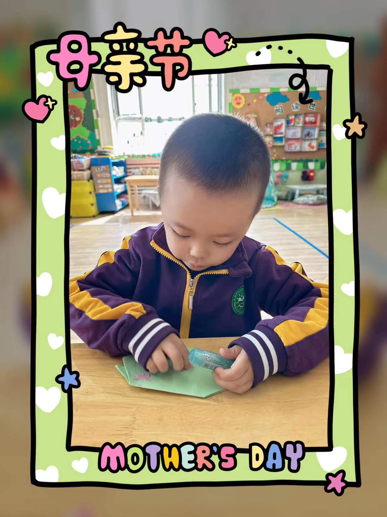 在这个特别的日子里,小朋友们用自己灵巧的小手为妈妈制作了一个漂亮的包包,送给最爱的妈妈。