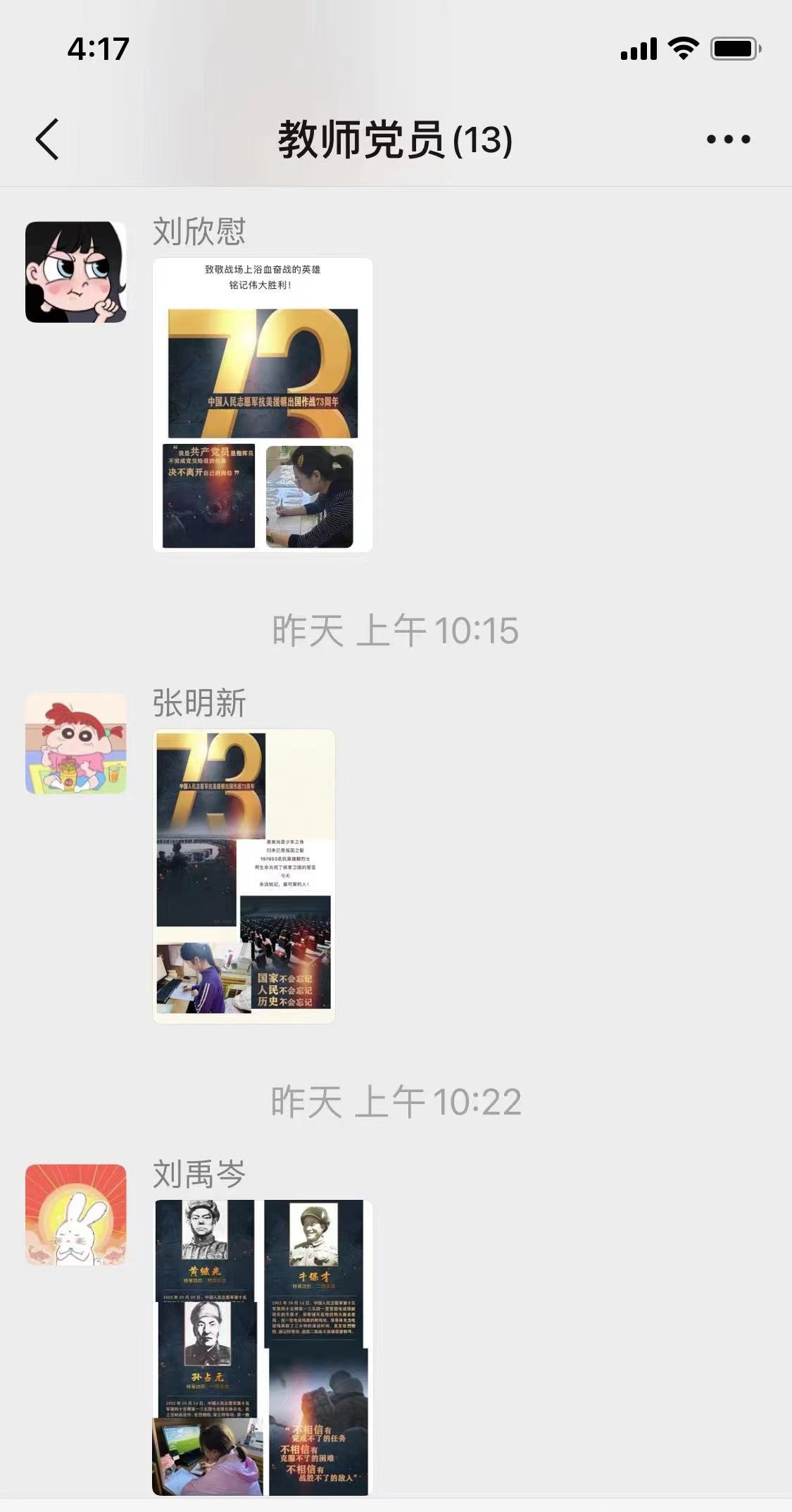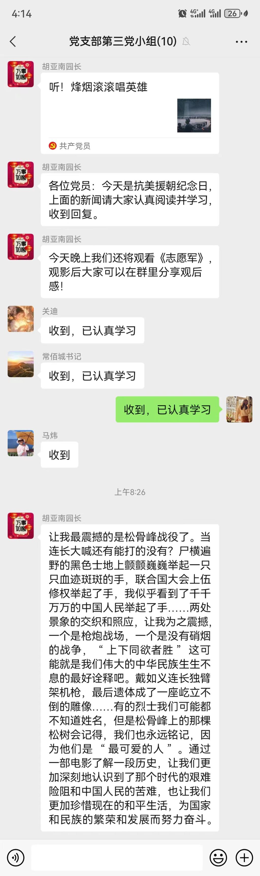 习近平总书记强调:“抗美援朝战争锻造形成的伟大抗美援朝精神,是弥足珍贵的精神财富,必将激励中国人民和中华民族克服一切艰难险阻、战胜一切强大敌人。”党支部组织全体党员在抗美援朝纪念日通过线上工作群再次重温抗美援朝的历史和烈士们用生命兑现保家卫国誓言的英勇事迹,向战场上浴血奋战的英雄致敬,也铭记抗美援朝的伟大胜利!