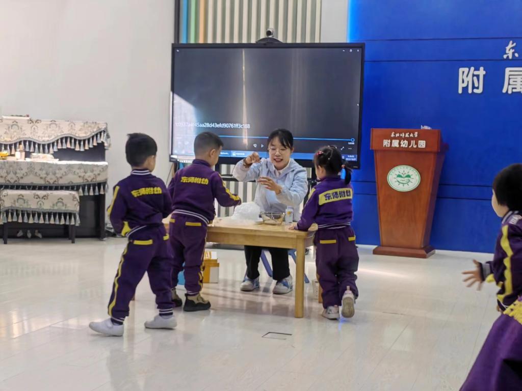 好奇是孩子们的天性,动手操作的探究活动既能满足孩子们的好奇心,也能满足孩子的求知欲望。苗苗二班邀请了晨晨小朋友的妈妈——东北师范大学化学学院的江秀梅老师,带来趣味魔法泡泡游戏。在游戏中孩子们了解了泡泡的形成,也通过干冰实验直观的看到泡泡变大的过程。
